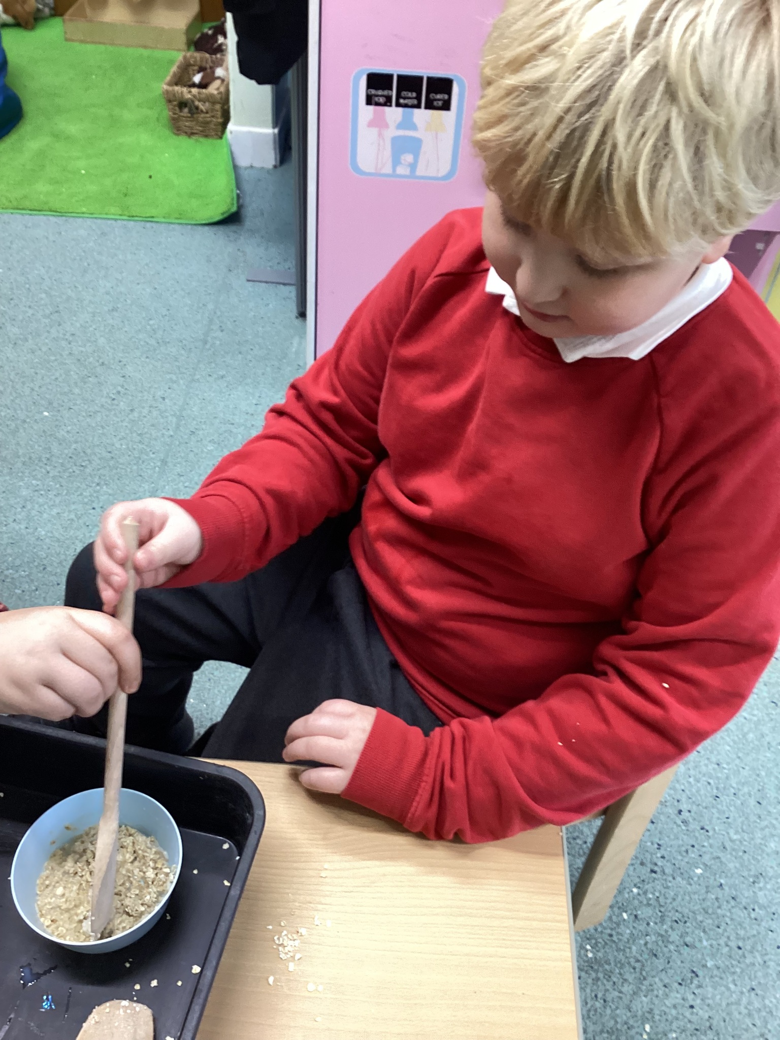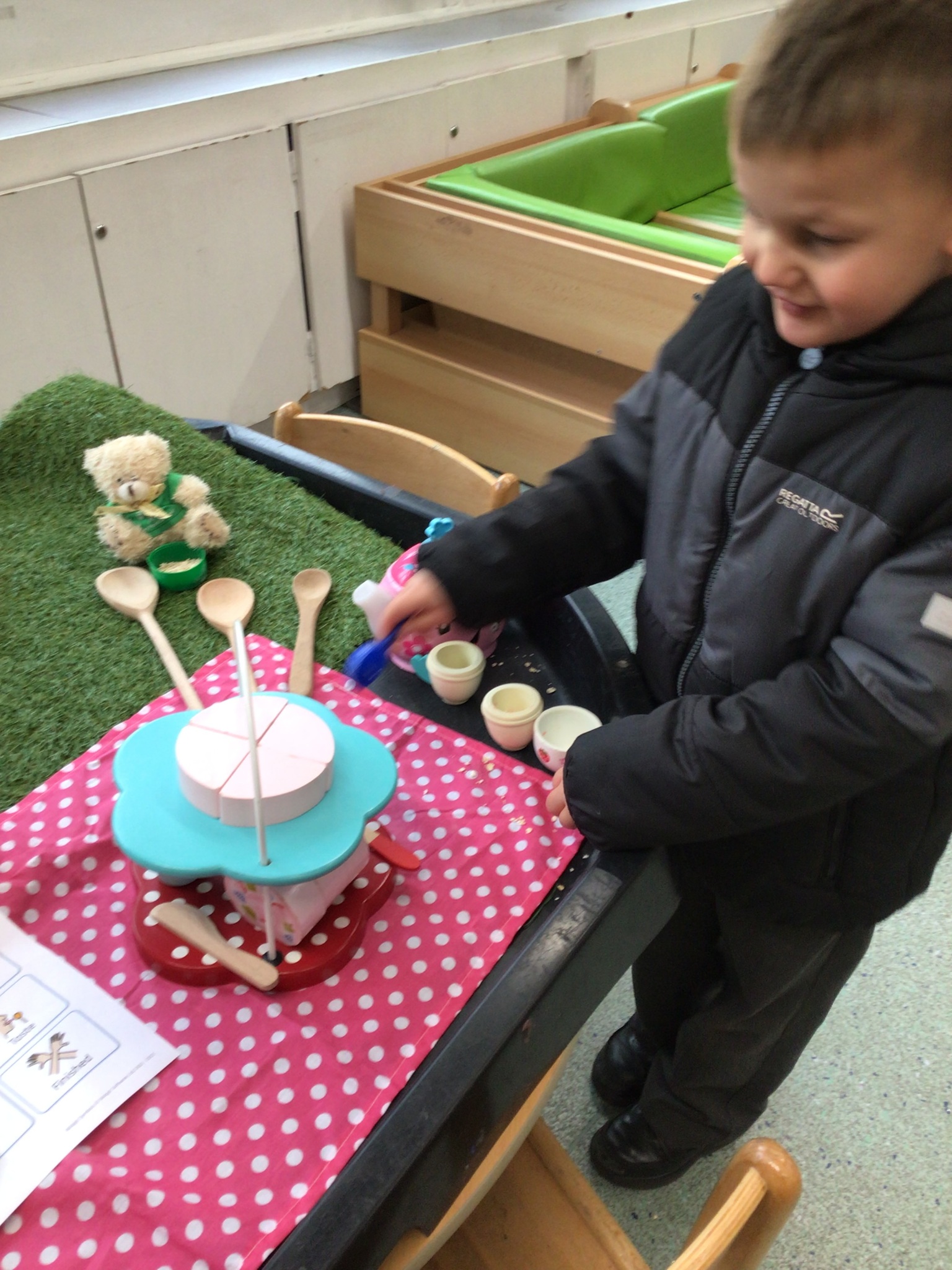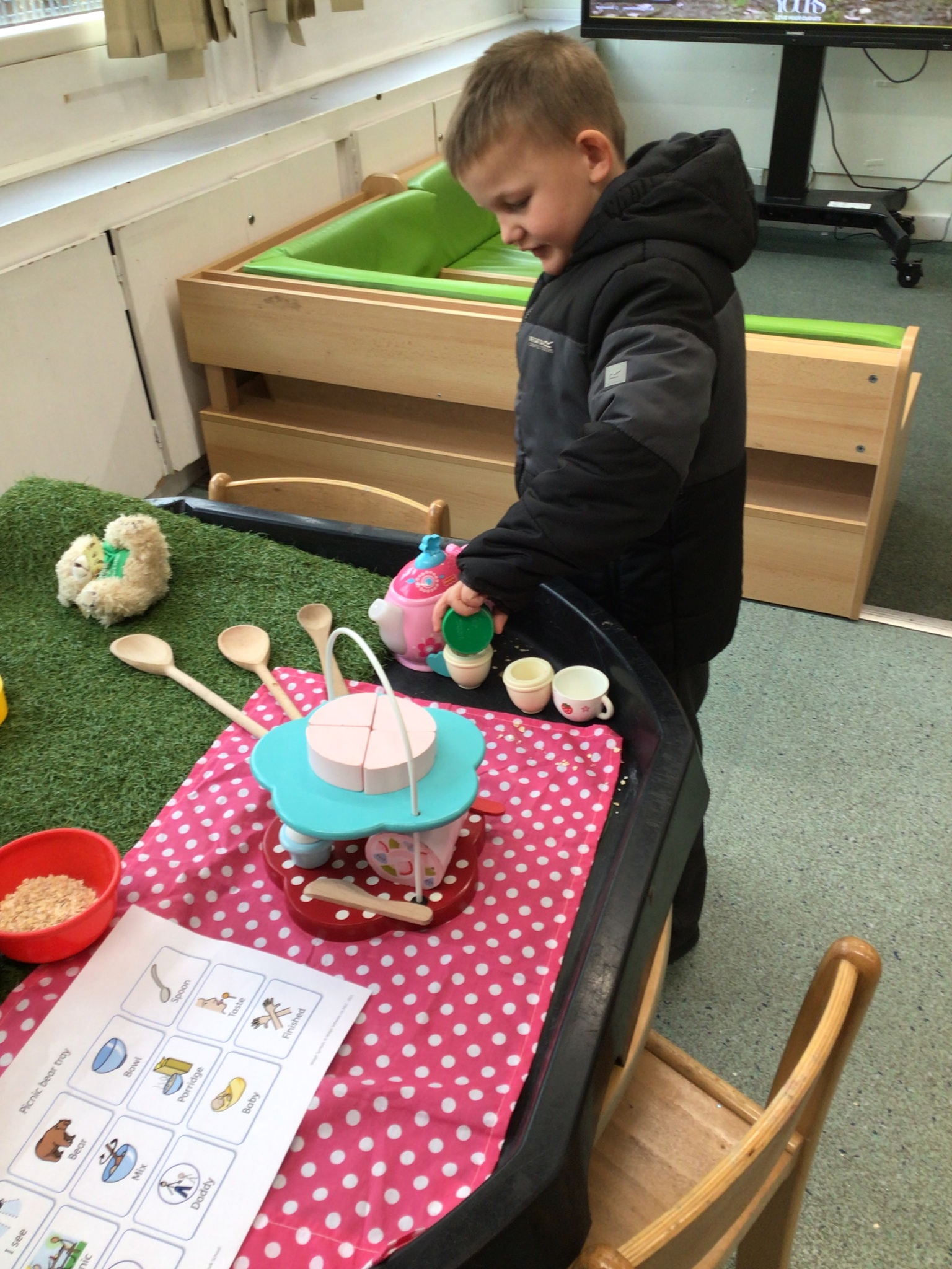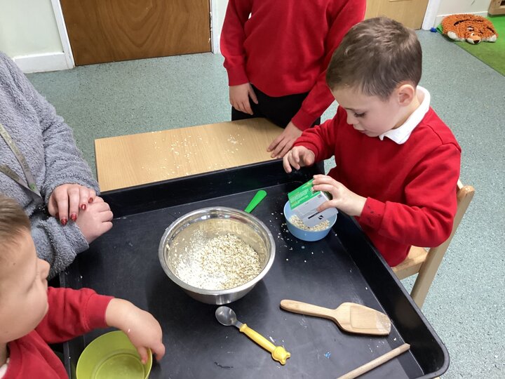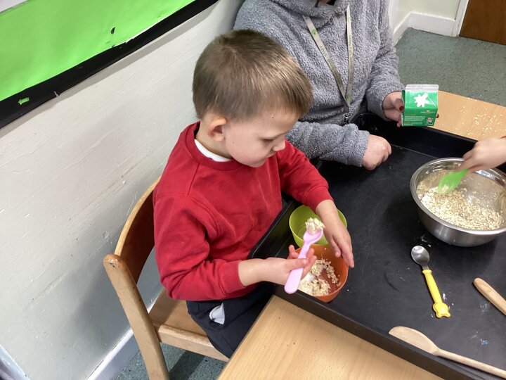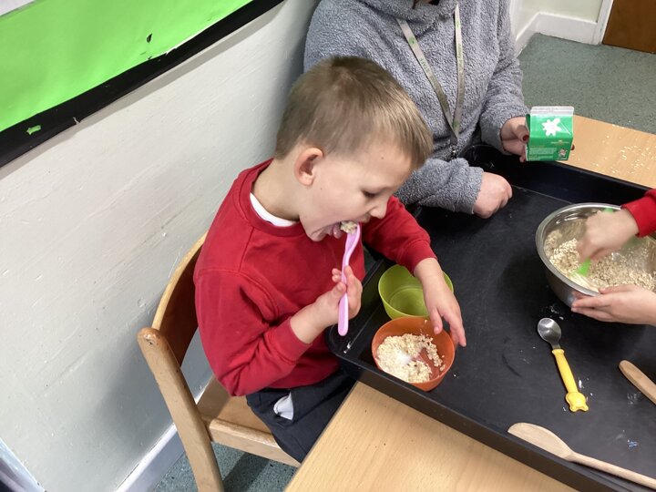 During adult led activities, we made yummy porridge. We poured in the oats, milk, mixed it up and then put it into the microwave. Some of us just had a smell whilst others had a taste. We also made playdoh bears, had a teddy bears picnic and sang the Goldilocks song.