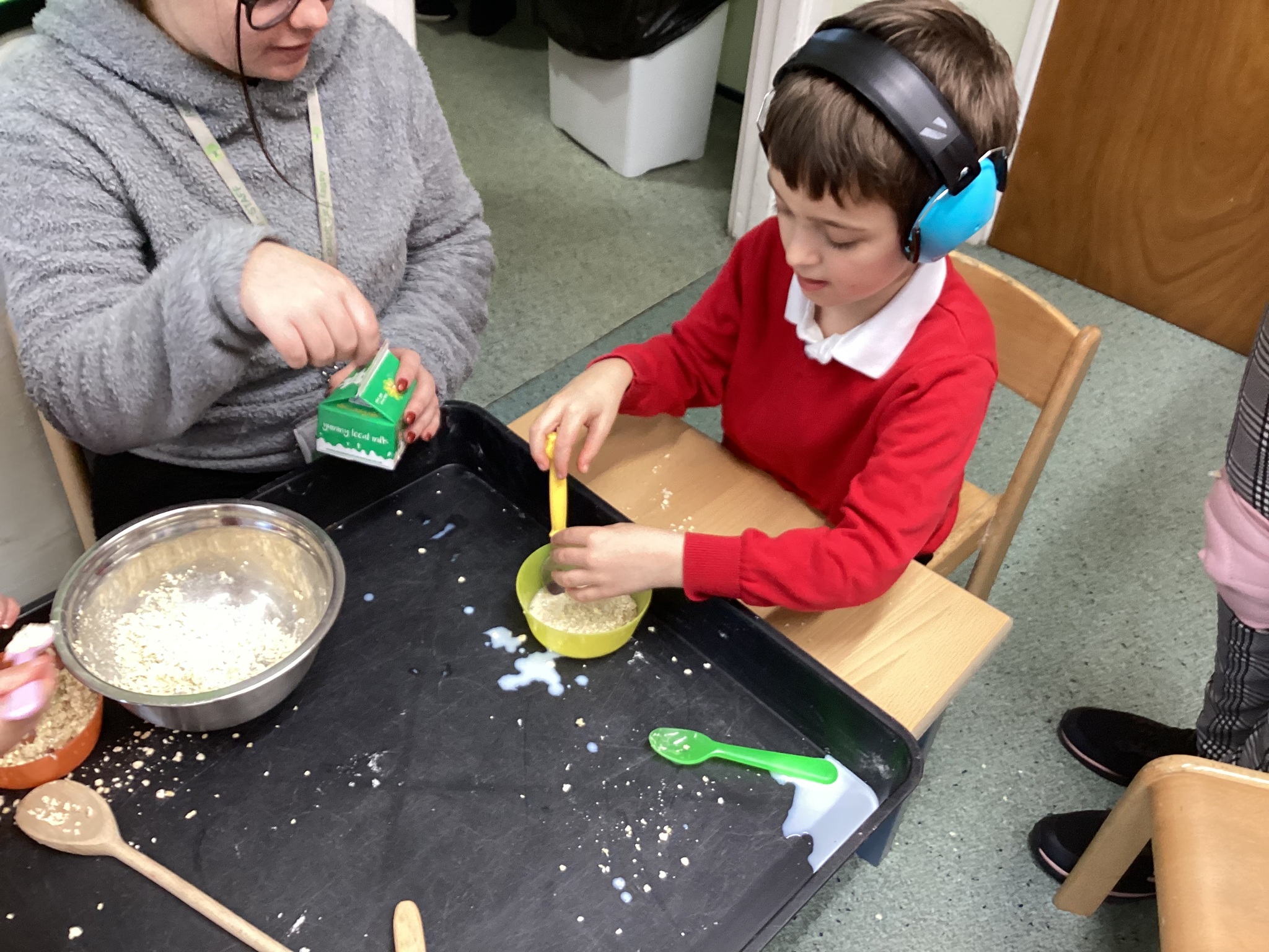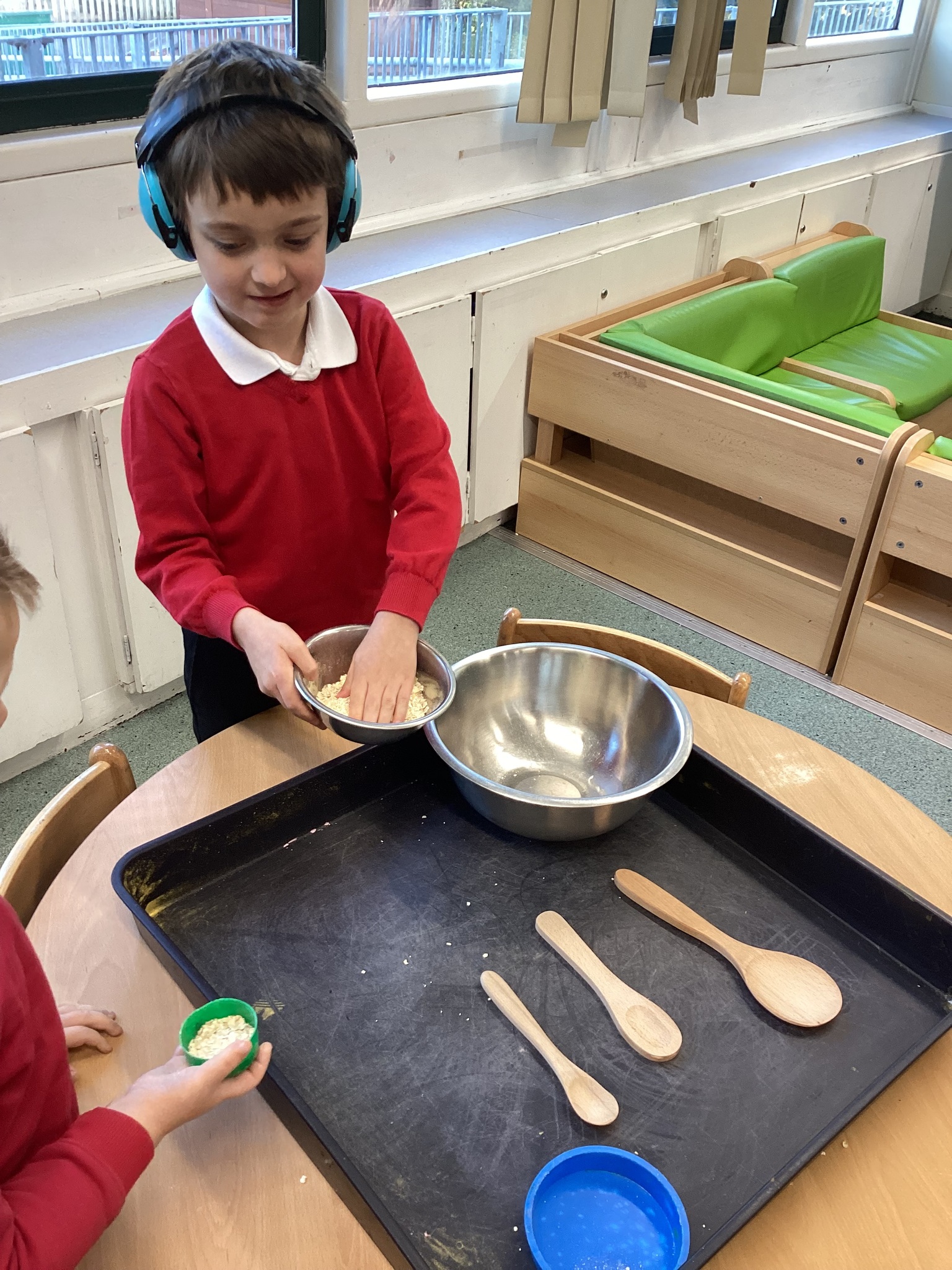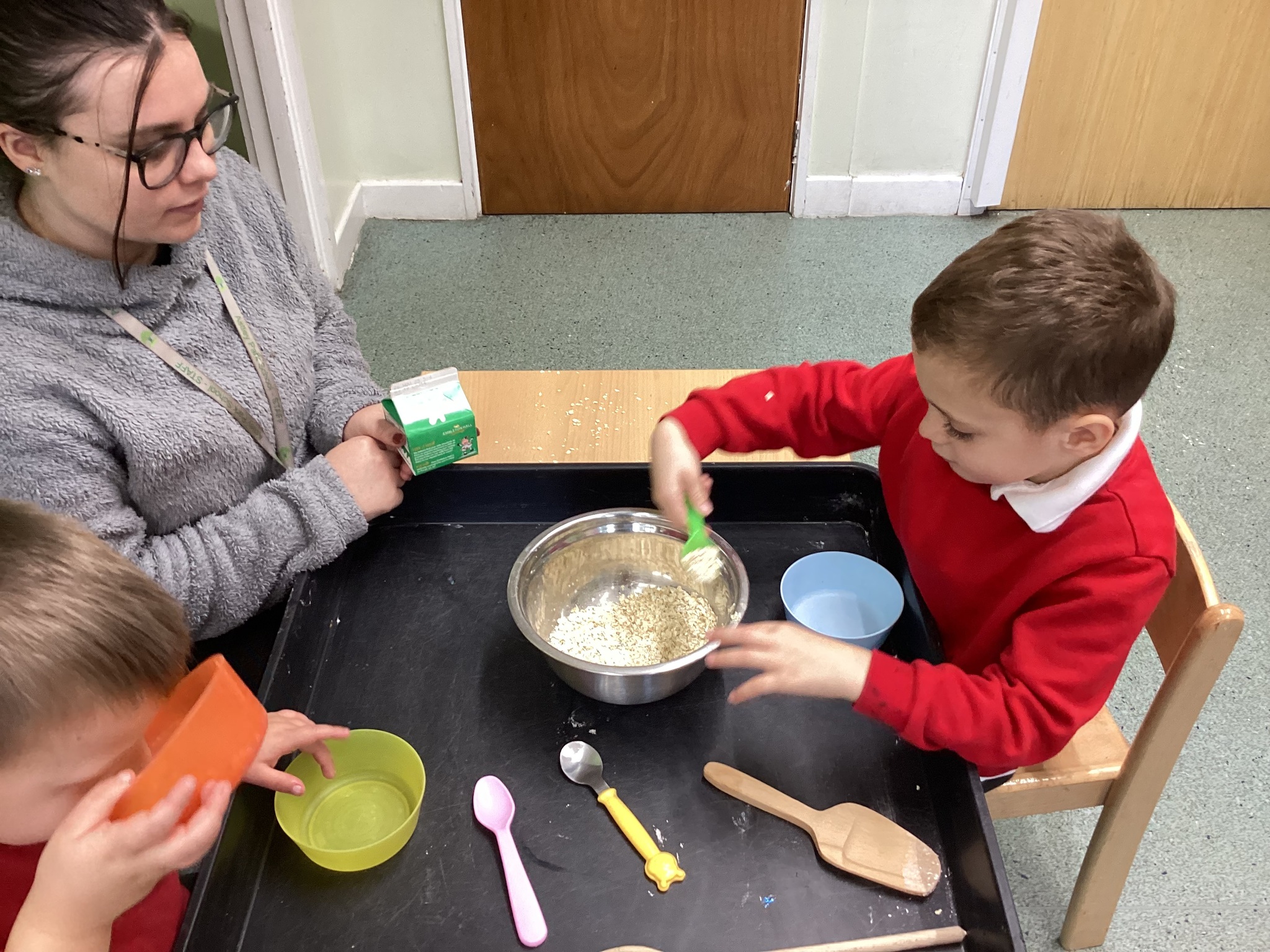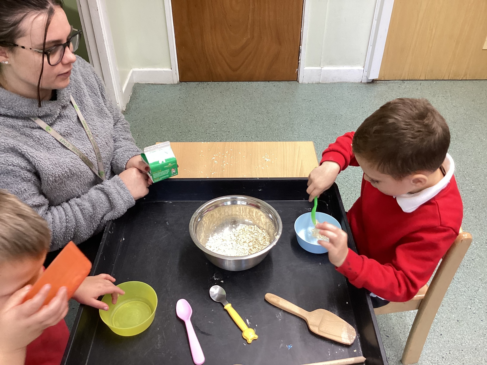 During adult led activities, we made yummy porridge. We poured in the oats, milk, mixed it up and then put it into the microwave. Some of us just had a smell whilst others had a taste. We also made playdoh bears, had a teddy bears picnic and sang the Goldilocks song.