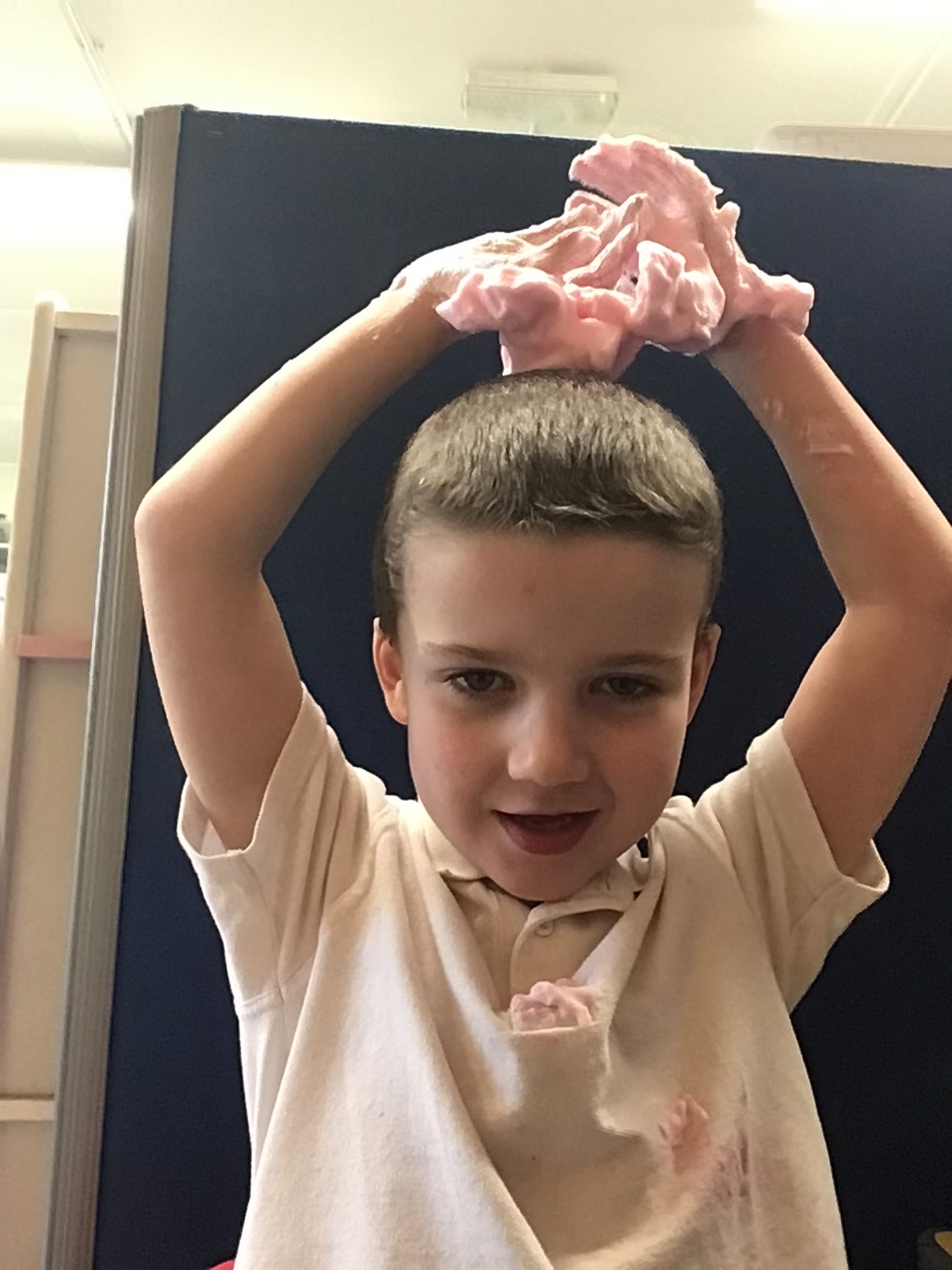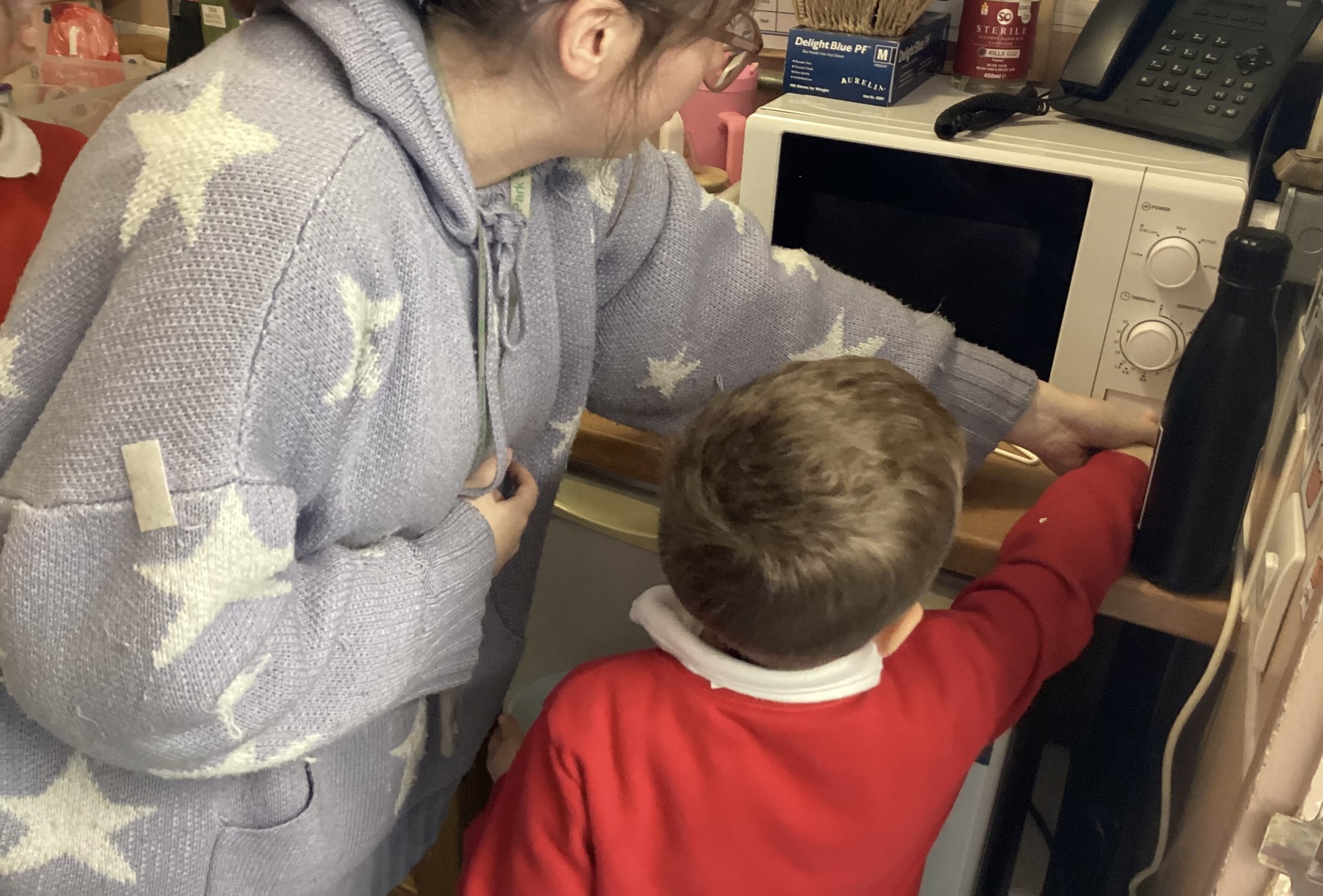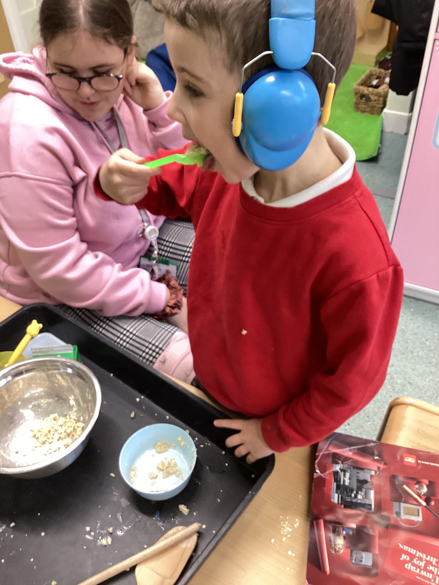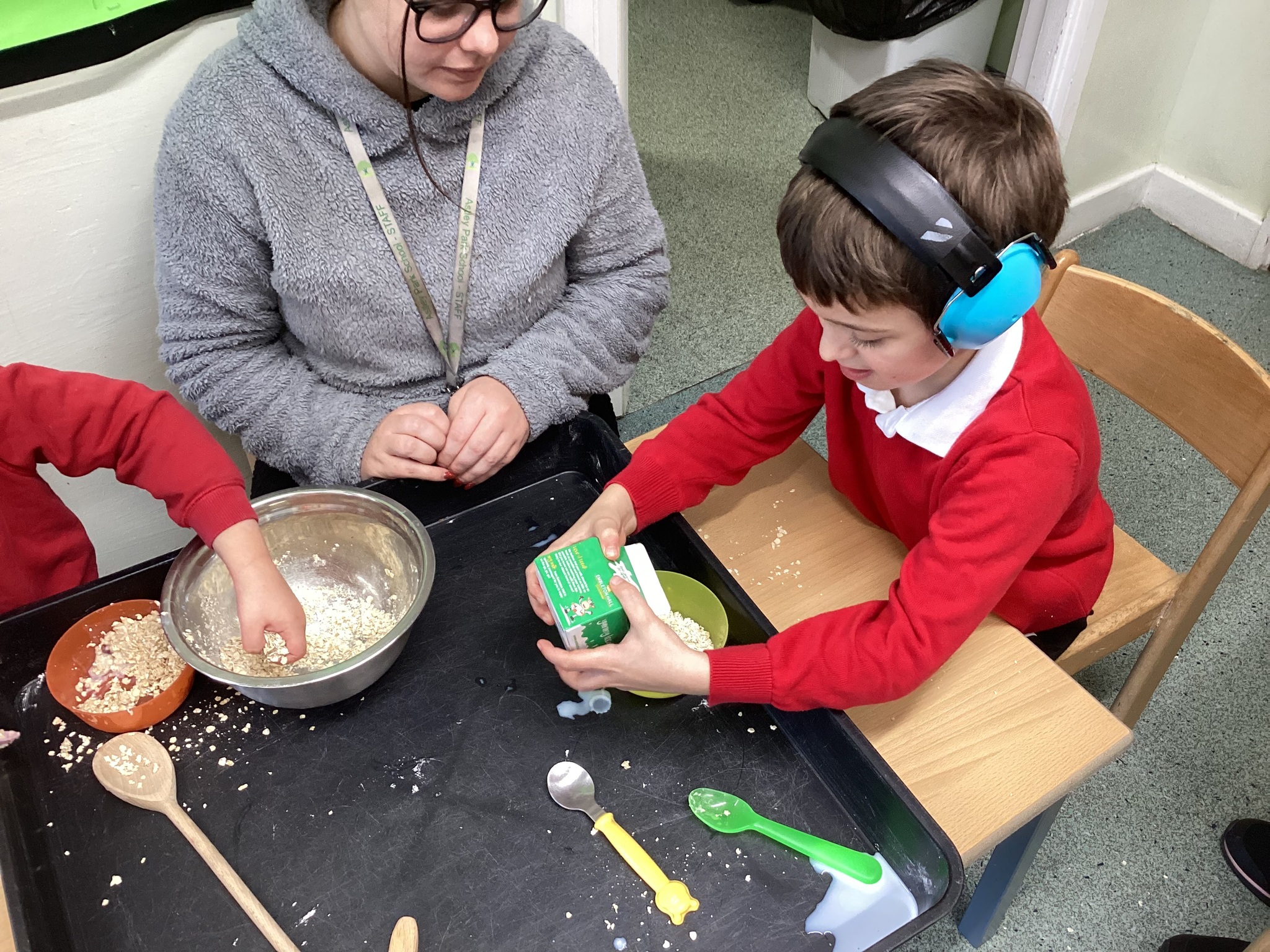 During adult led activities, we made yummy porridge. We poured in the oats, milk, mixed it up and then put it into the microwave. Some of us just had a smell whilst others had a taste. We also made playdoh bears, had a teddy bears picnic and sang the Goldilocks song.
