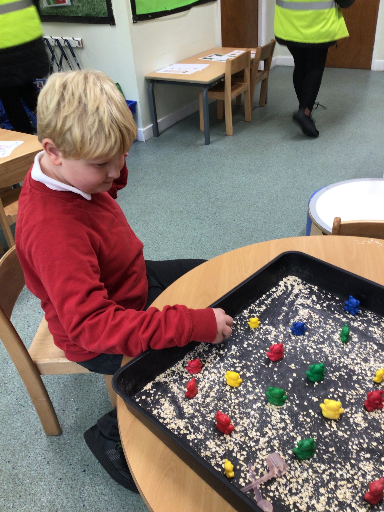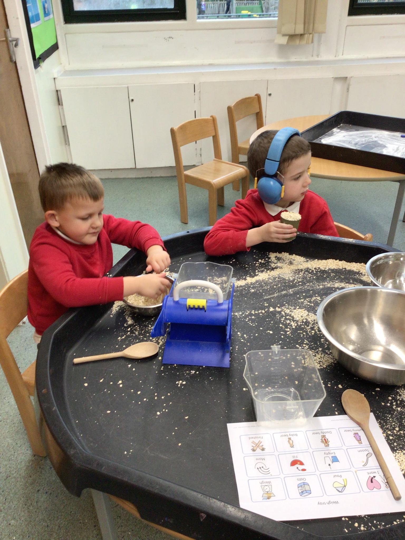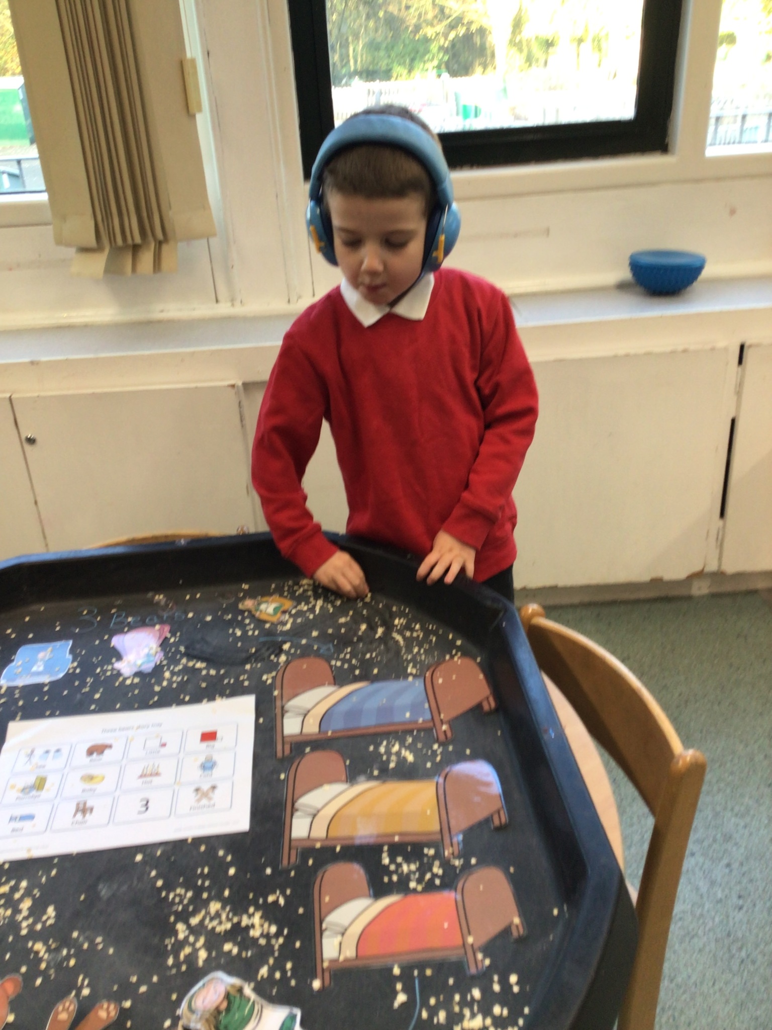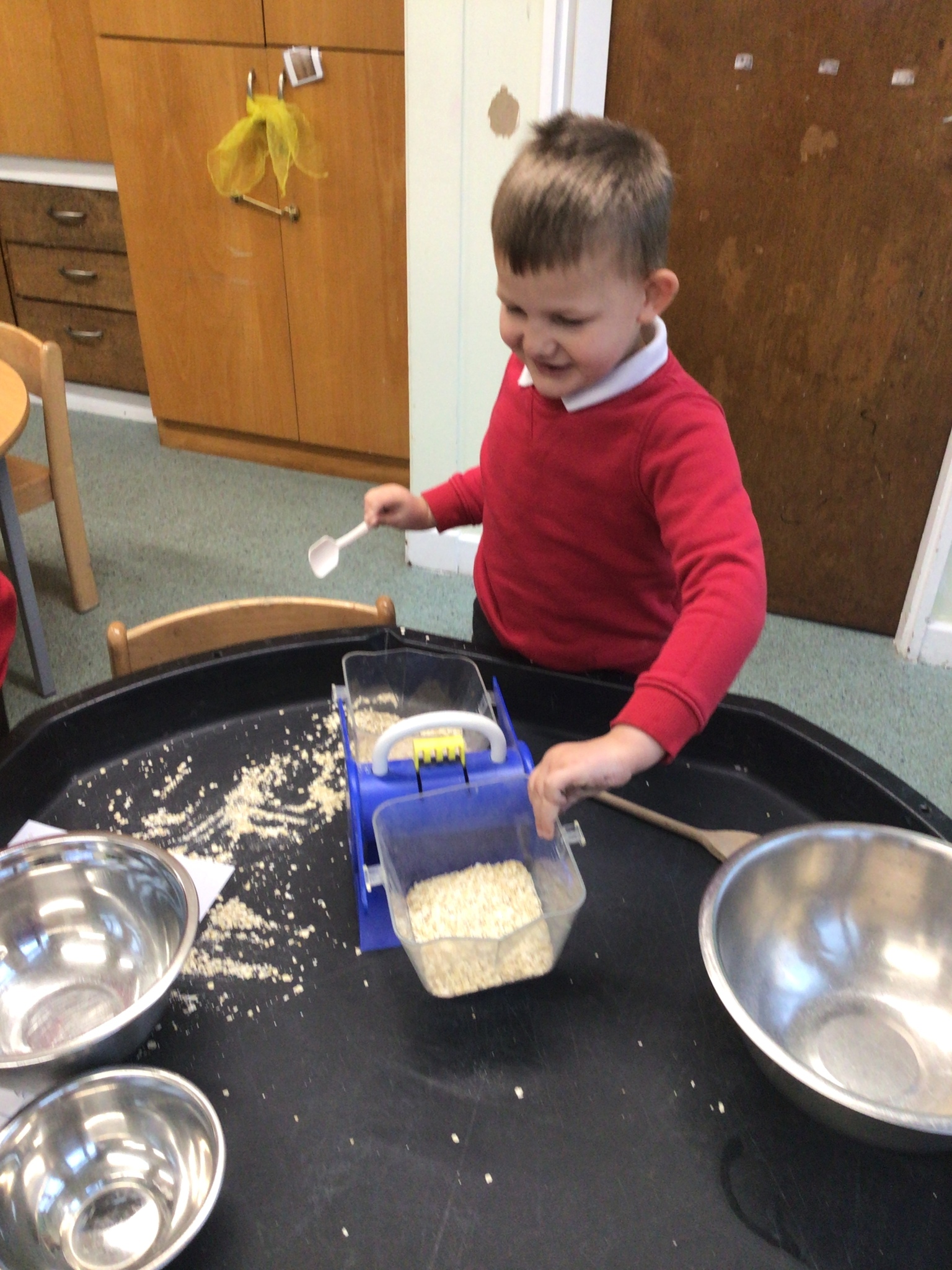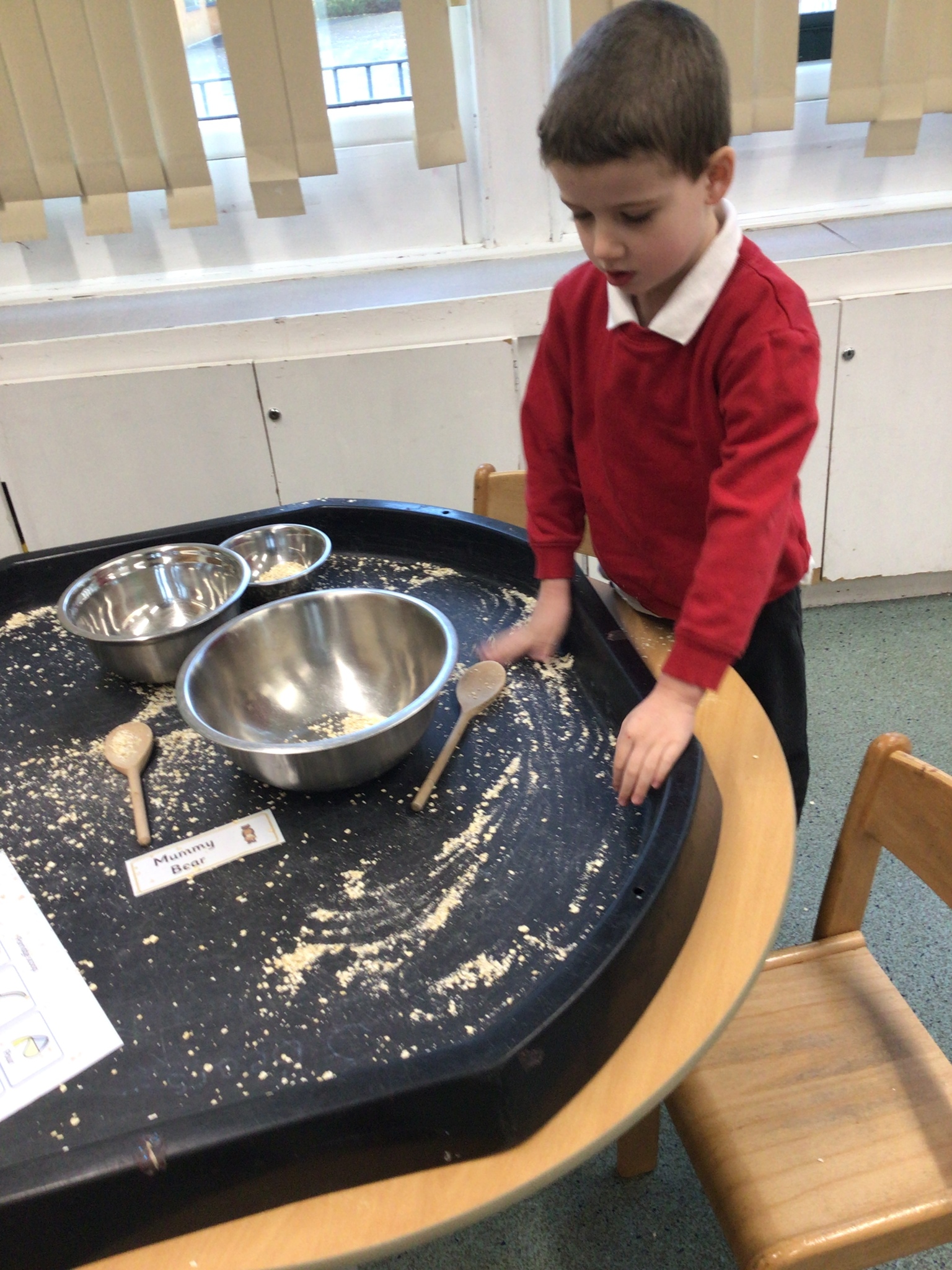 Another busy week in Beech class! This week we have continued to explore Goldilocks and the three bears. We enjoyed playing with oats, feeding the bears and retelling the story. During adult led activities we made more porridge, made marks with bear prints and created a bear face using paper plates.