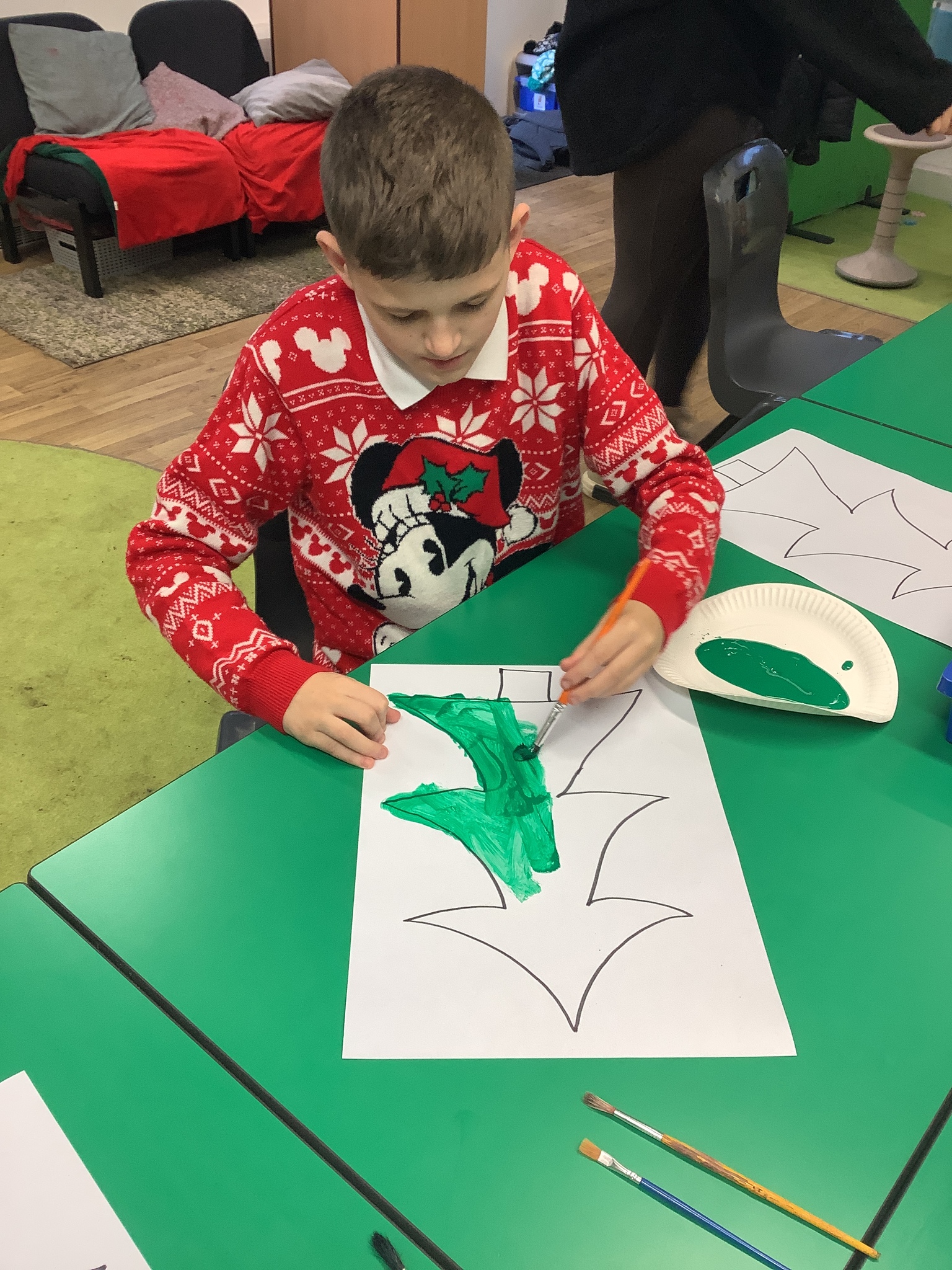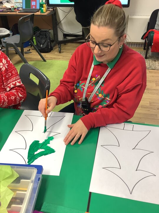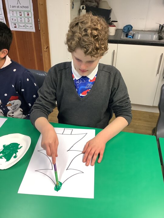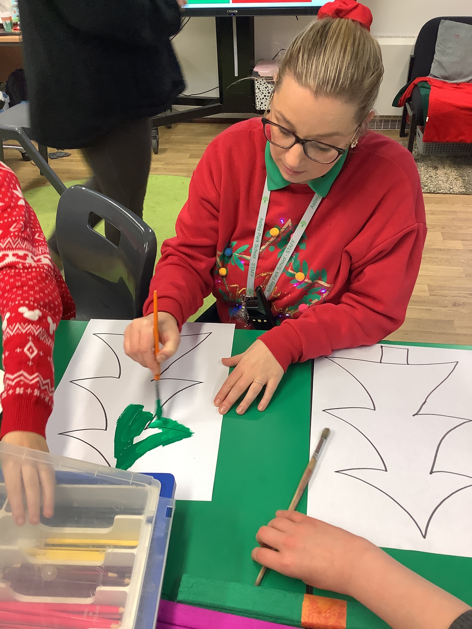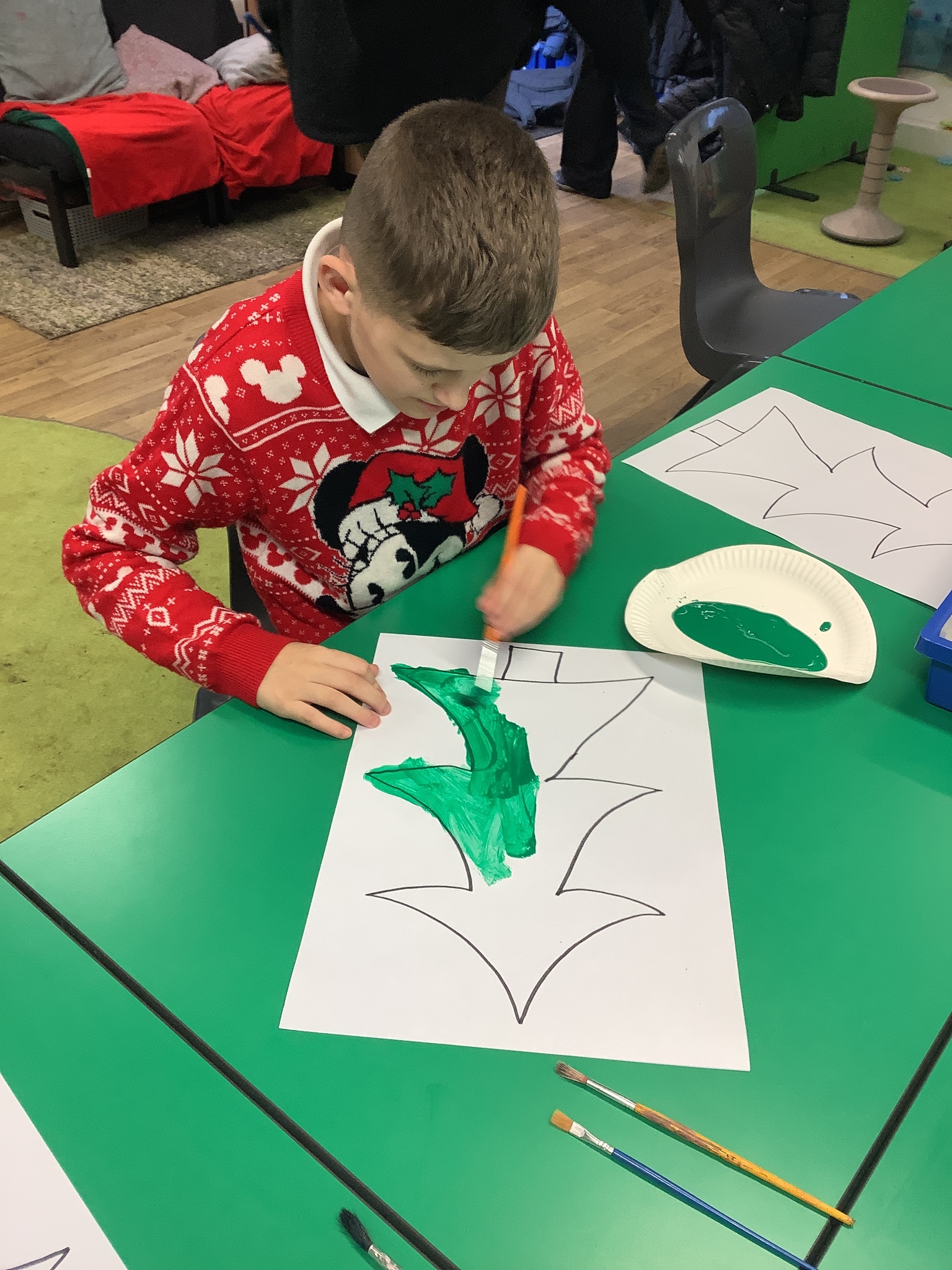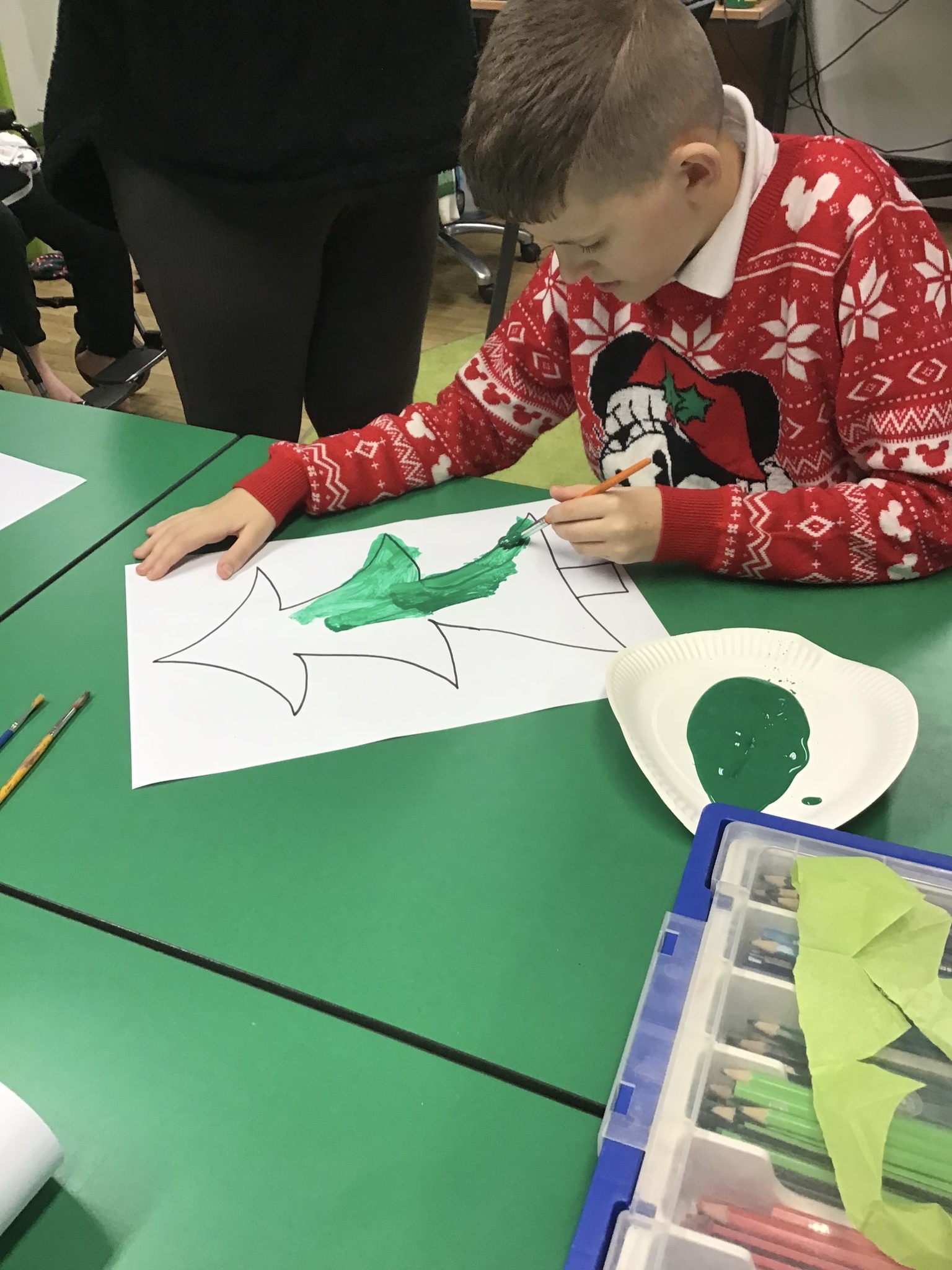 As Primary were having their Christmas Dinner in the hall on Thursday we had a buffet in class, and in the afternoon we painted Christmas Trees to decorate our classroom with, both staff and pupils enjoyed painting a Christmas Tree! We also had a number of fantastic Christmas jumpers on display!