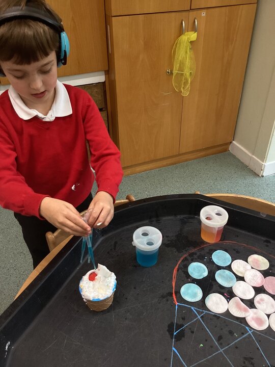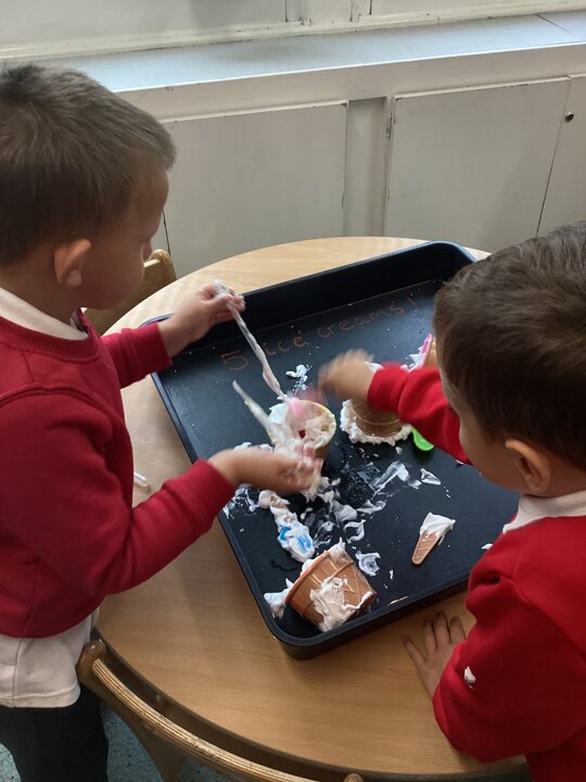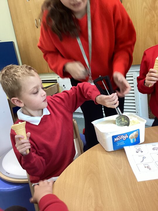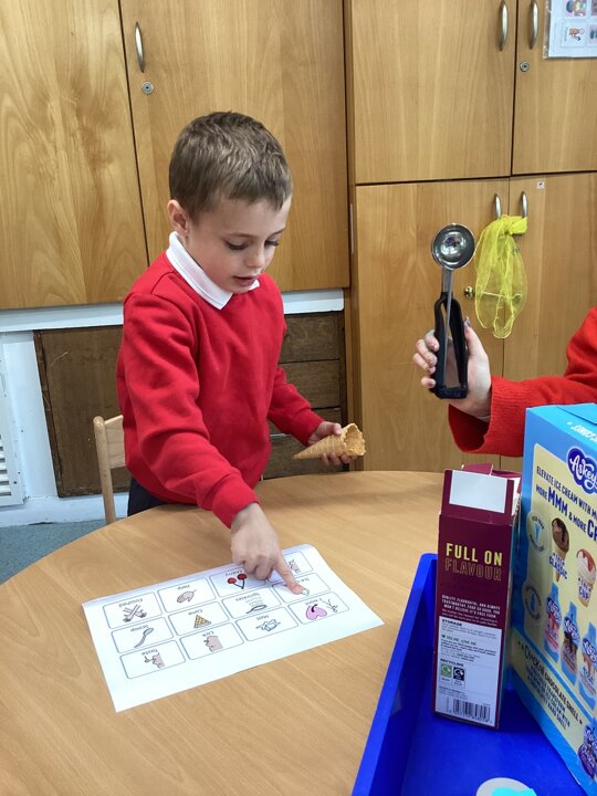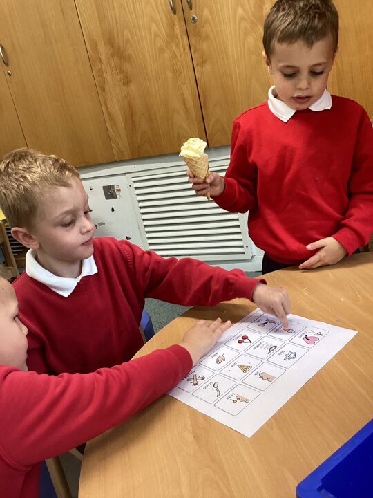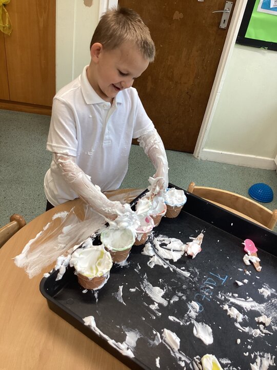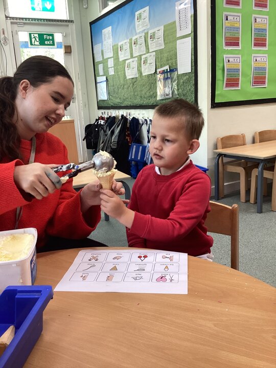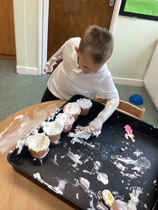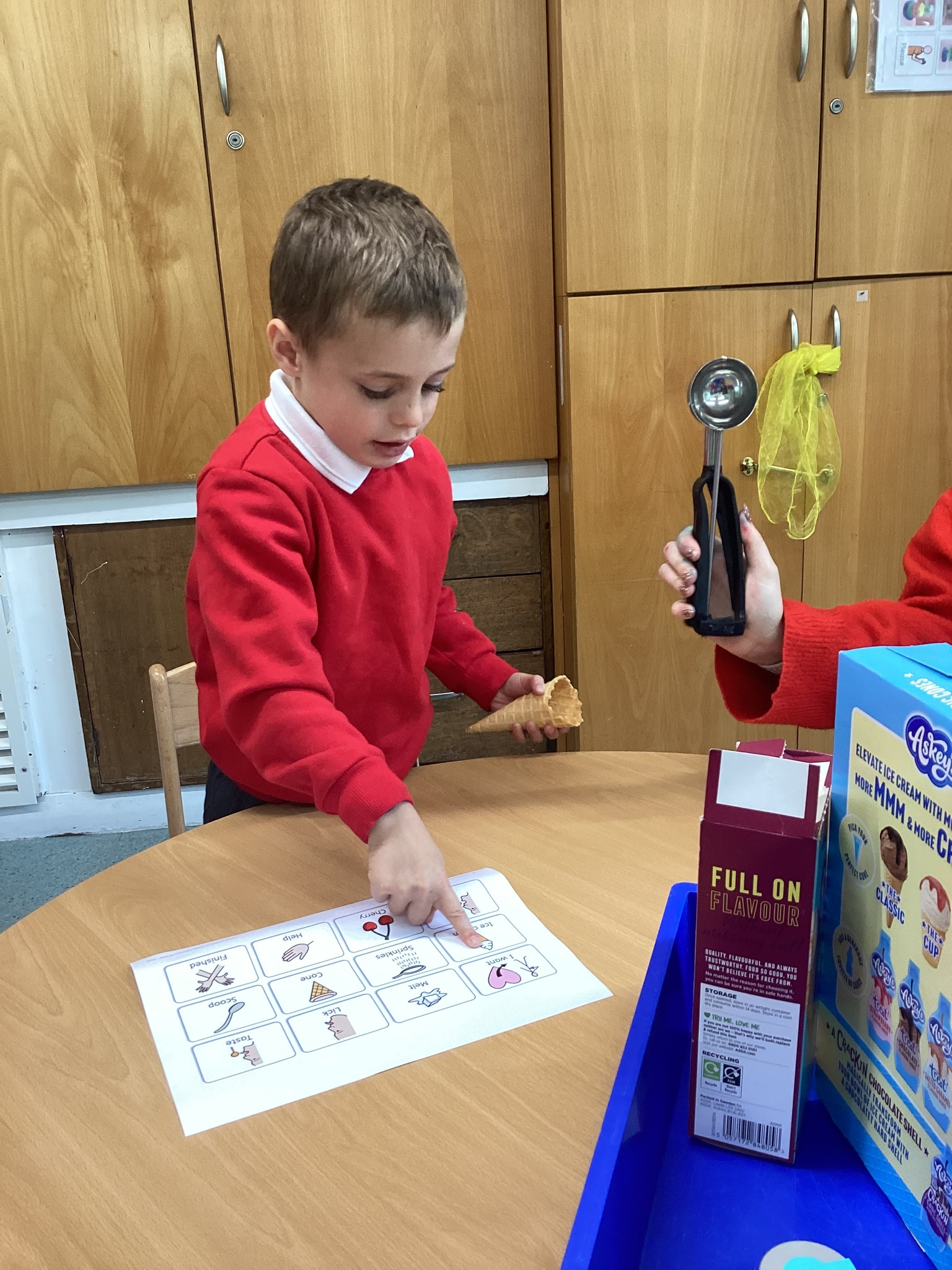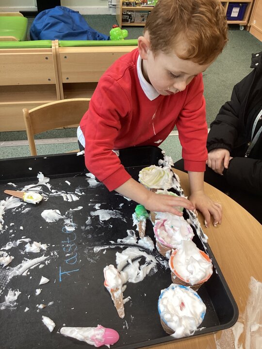 We enjoyed exploring lemons by having a taste, smell and feel. We also enjoyed painting with our hands, feeling the shaving foam and making a colourful ice cream with water colours! We did amazing turn taking in splatting ice creams and hot chocolates and had a turn at making own real ice creams! We used the core boards to request and loved having a taste.