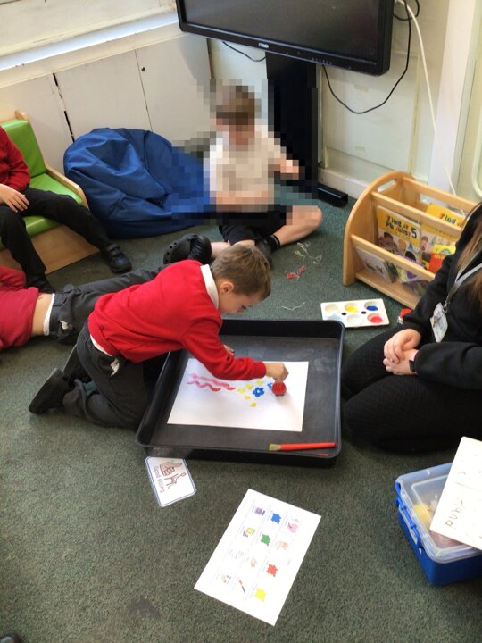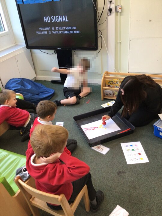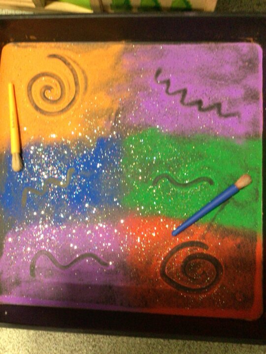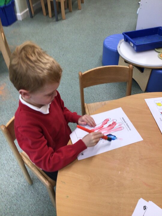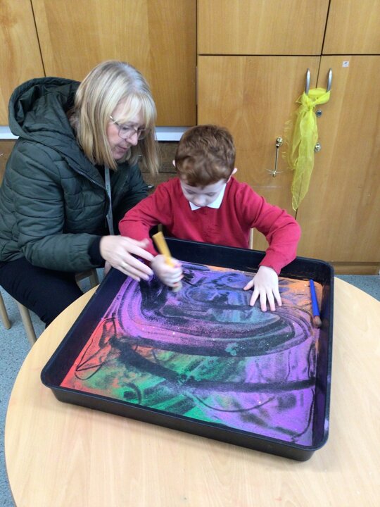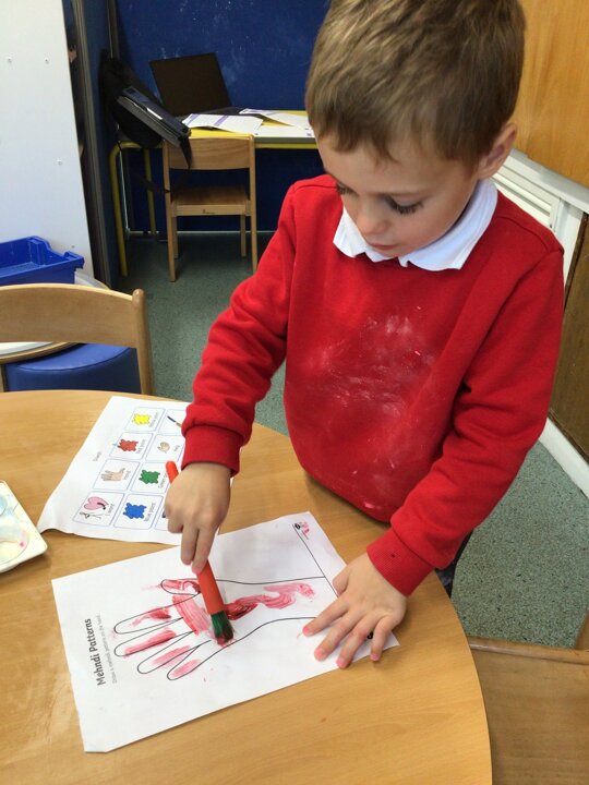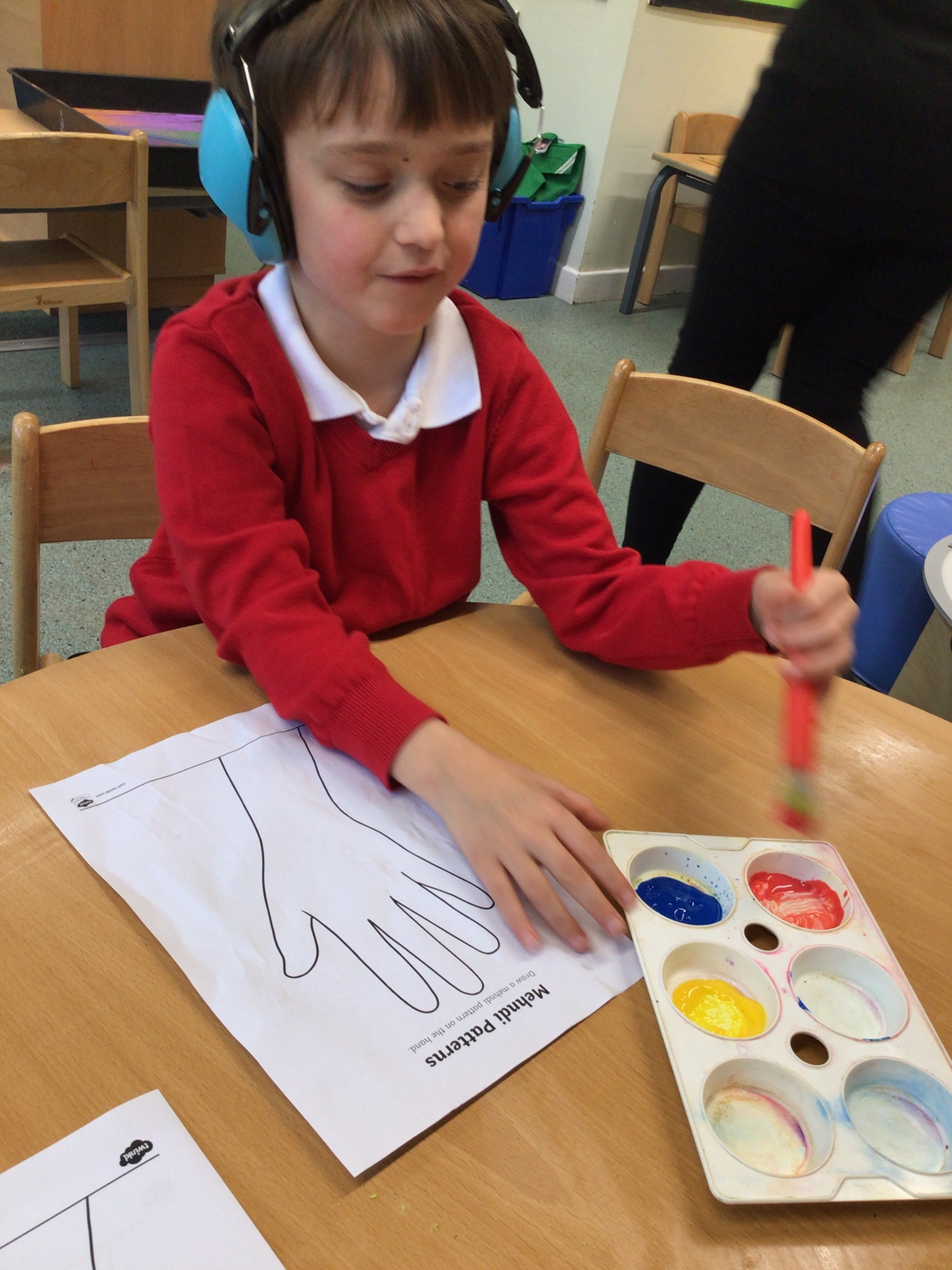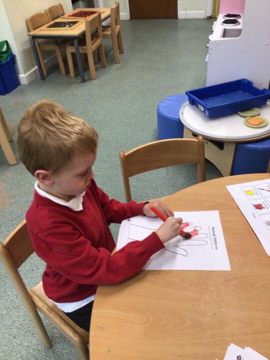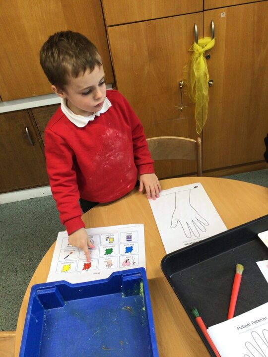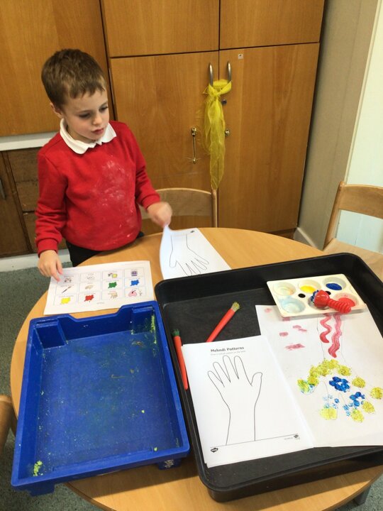 On Monday, we watched Miss Brown model painting hands to make Mehndi patterns and then had a turn at making our own. We made marks in sand and glitter and explored colour.