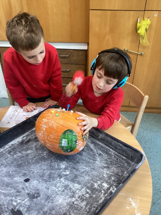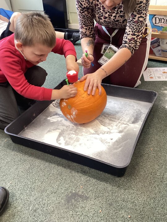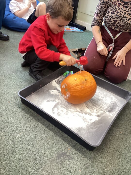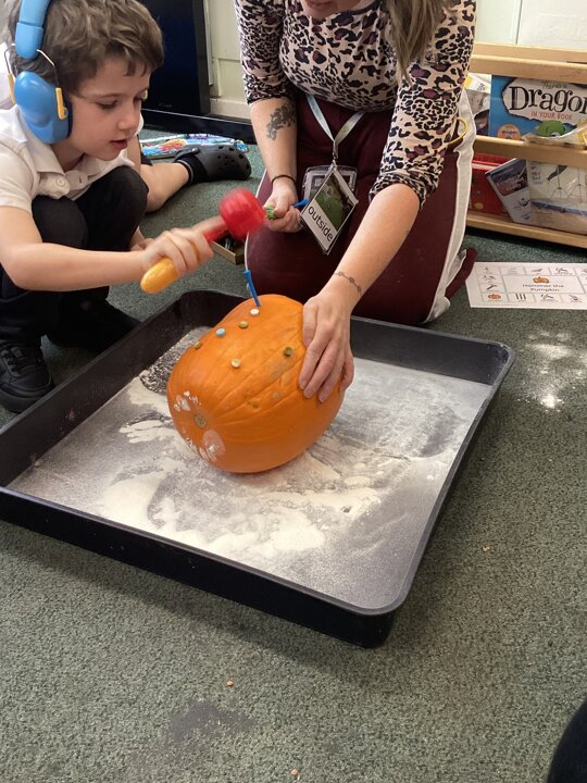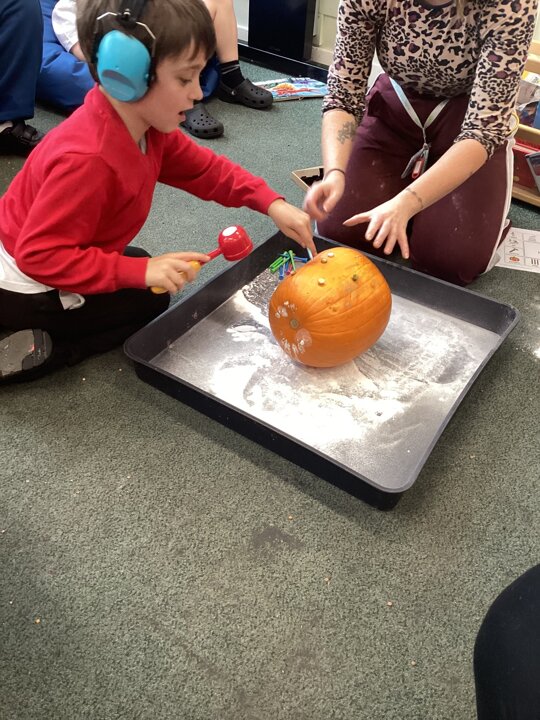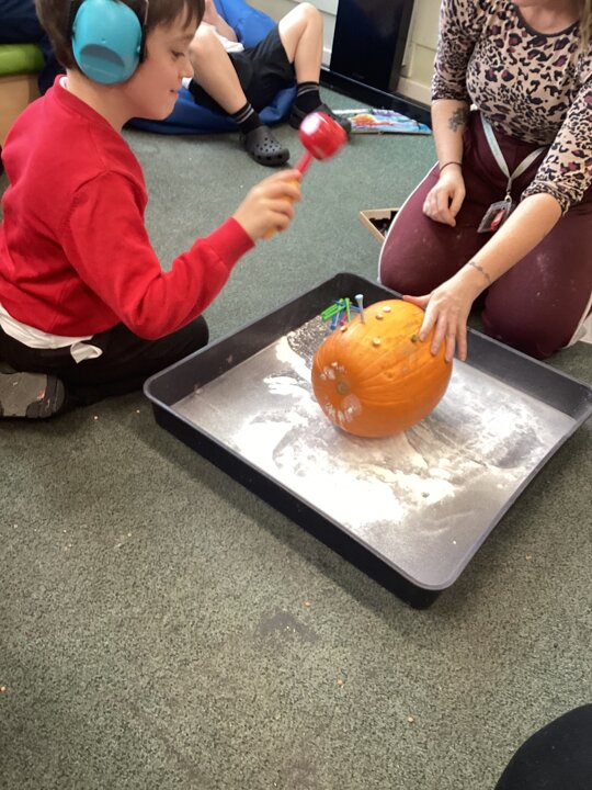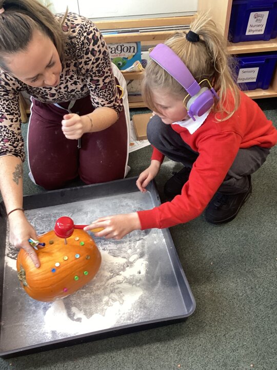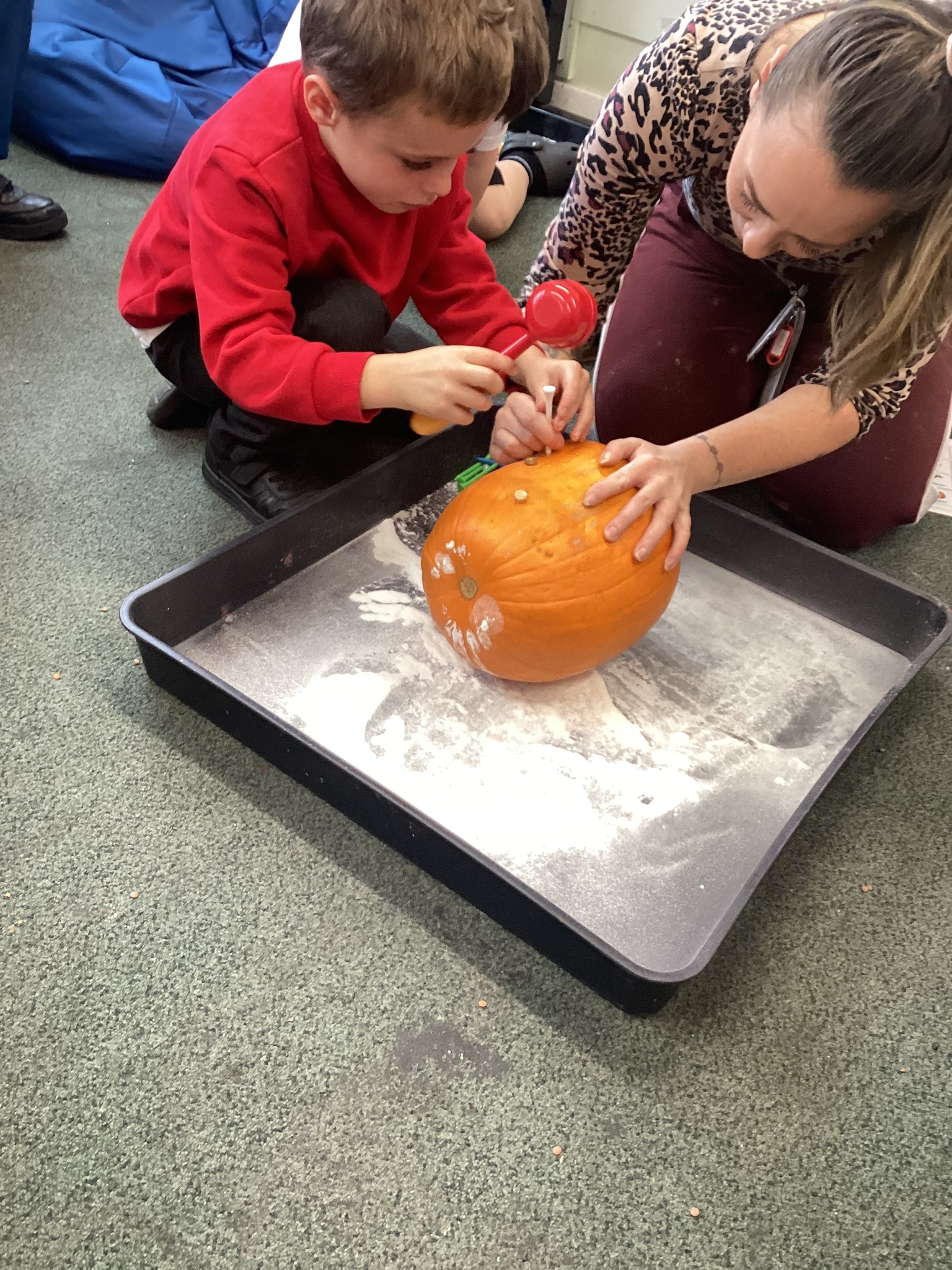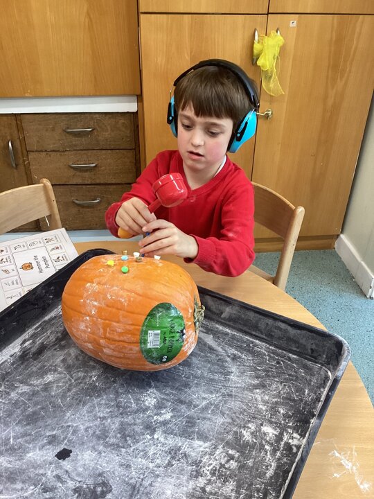 During the rest of the week, we loved exploring Halloween. We all had a turn at dressing up and practised our ‘scary’ faces. We also watched Miss Melling engage us in a fun and exciting attention autism. We watched the Halloween toys, a pumpkin flour shake and then took turns to hammer pegs in the pumpkin.