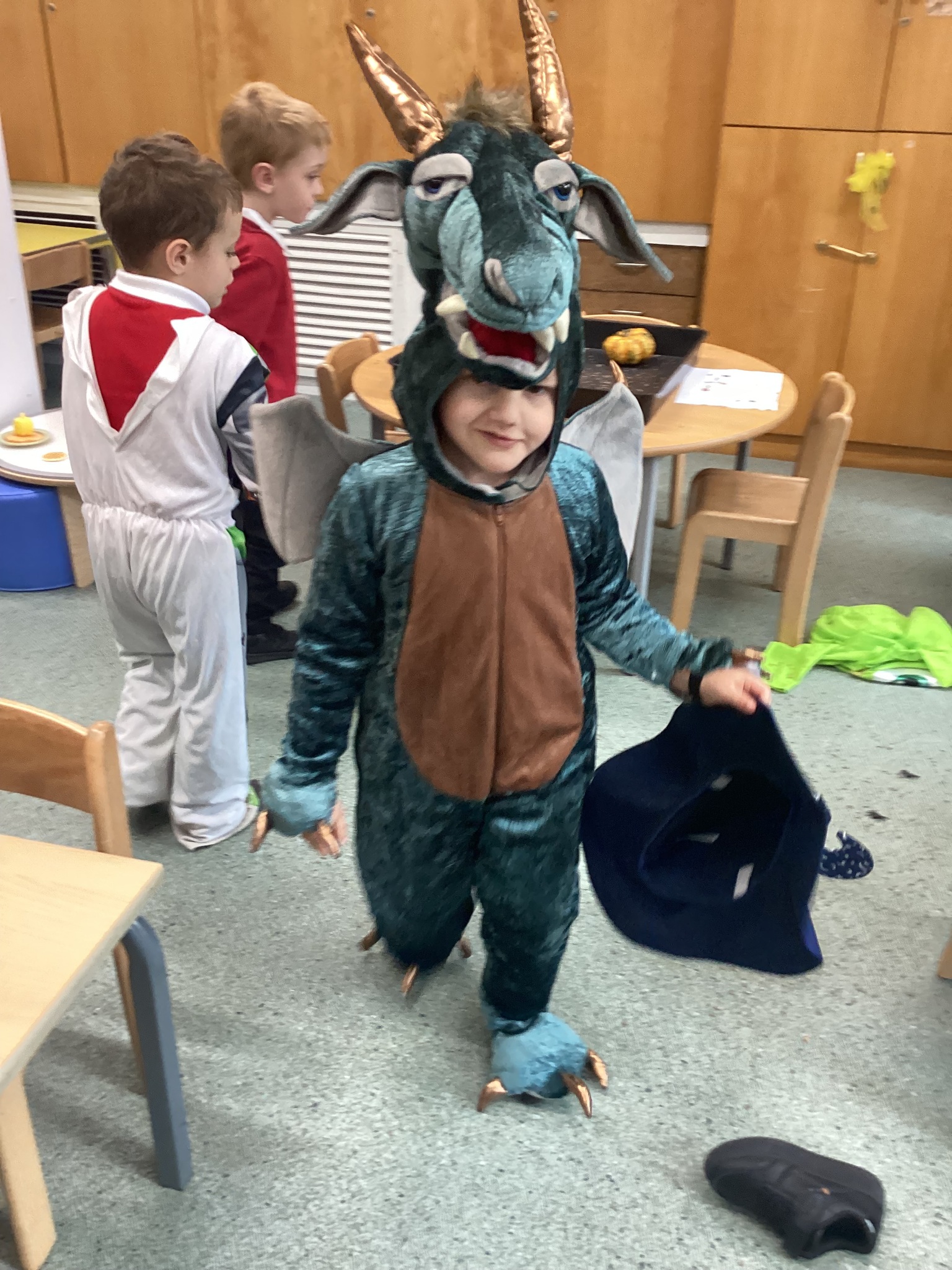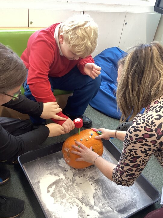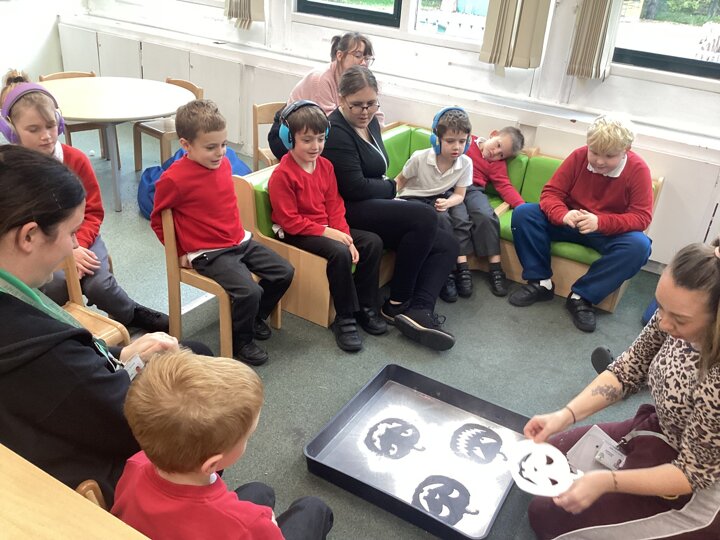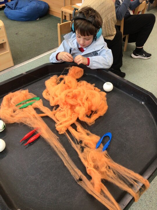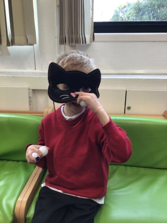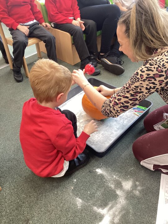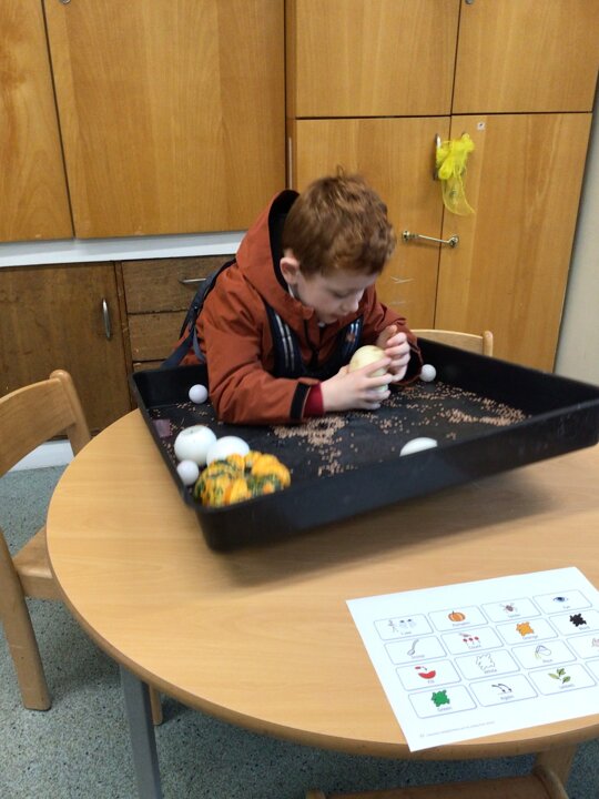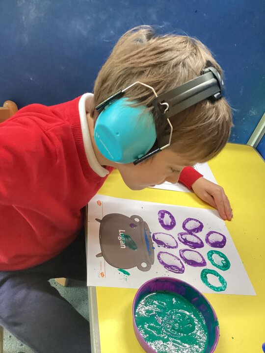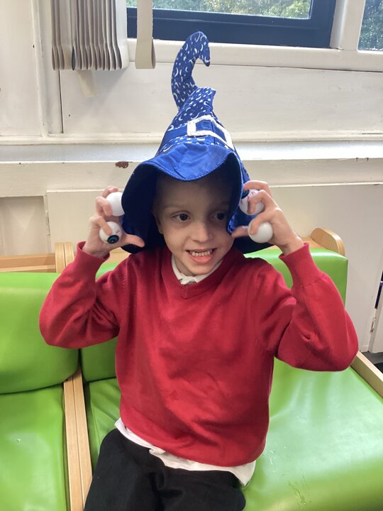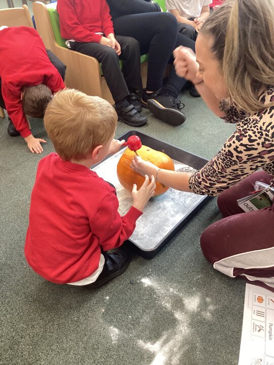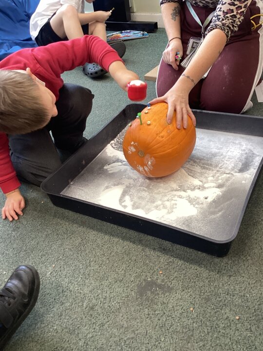 During the rest of the week, we loved exploring Halloween. We all had a turn at dressing up and practised our ‘scary’ faces. We also watched Miss Melling engage us in a fun and exciting attention autism. We watched the Halloween toys, a pumpkin flour shake and then took turns to hammer pegs in the pumpkin.
