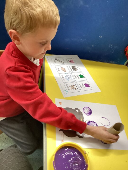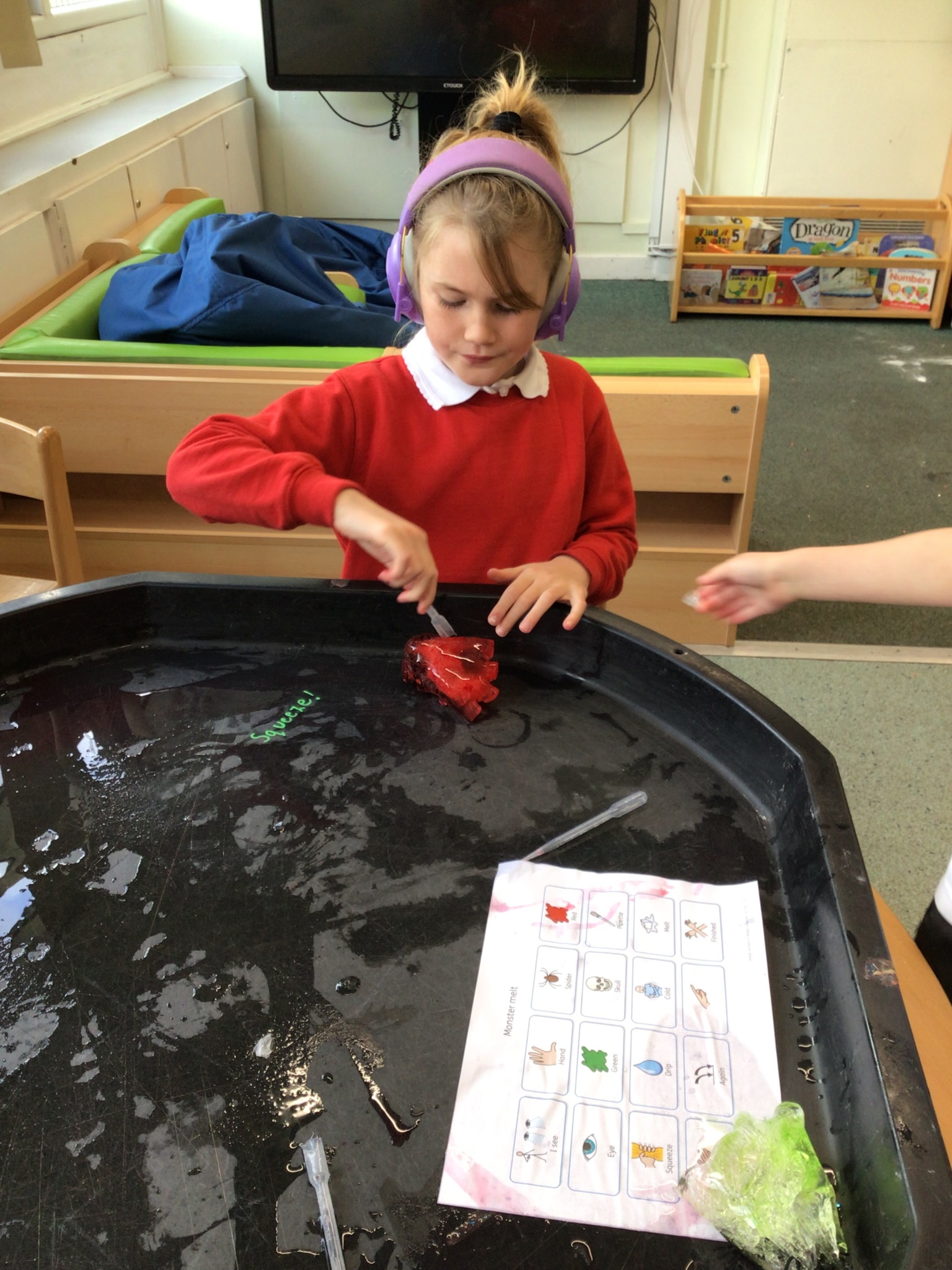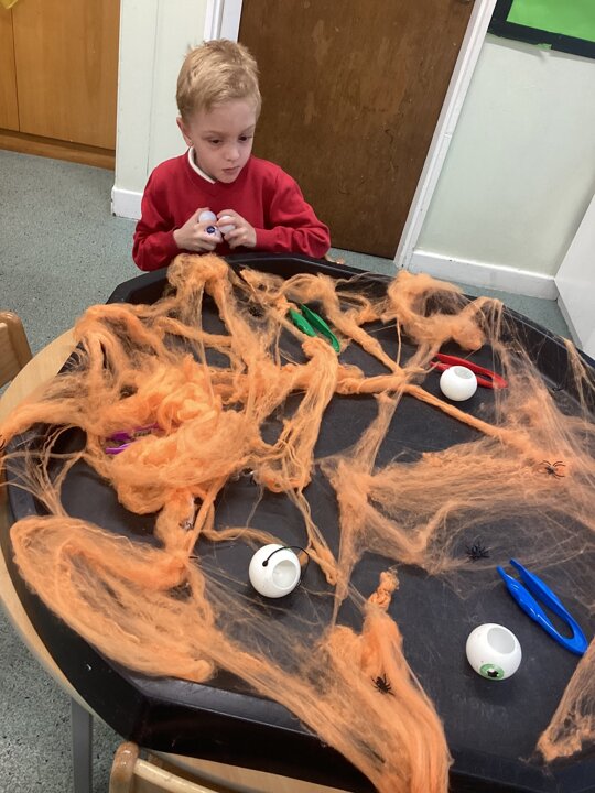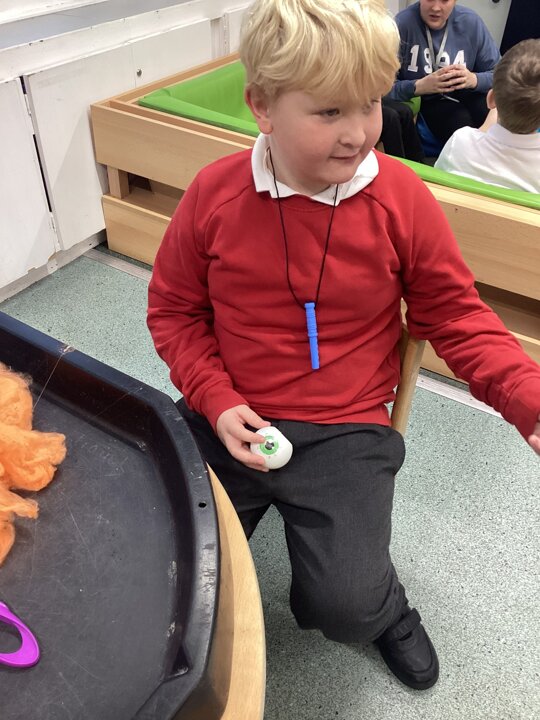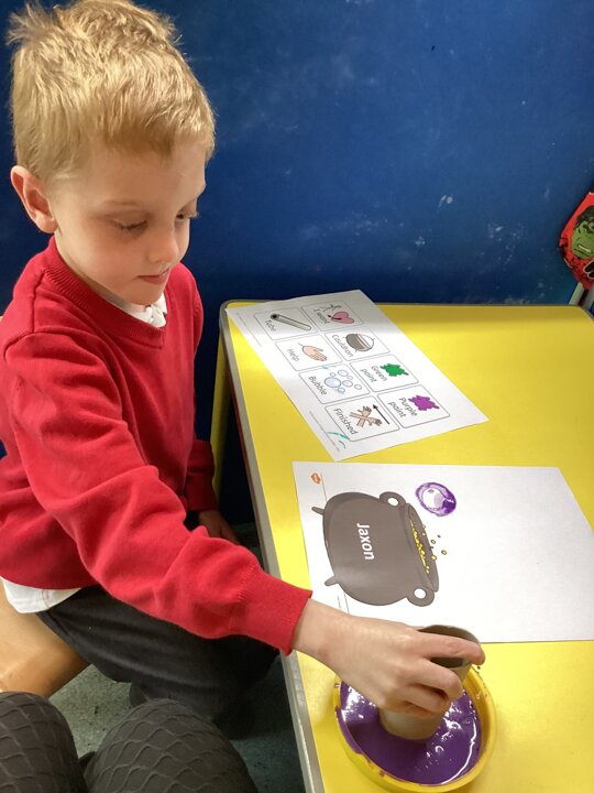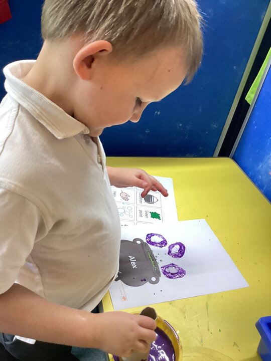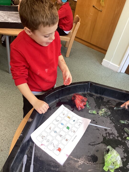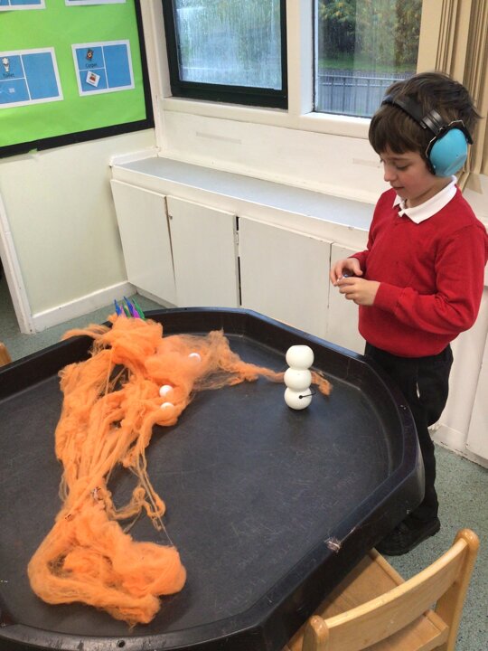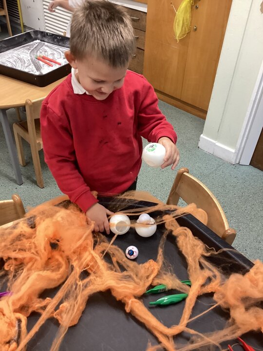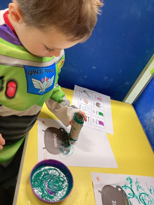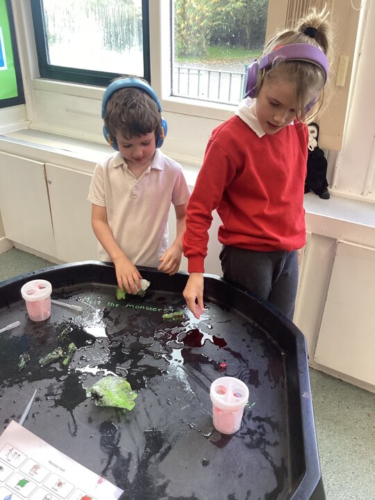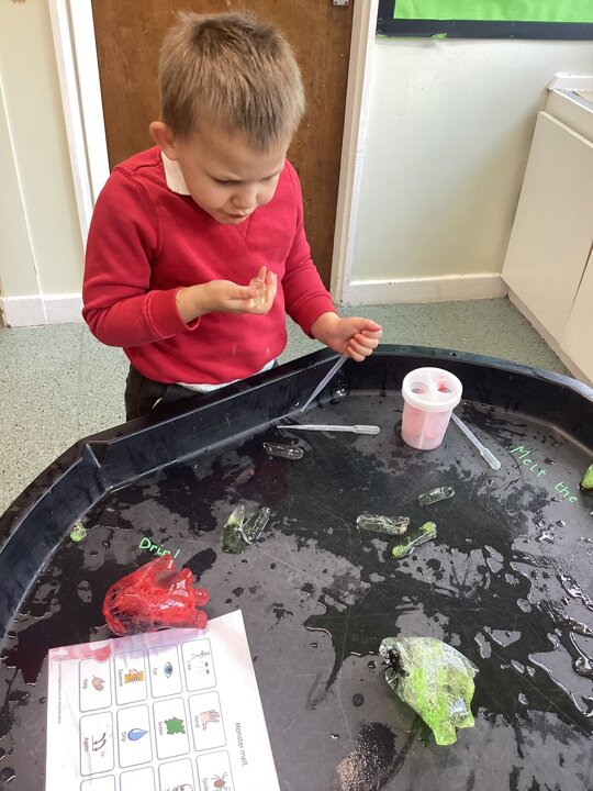 During adult led, we found spooky items in ice, melted the monsters with water and used bubble paint to make witches cauldrons.