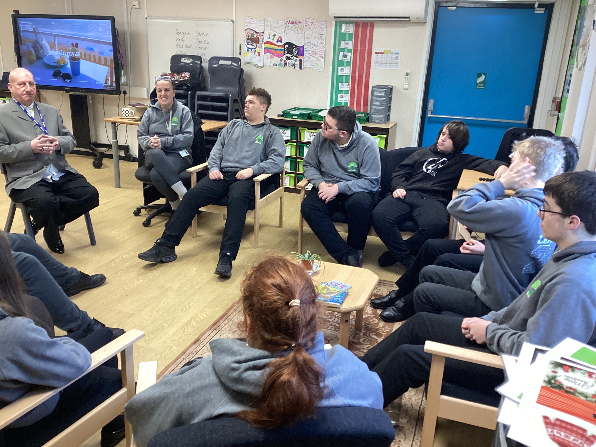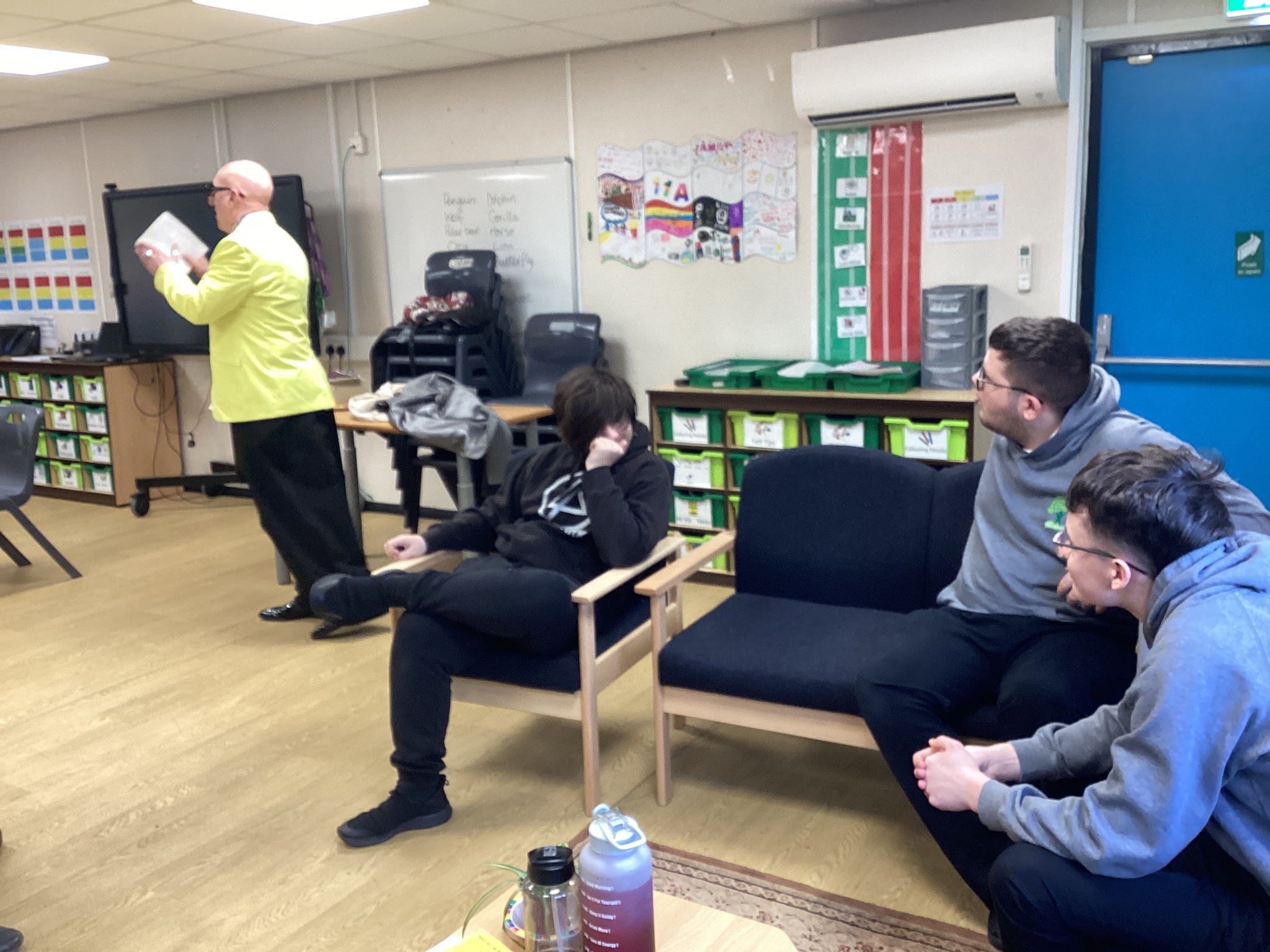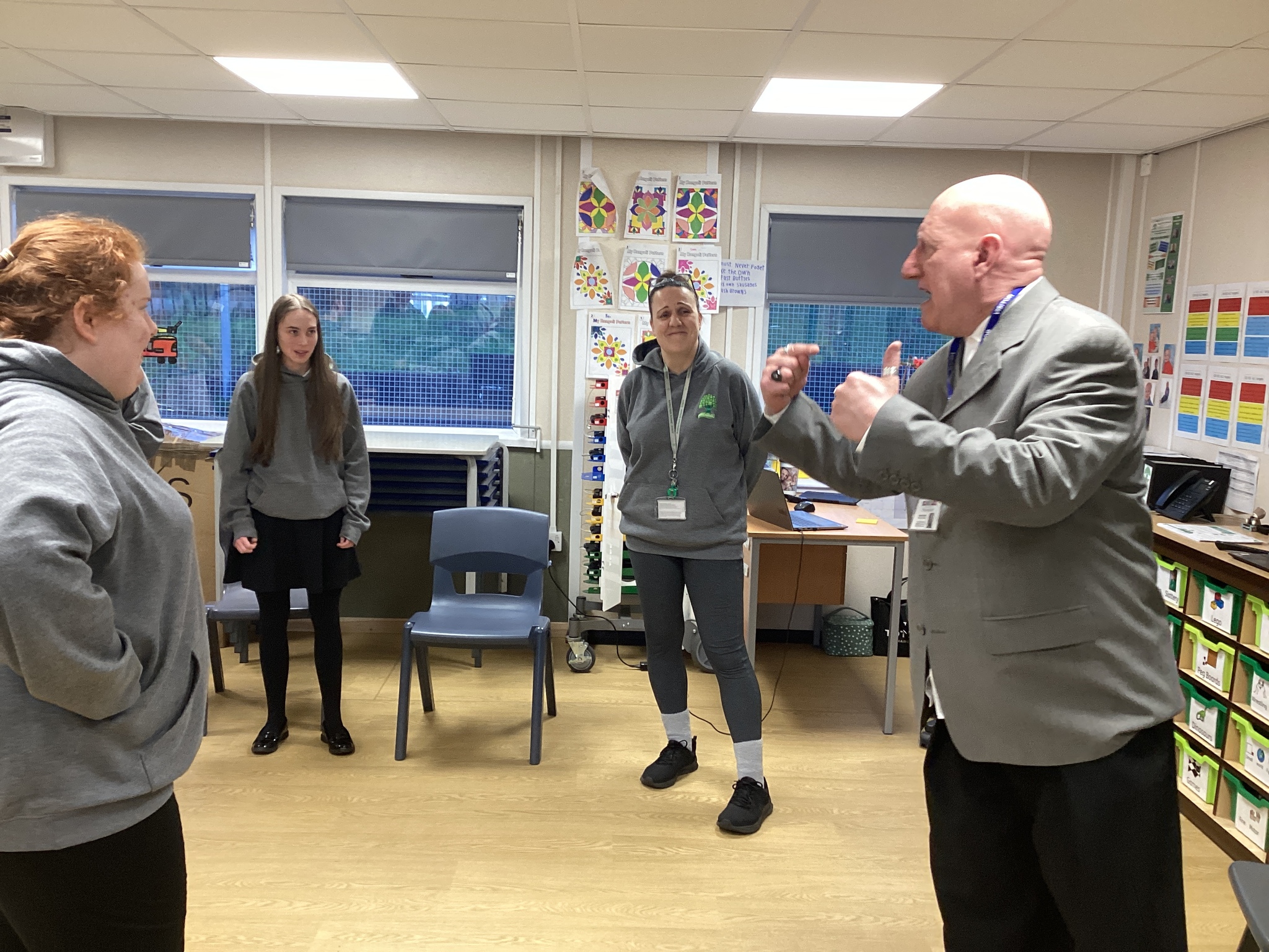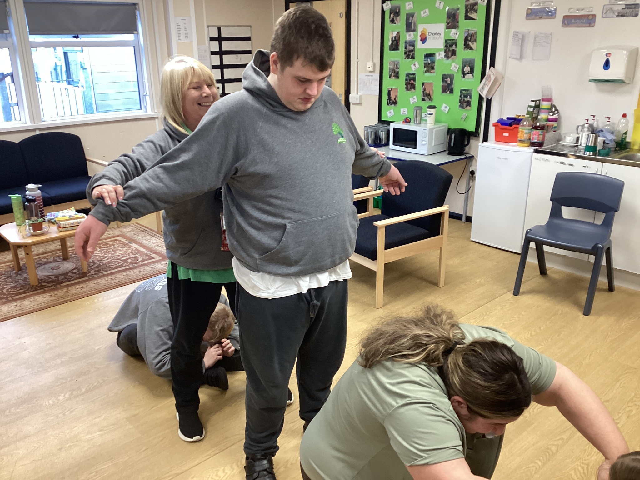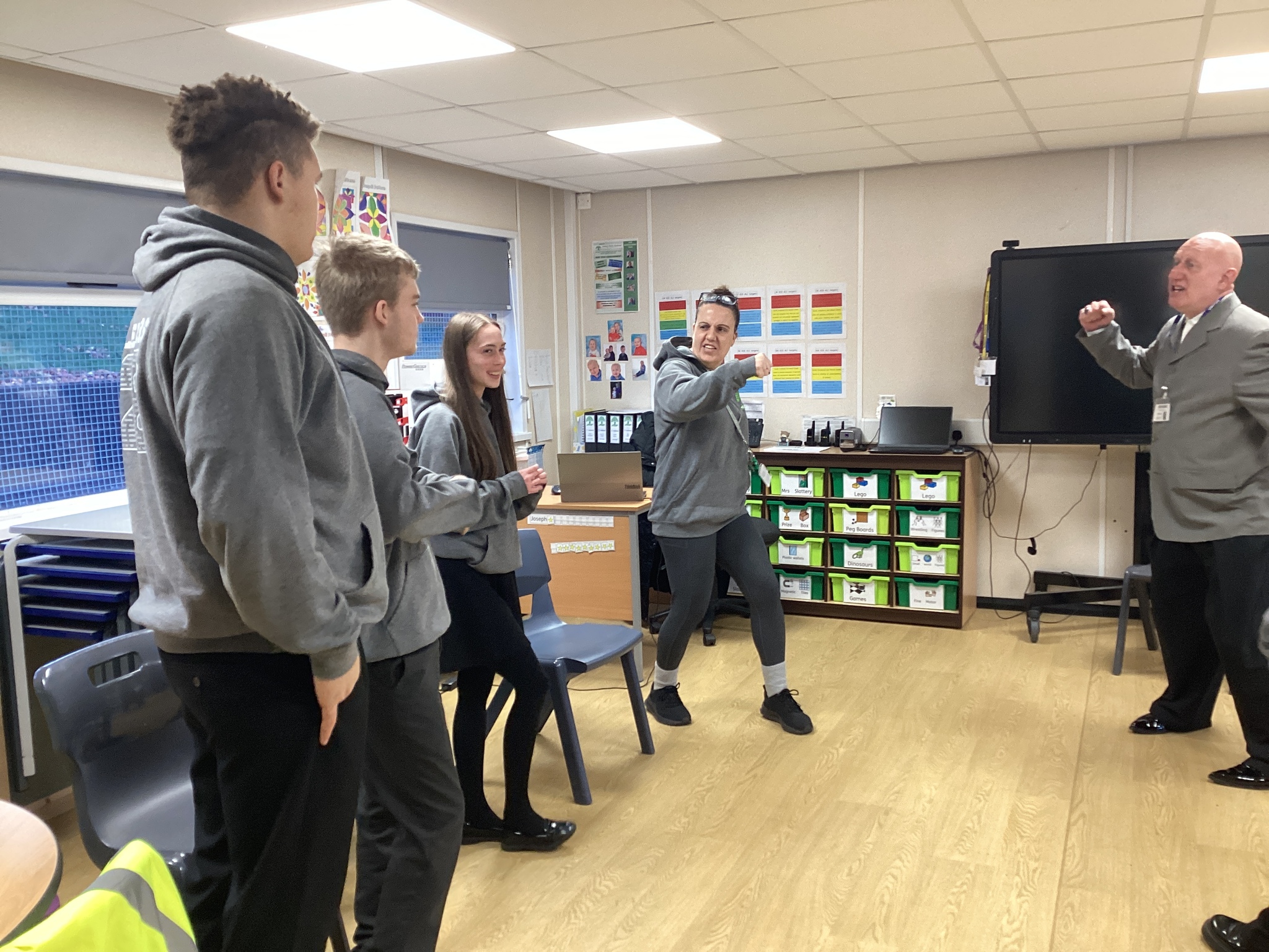 On Thursday we had a gentleman called Rob came in from a theatre company to come and do a session with us. He introduced himself and we had to go round the circle and say our name someone said bing, then bong and then we had to say our name. Rob explained we are linking this to our ASDAN work and we spoke about the environment. We spoke about different means of transport and what is good for the environment. Rob then told us to get into groups and in our groups we had to act out different means of transport using our bodies.