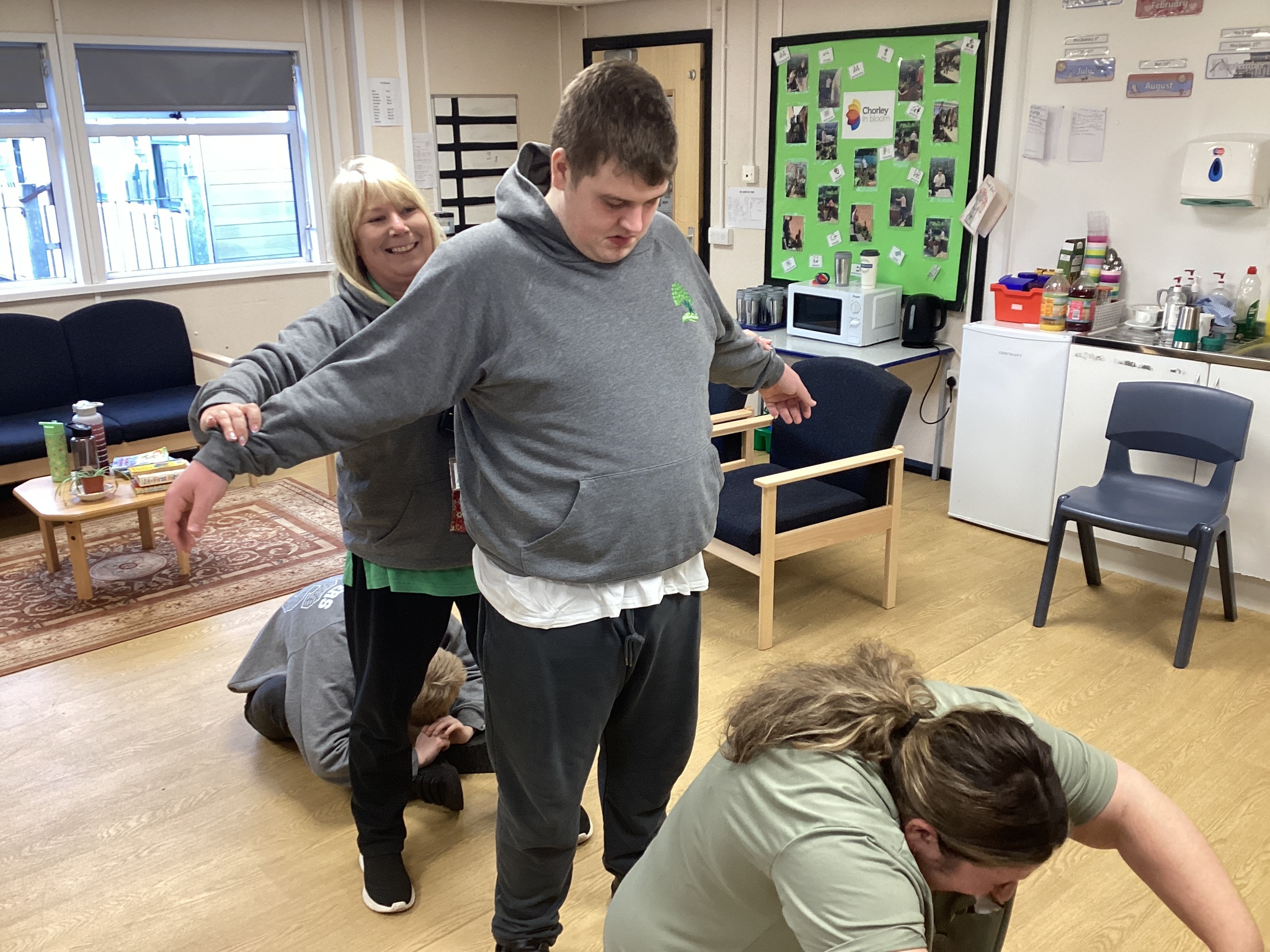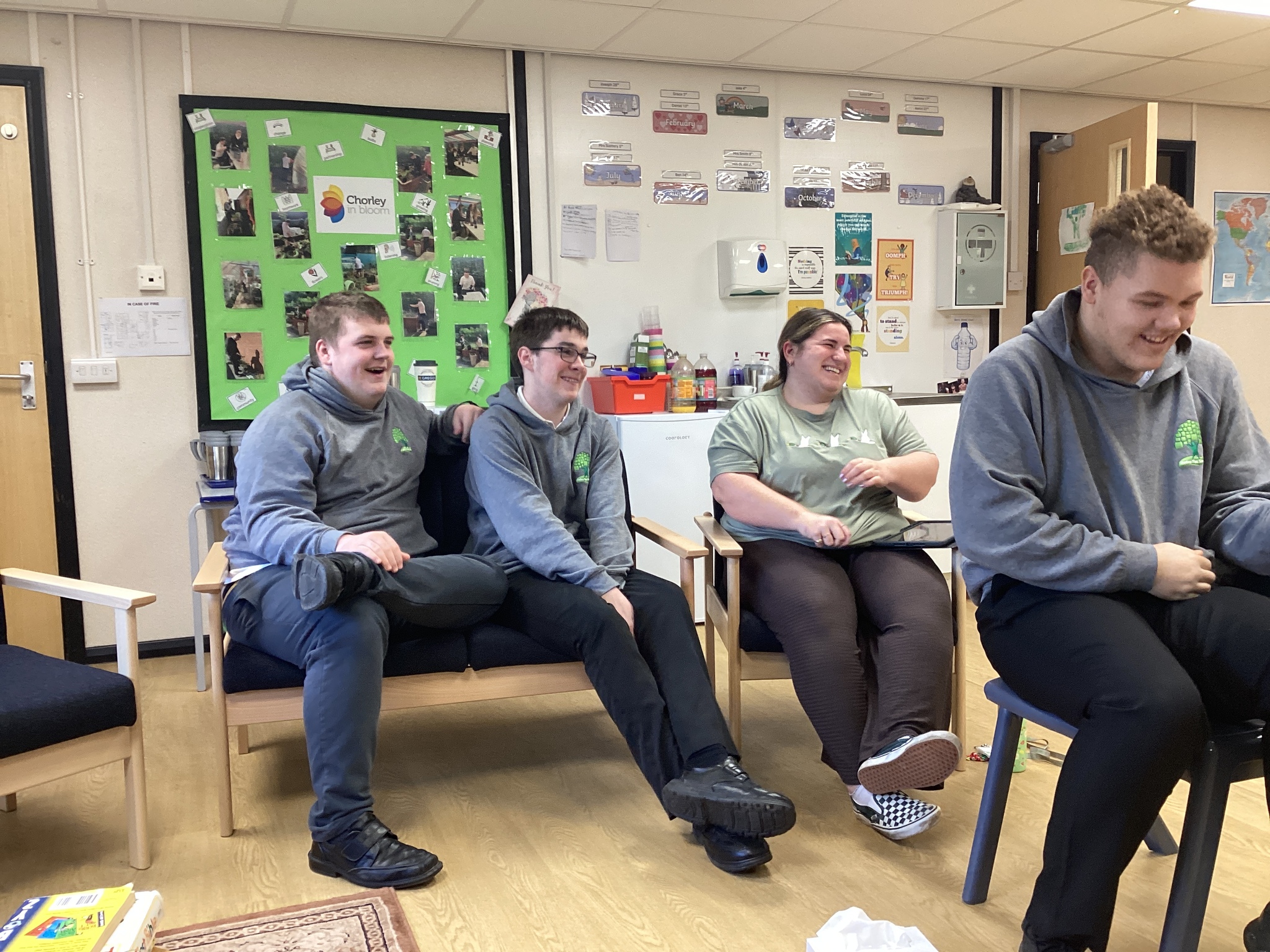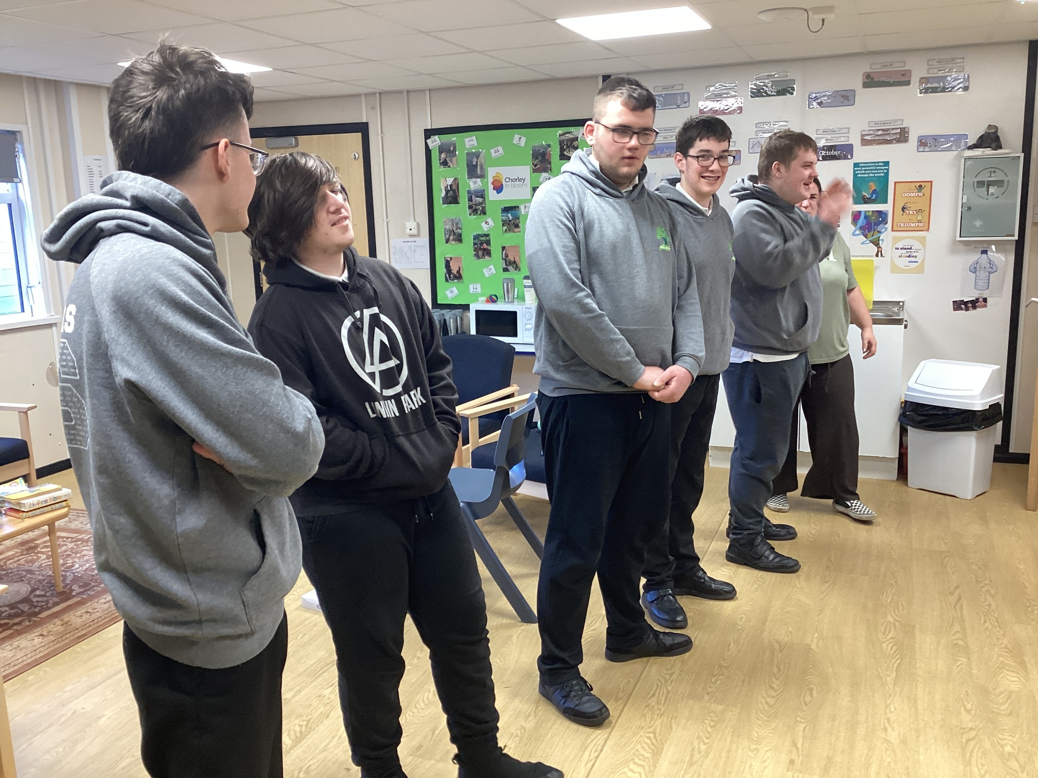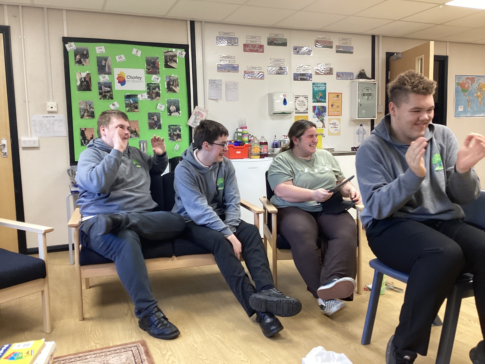 This was lots of fun, we had a good laugh, we acted out a scooter, a bike, horse and carriage and a rowing boat! After this we did a quiz show! Rob put on a cool jacket and some glasses and was our quiz master and asked us different questions and we had to create our own “buzzer noise” one groups buzzer was “chicken nuggets” another one was acting out a gorilla and made the sound and the other buzzer was “ding”. The winners were the “Ding”. Then we had an acting exercise, it was all great fun! After this Gill from Chorley in bloom came into school and helped us doing some gardening round the school. In the afternoon, we went to Tesco to buy are supplies for breakfast butties. Once we’d done our shopping we went into Tesco cafe and had a brew or a cold drink.