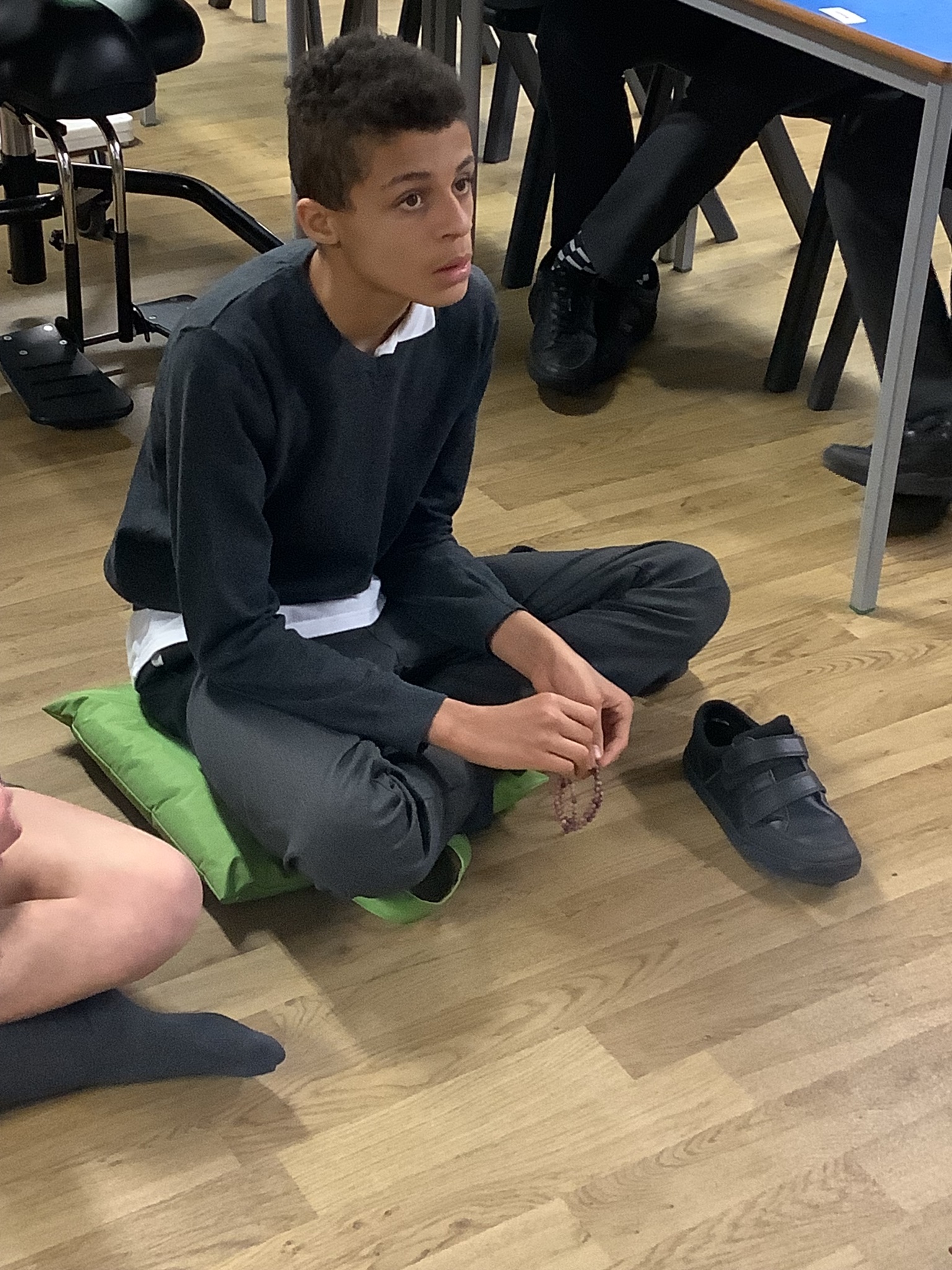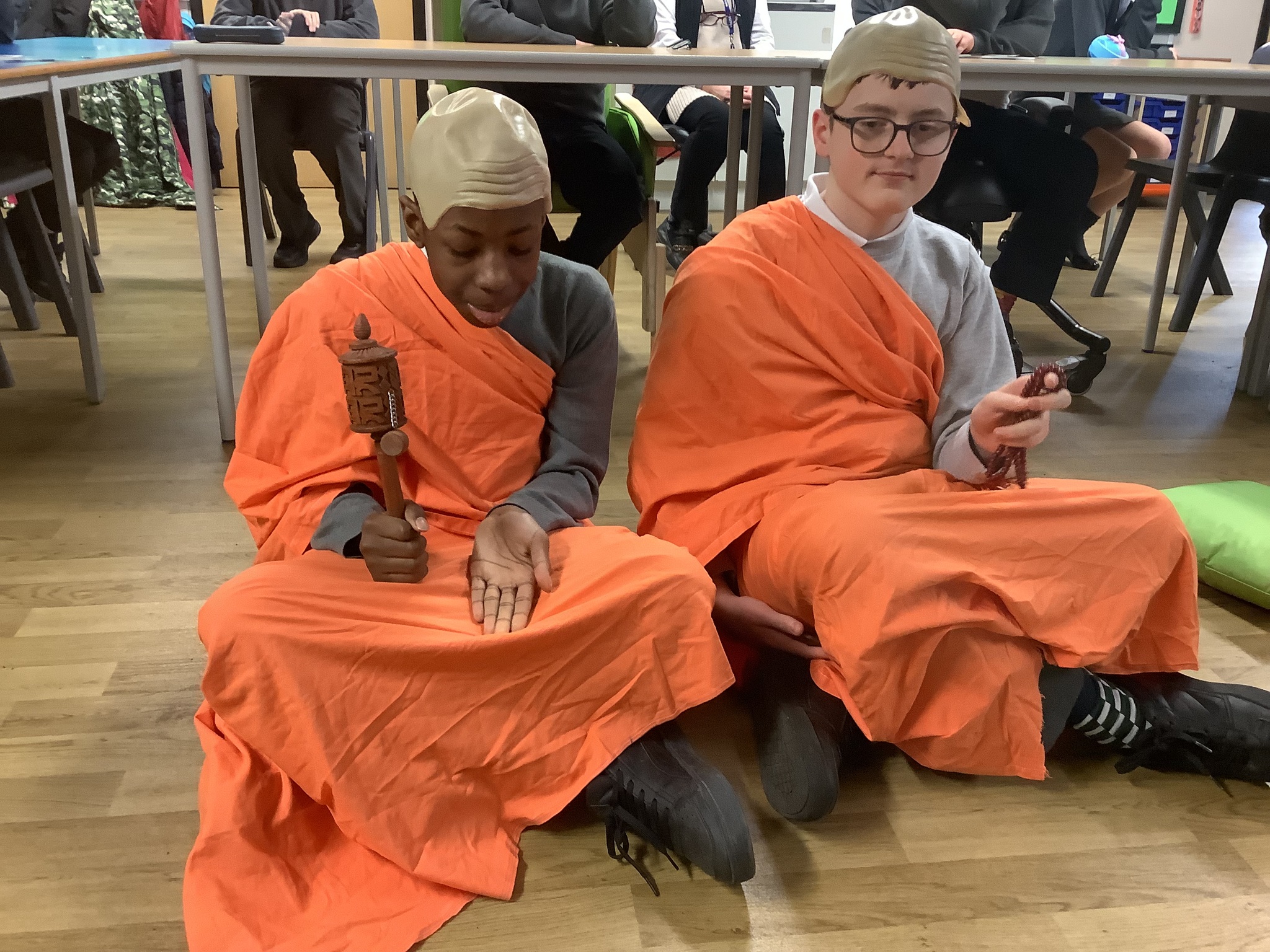 A couple of us volunteered to dress like Buddha, then sat on the floor to listen to the calming music with their Mala beads and prayer wheel.