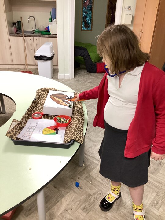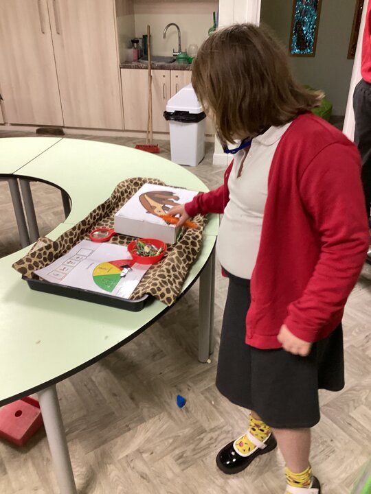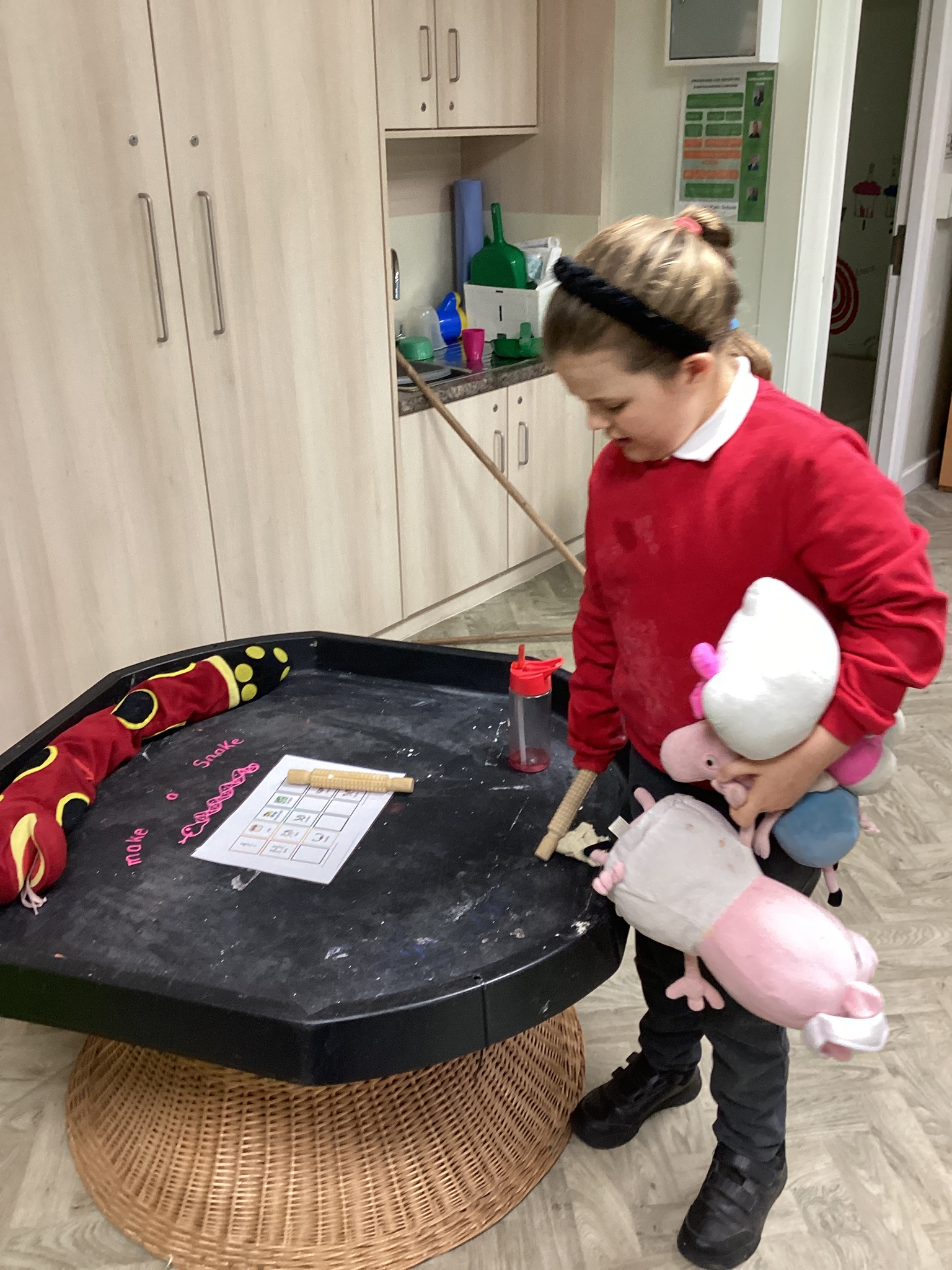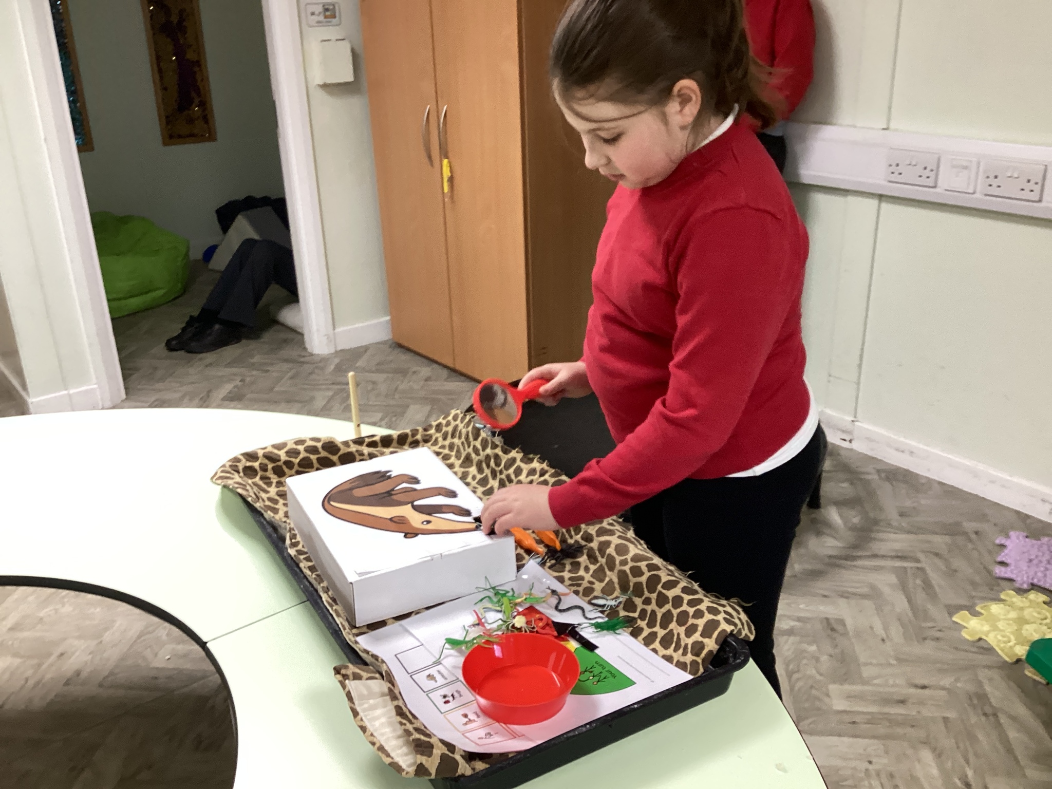 We have also continued to explore our animal topic and used our fine motor skills during continuous provision, feeding insects to an anteater and also our fine motor hedgehog game- allowing us to focus on our hand eye coordination, pushing the different coloured spikes into the holes. We have been working on identifying different animal vocabulary and identifying basic features of animals.