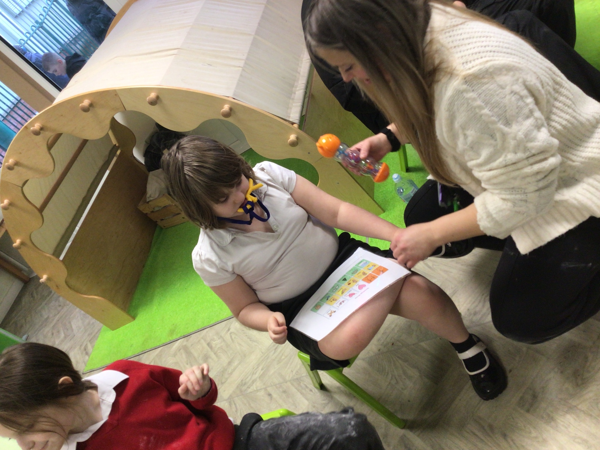We have been communicating with our core boards, point at what we see, hear, smell, taste and feel and also pointing to a “like” and “don’t like” visual to express our feelings. We have been working on sustaining our attention to a stimulus and multi-sensory props and materials.