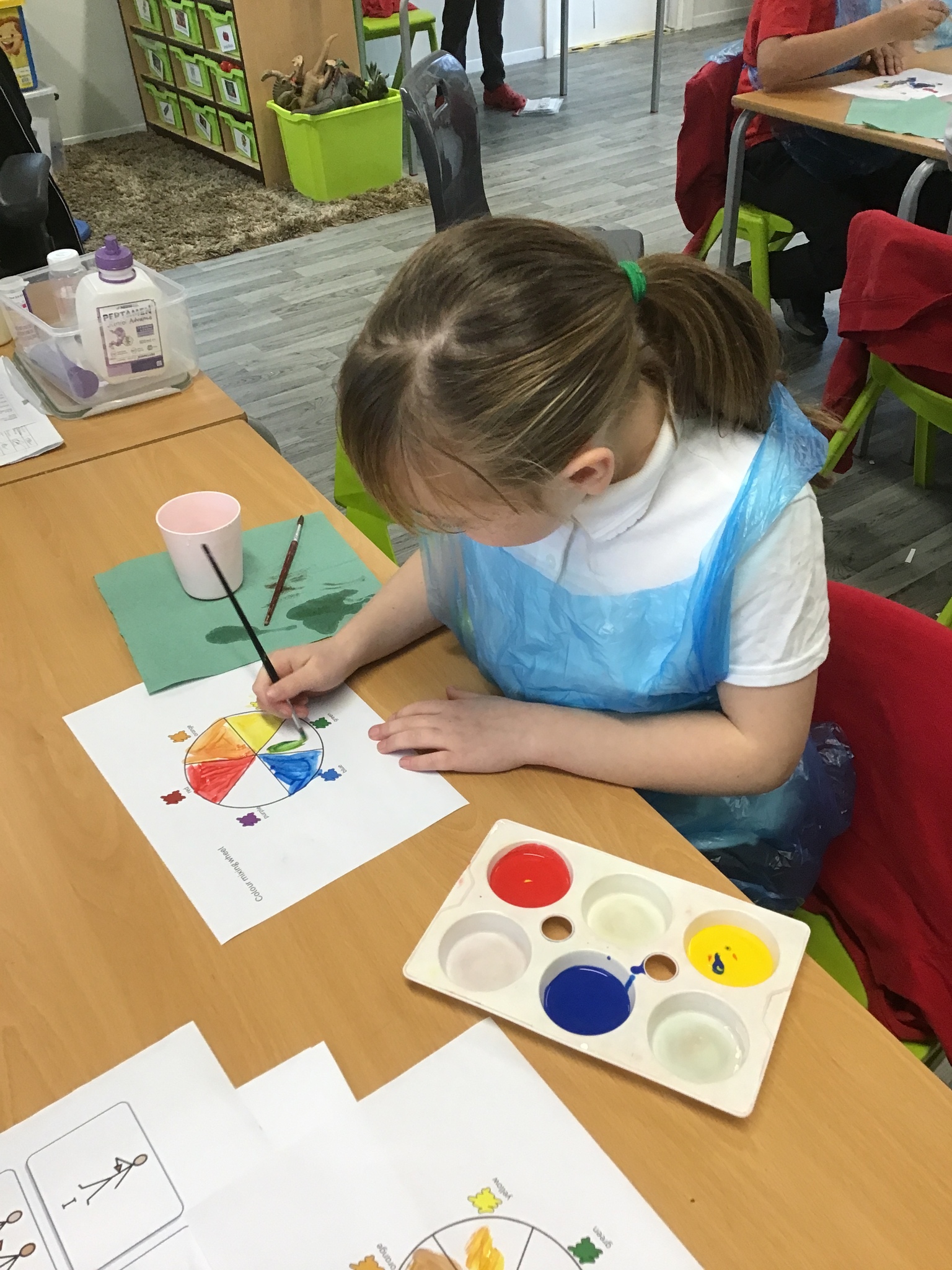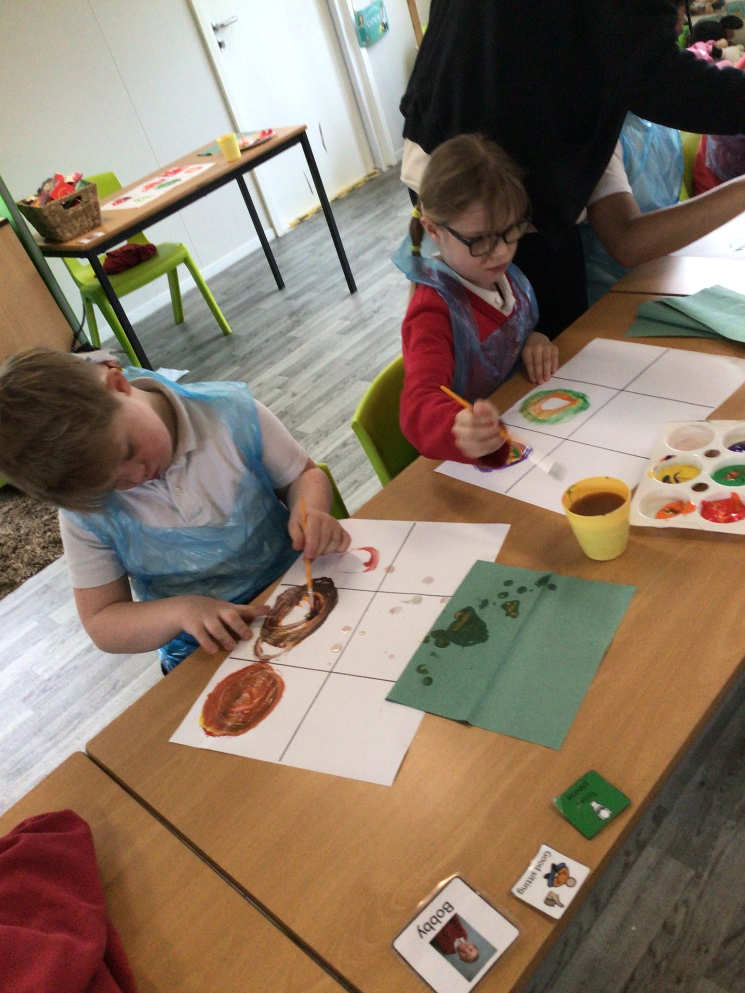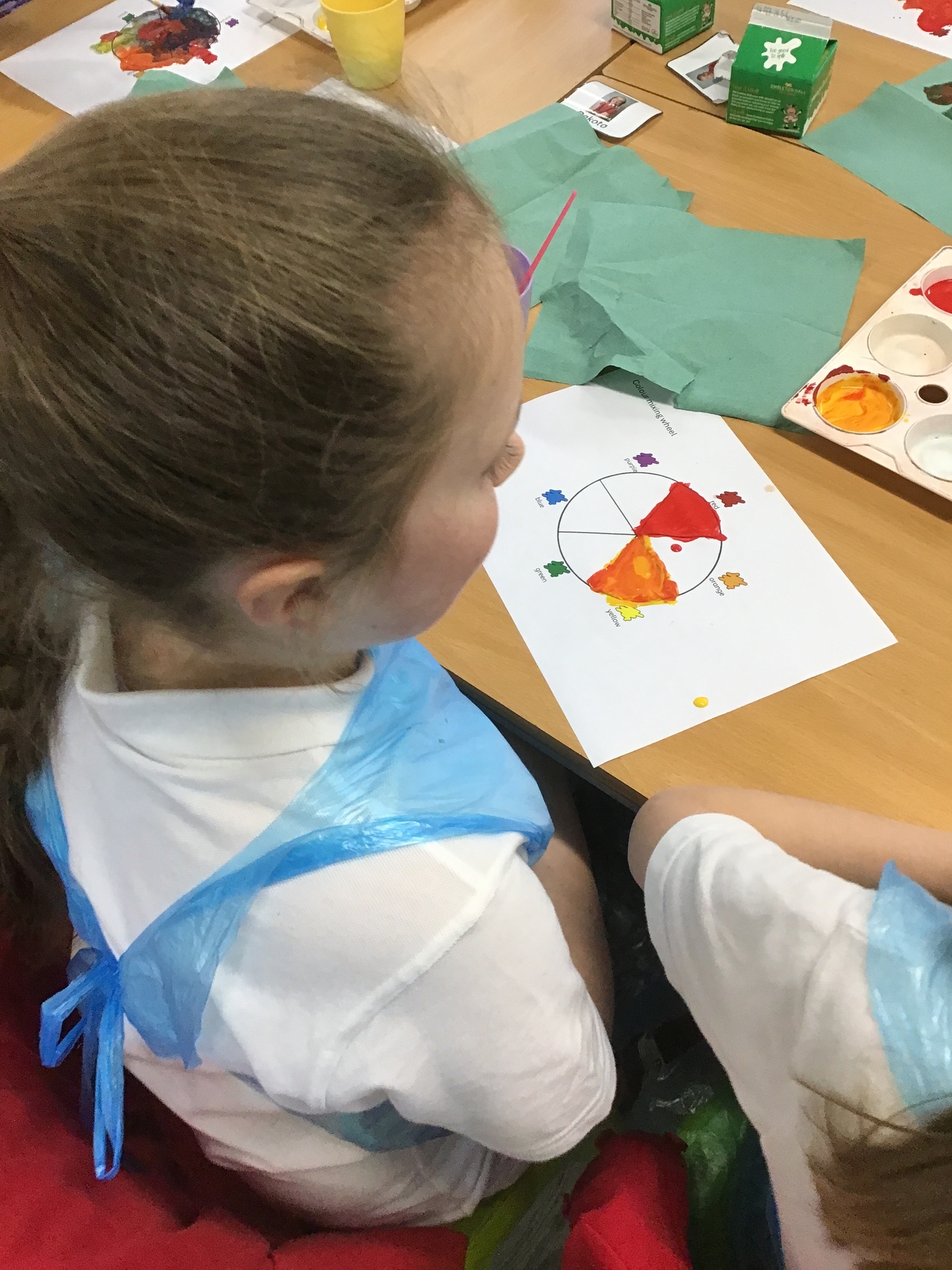 Some great creative work in art, looking at primary colours and the colour mixing wheel, everyone enjoyed getting messy with paints!