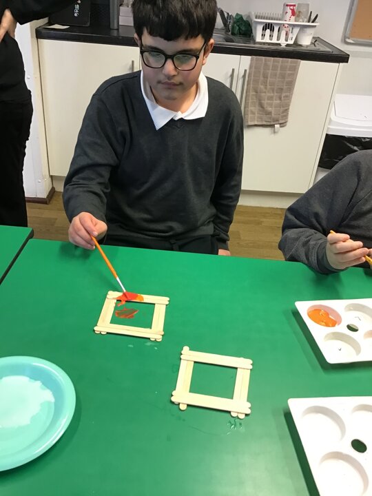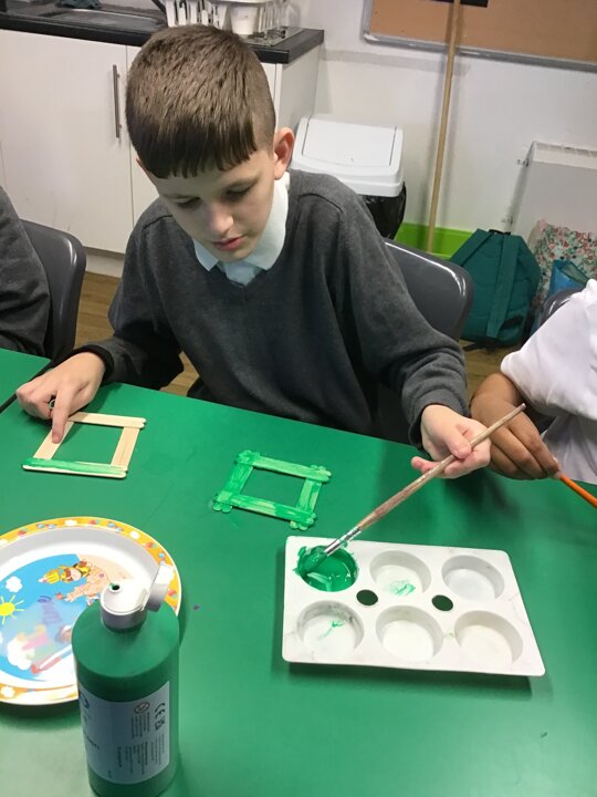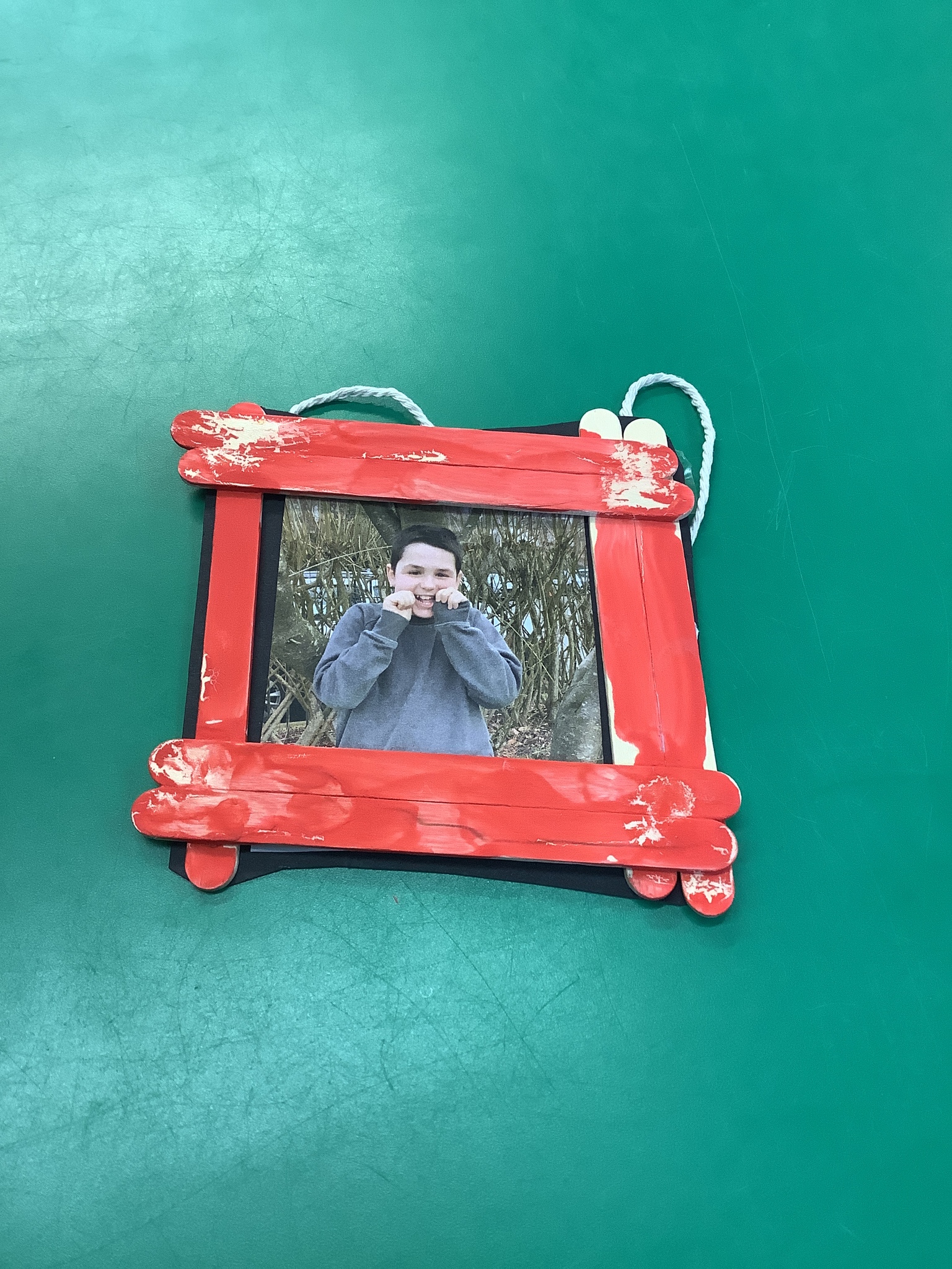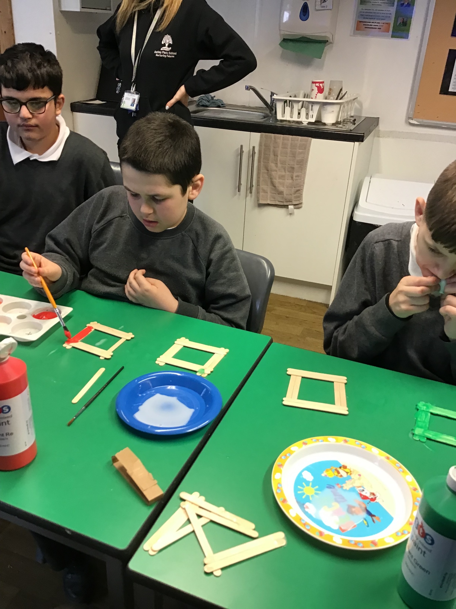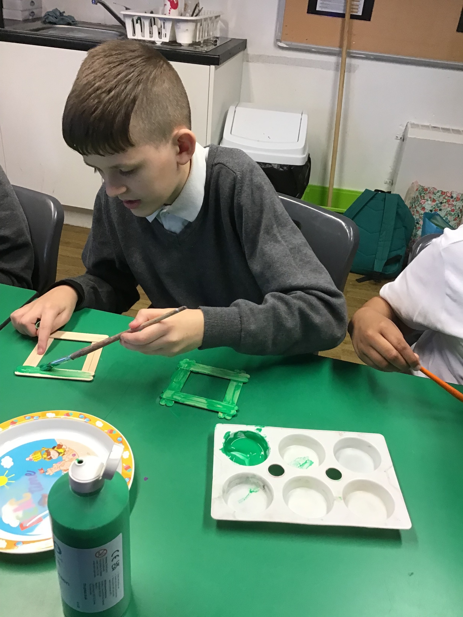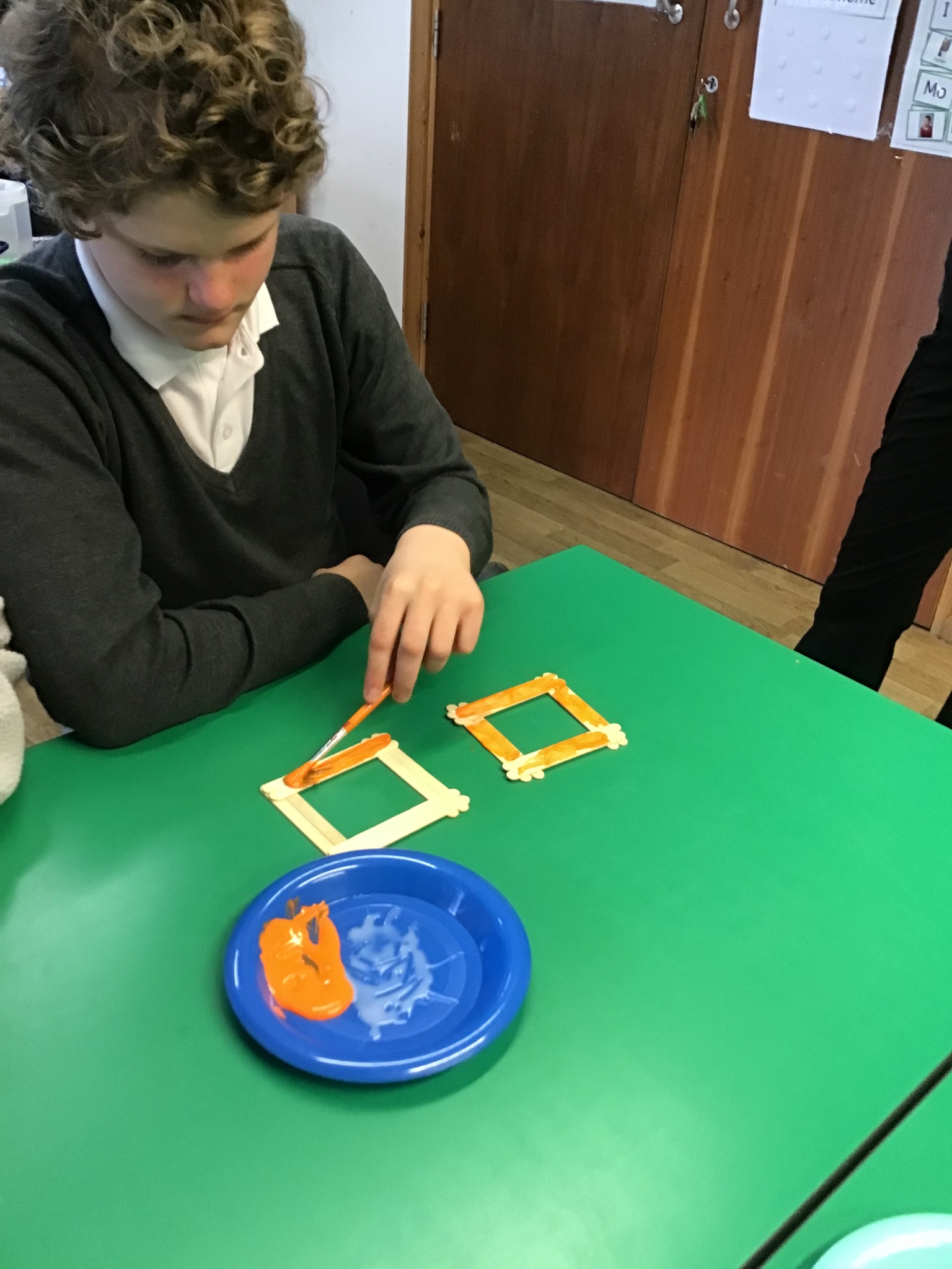 Last week in 7P’s Design Technology lesson we used lolly sticks to make photoframes, using PVA glue we stuck eight lolly sticks together in the shape of a square before painting and decorating them as we wanted to. We then let them dry, and in this week’s Design Technology lesson we moved on to putting photos inside them.