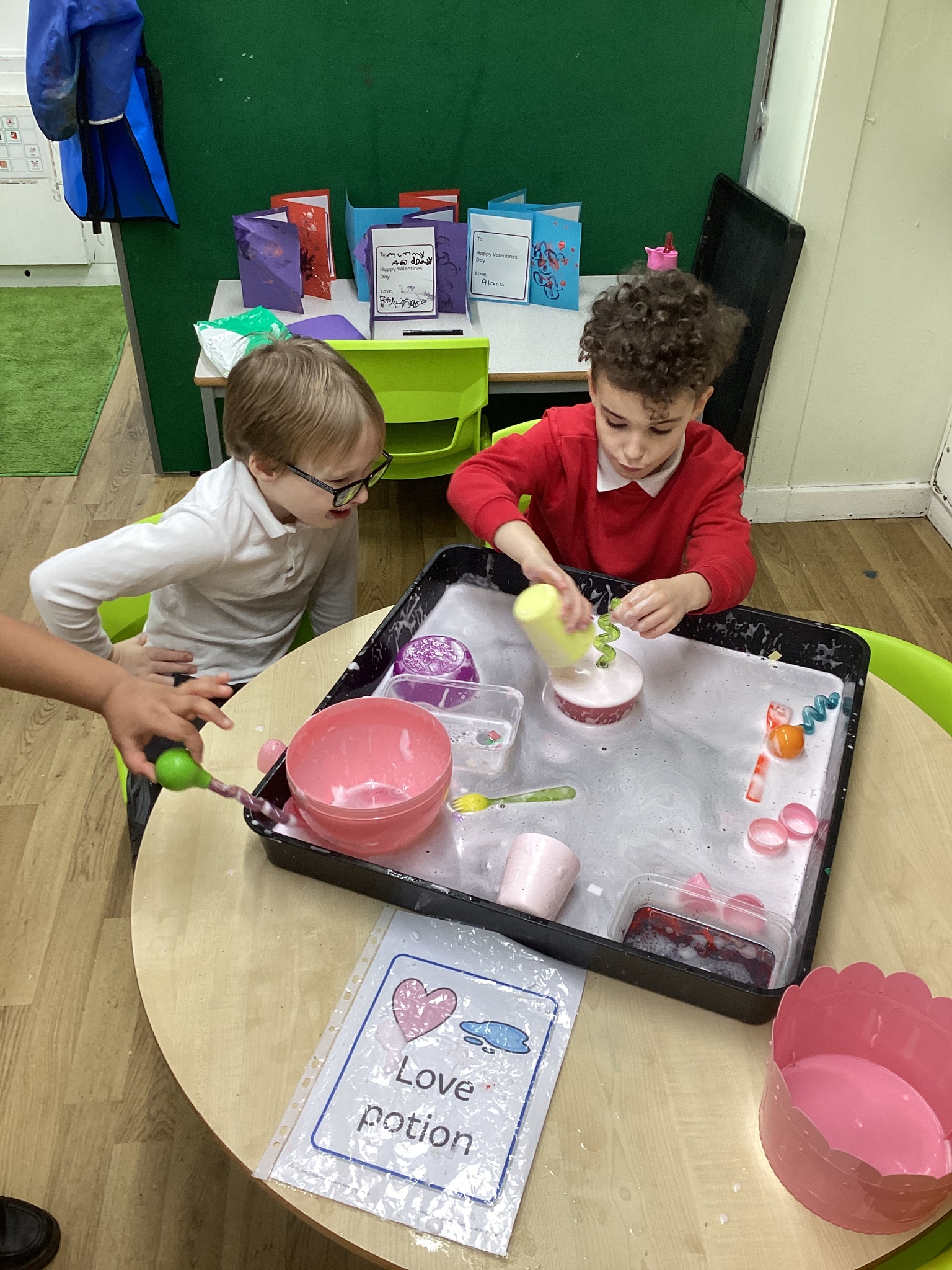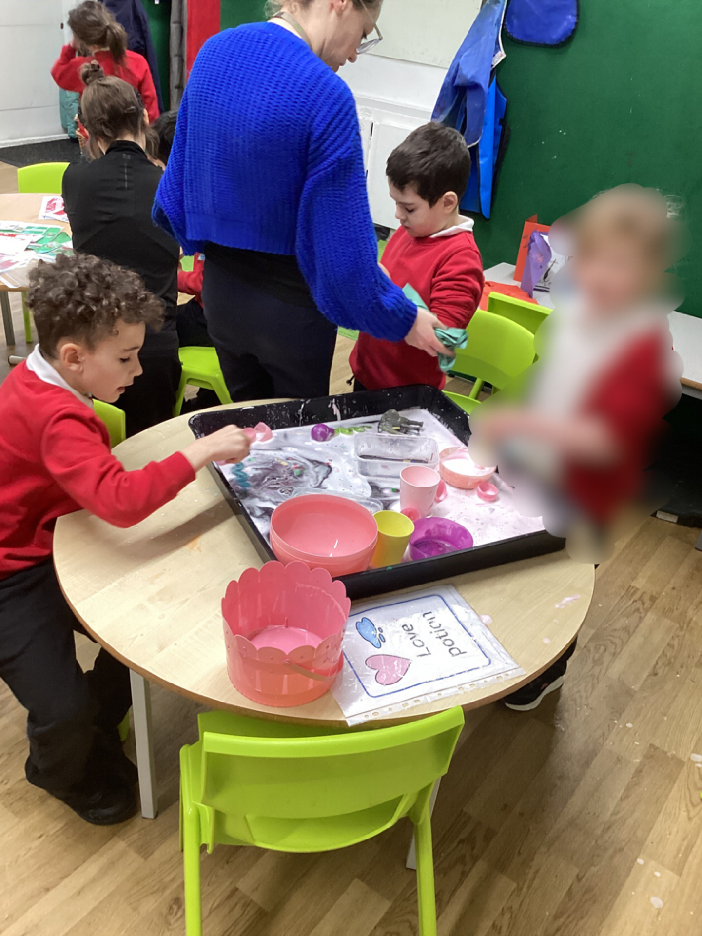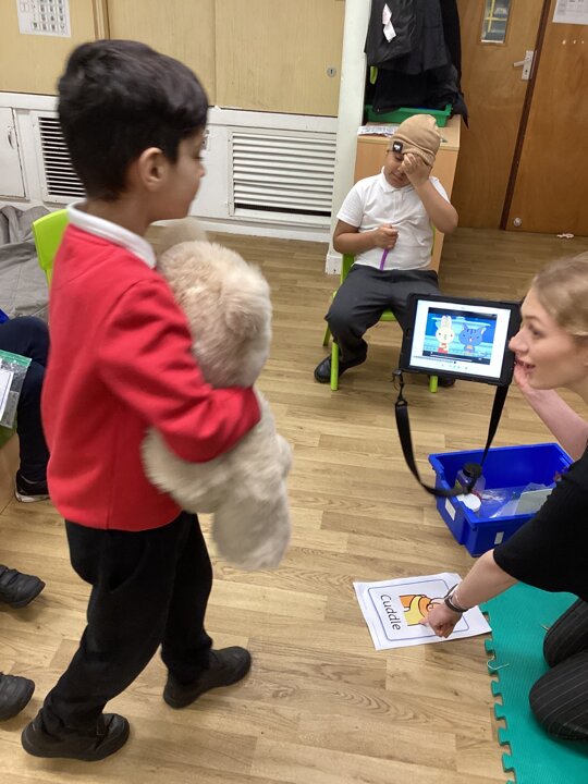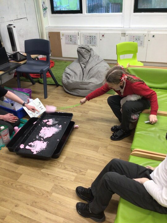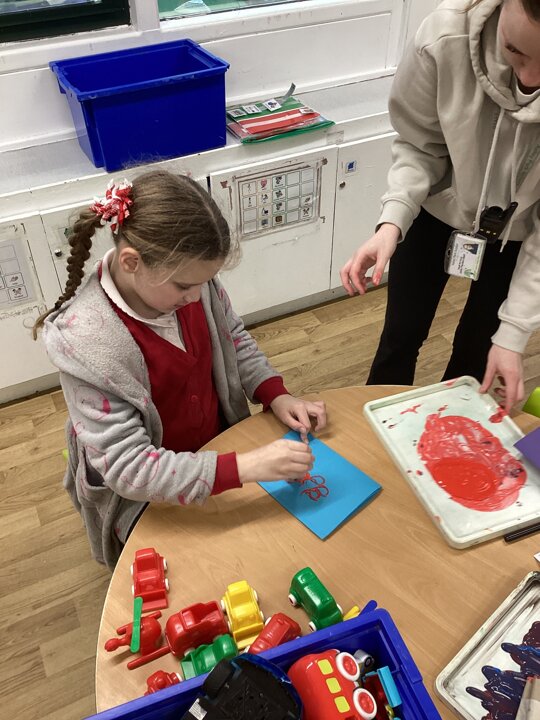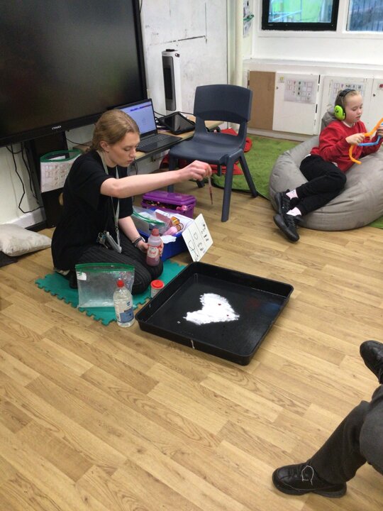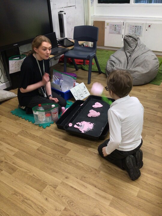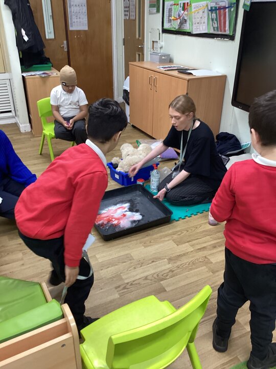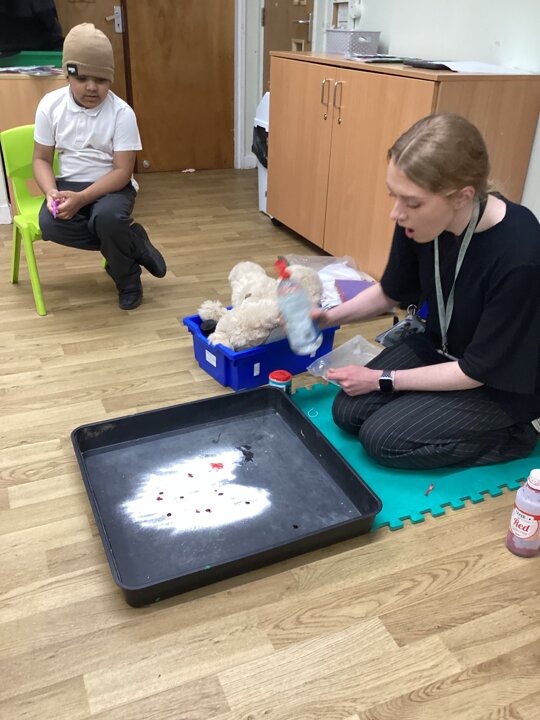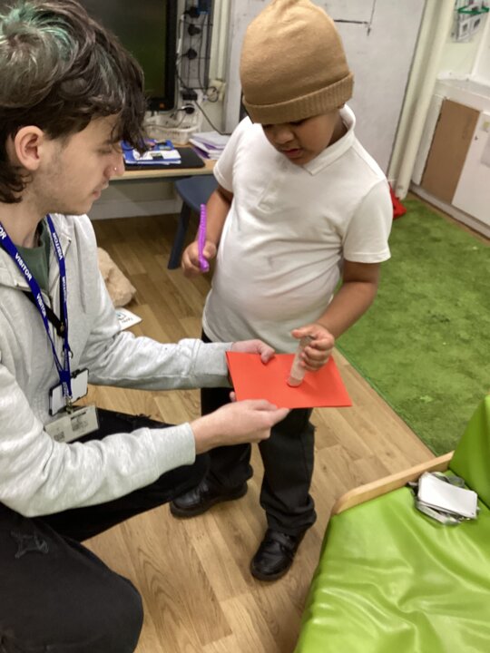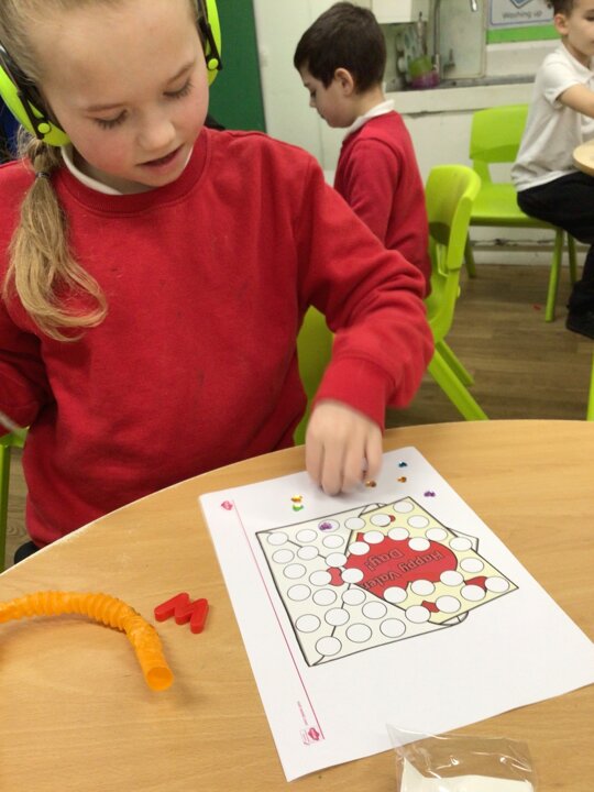 This week in Chestnut class, we have been exploring the theme Valentines. During our number attention autism, we watched carefully the confetti popper, bubbles and heart balloon during stage 1, labelling items ‘big’ and ‘small’. During stage 2, we watched Miss Seddon make a fizzy heart with red colouring and vinegar. We watched and listened to it fizz! For stage 3, we joined in with our friends and sang the skidamarink song, taking it in turns to hug the teddy bear. For some of us, stage 3 was adapted to suit our understanding better, and so we had a turn at splatting pink foam hearts. During stage 4, we each decorated our own valentines cards for our families by printing love hearts from paint and also practicing writing our own names.