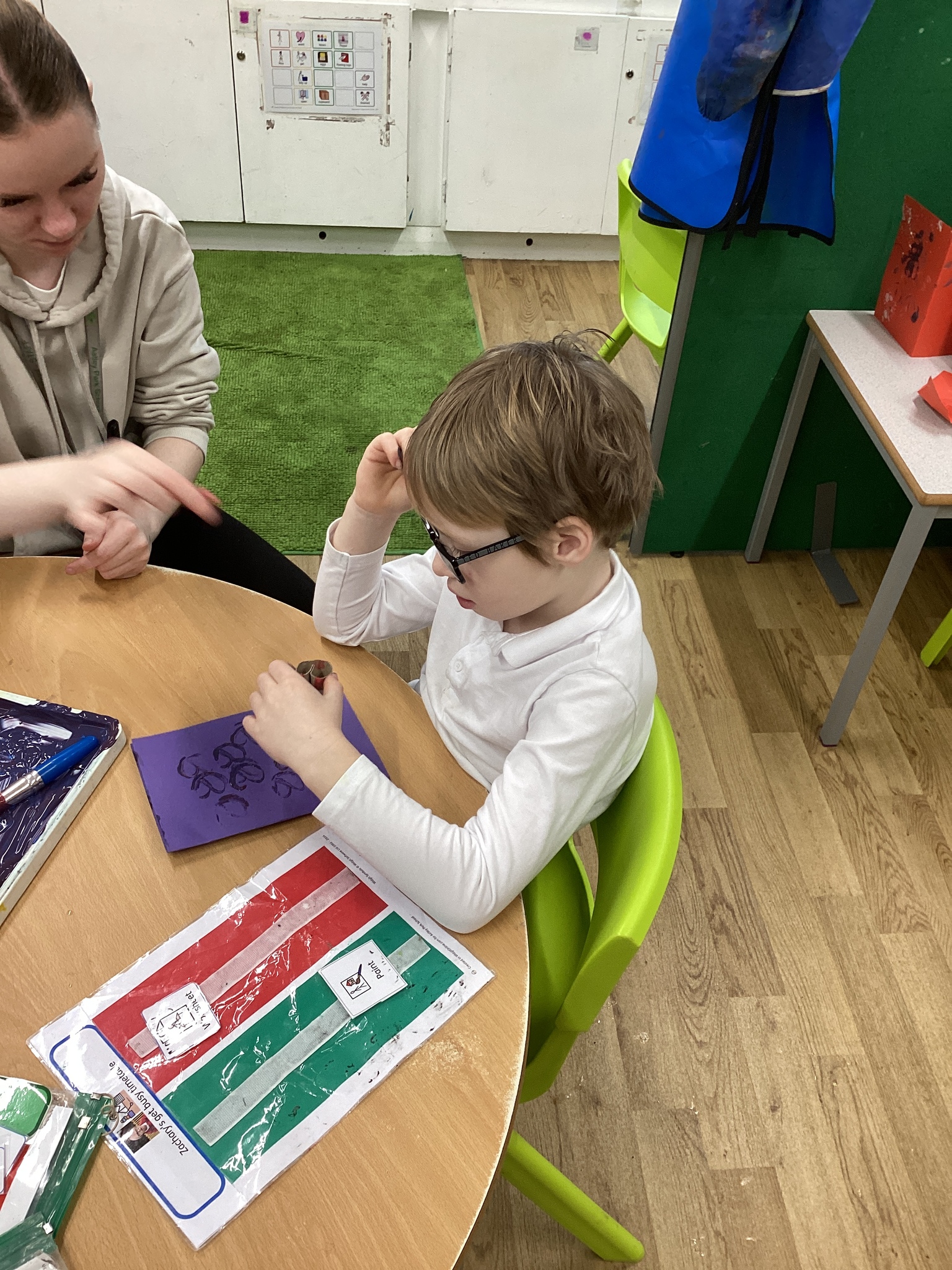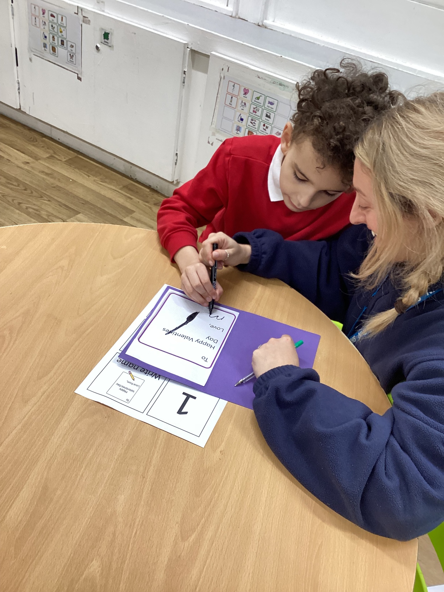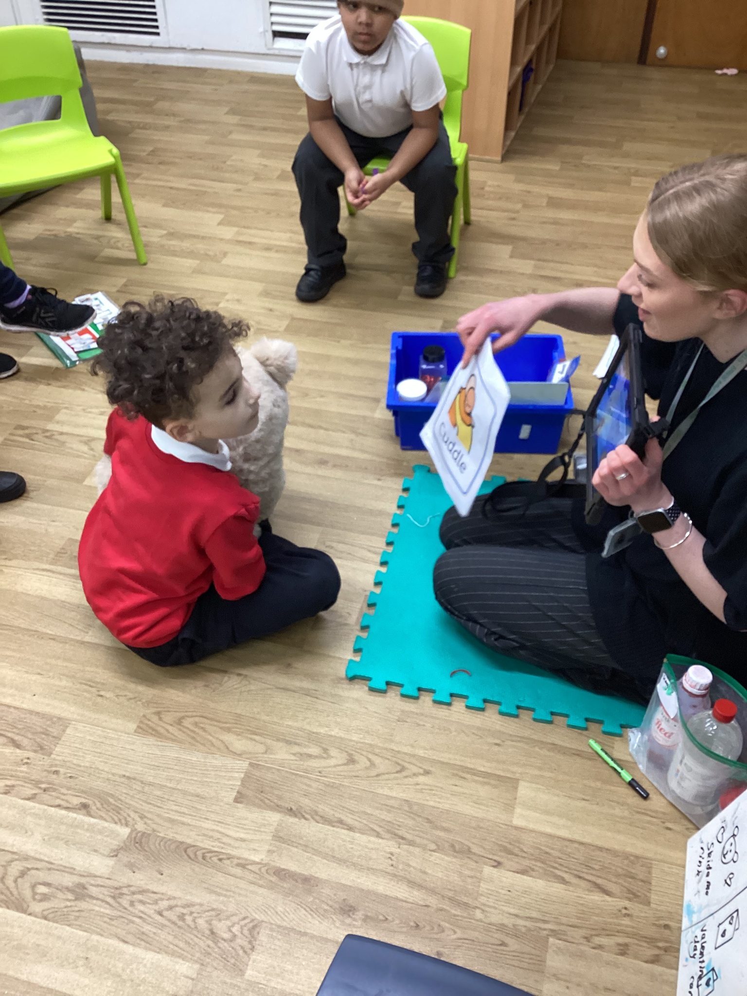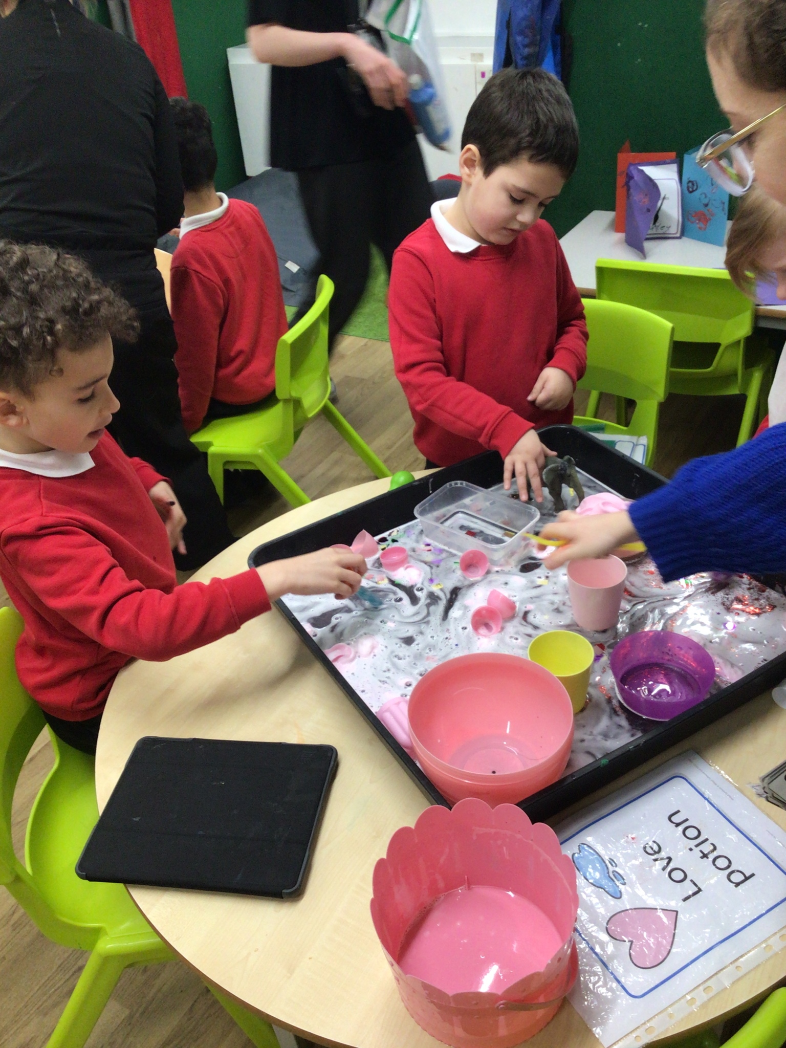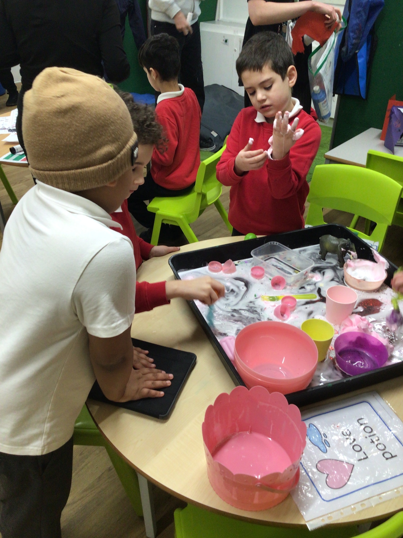 This week in Chestnut class, we have been exploring the theme Valentines. During our number attention autism, we watched carefully the confetti popper, bubbles and heart balloon during stage 1, labelling items ‘big’ and ‘small’. During stage 2, we watched Miss Seddon make a fizzy heart with red colouring and vinegar. We watched and listened to it fizz! For stage 3, we joined in with our friends and sang the skidamarink song, taking it in turns to hug the teddy bear. For some of us, stage 3 was adapted to suit our understanding better, and so we had a turn at splatting pink foam hearts. During stage 4, we each decorated our own valentines cards for our families by printing love hearts from paint and also practicing writing our own names.