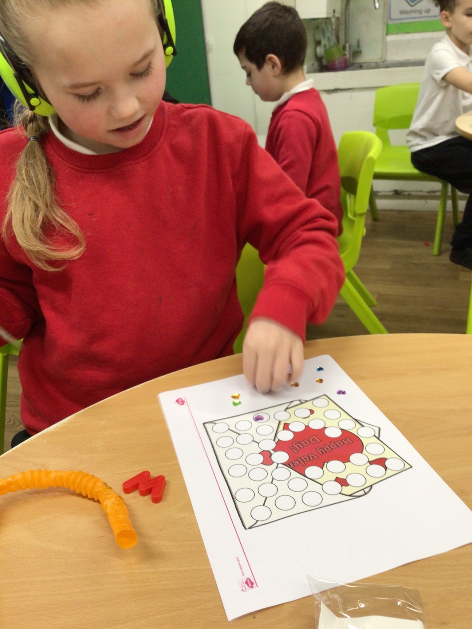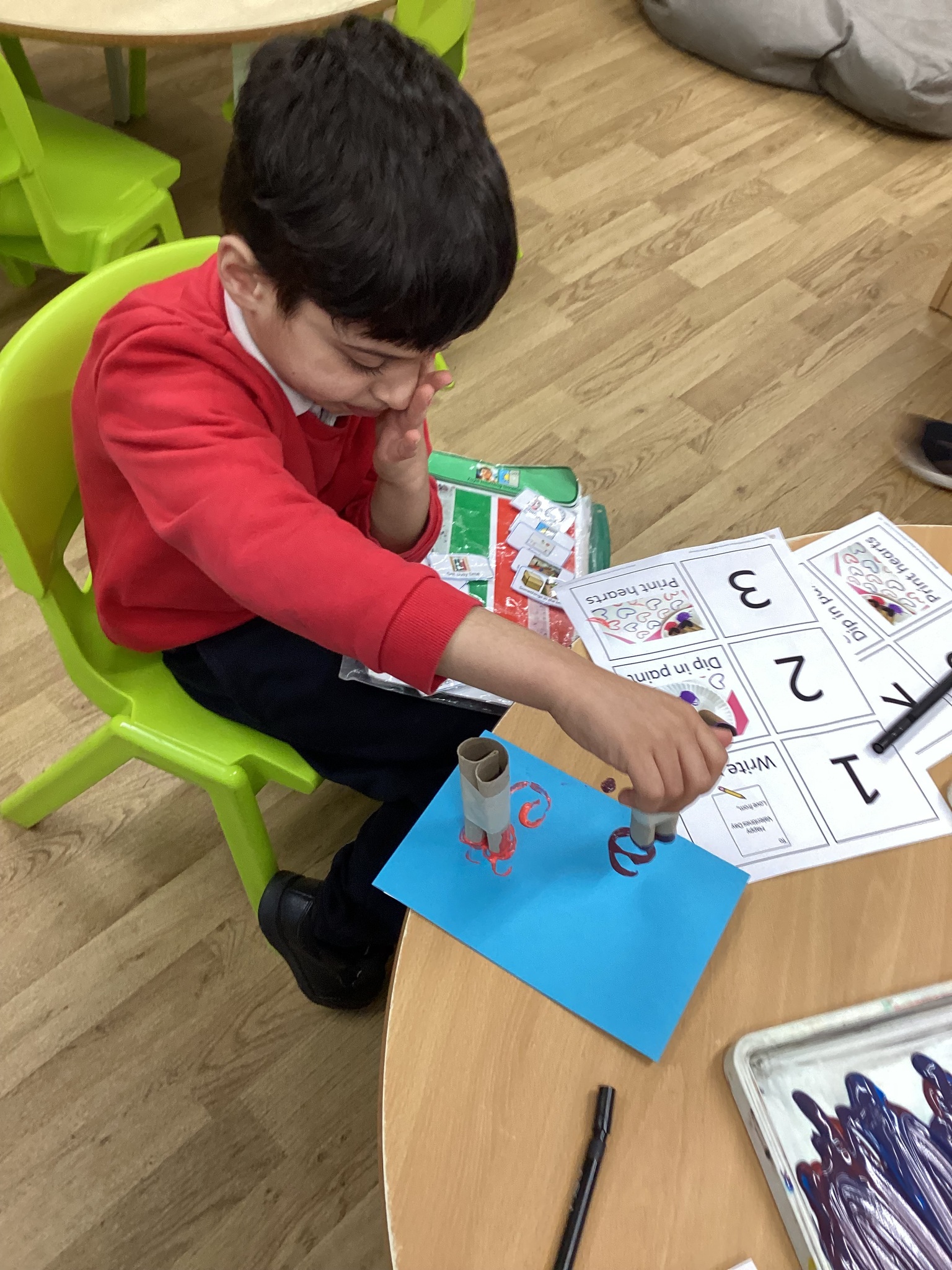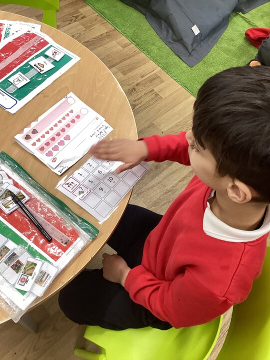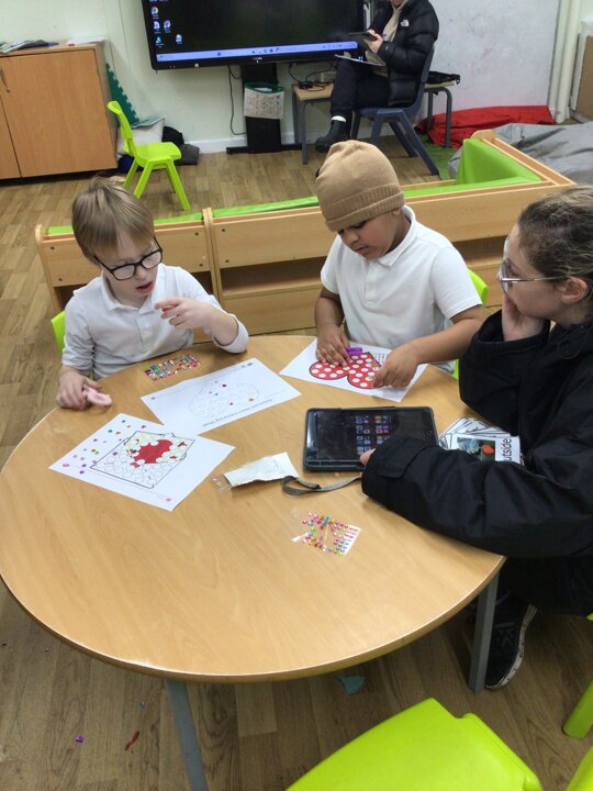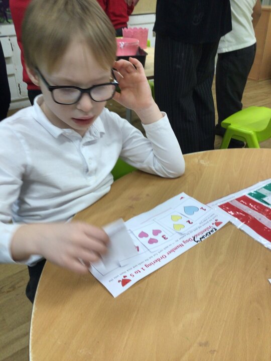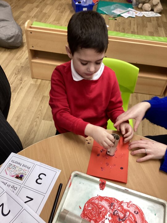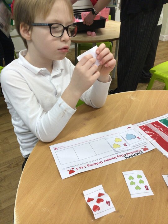 When following our get busy timetables, we have been practicing putting numbers 1-5 in the correct order, adding, subtracting and then counting ‘how many now?’. During choose time and fine motor, there have also been lots of valentines themed activities such as exploring a messy pink potion, tissue paper sticking hearts, and decorating heart pictures with gem stickers. Mrs Whittle made a Valentines themed workstation where we filled in the missing numbers, writing them in the hearts and used our creativity skills to colour in and decorate our own heart pictures.