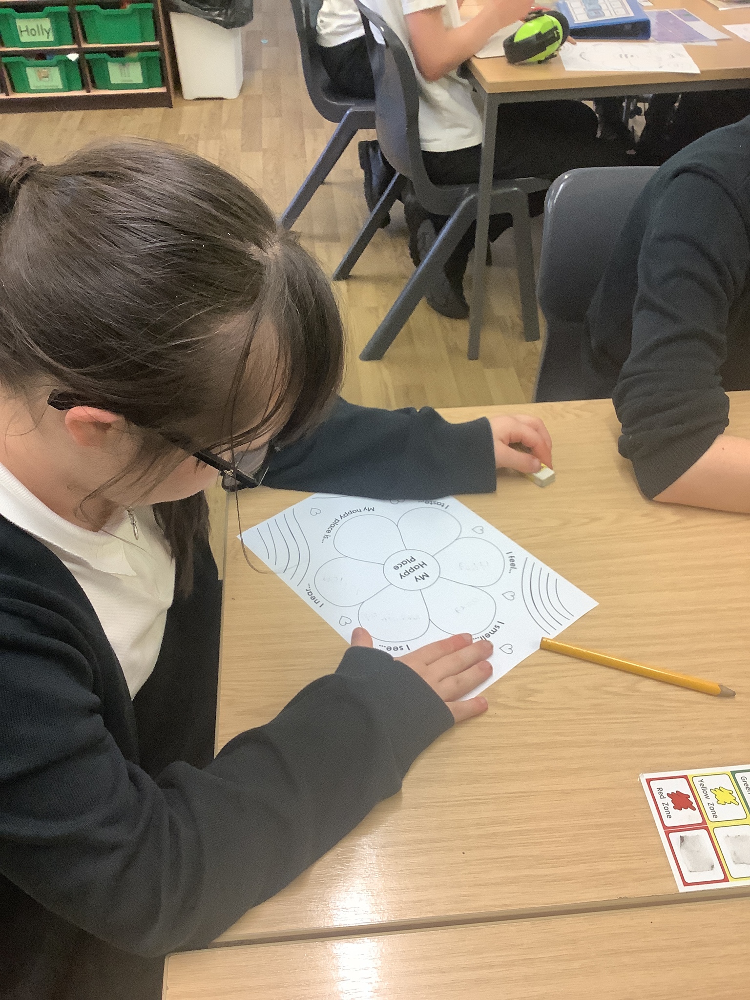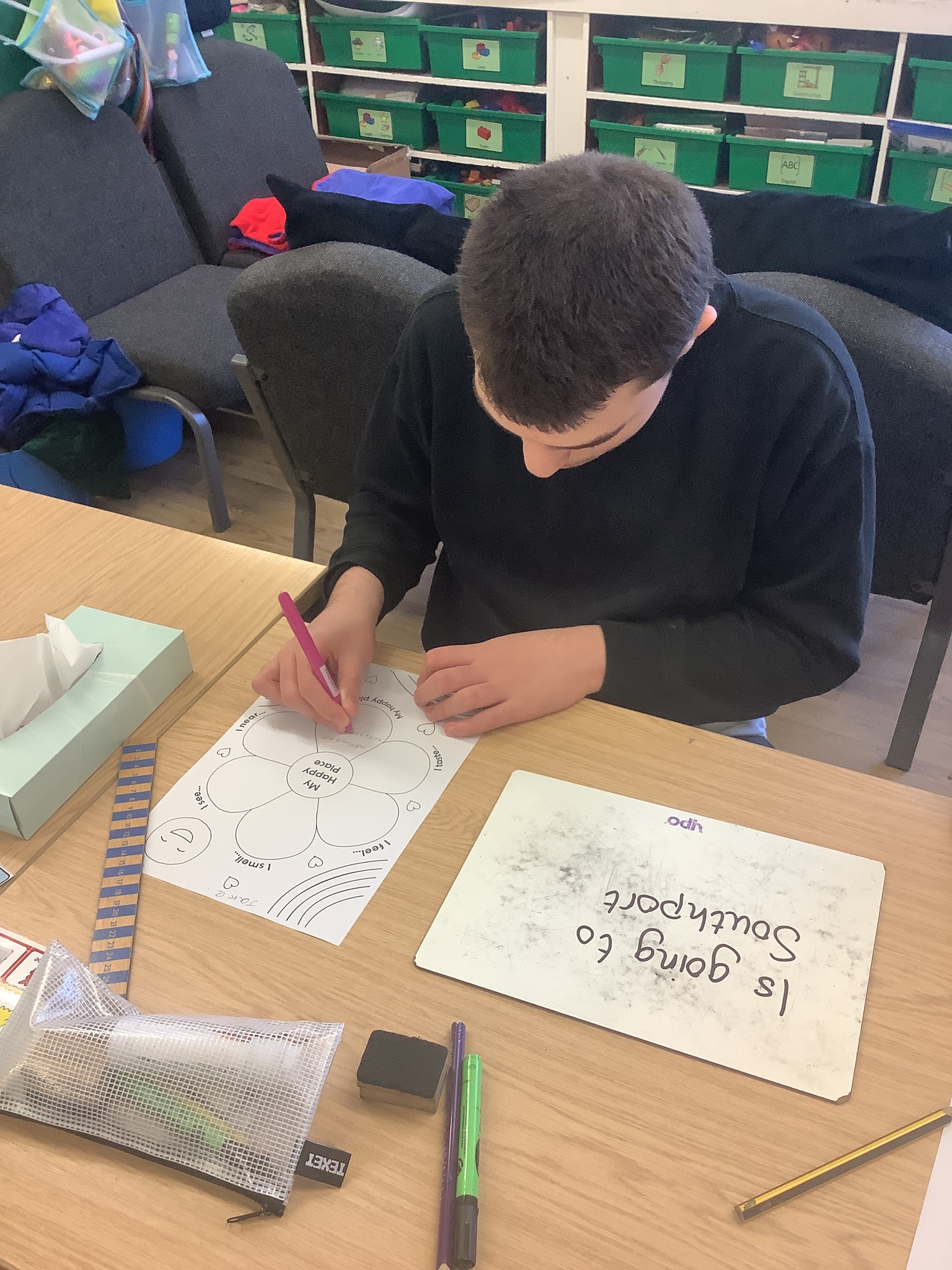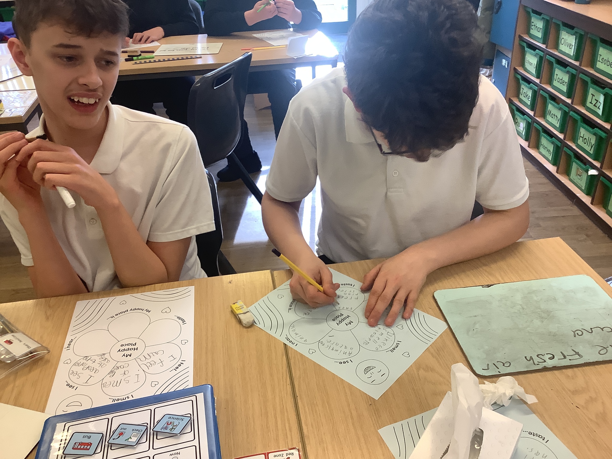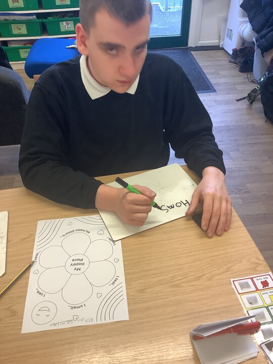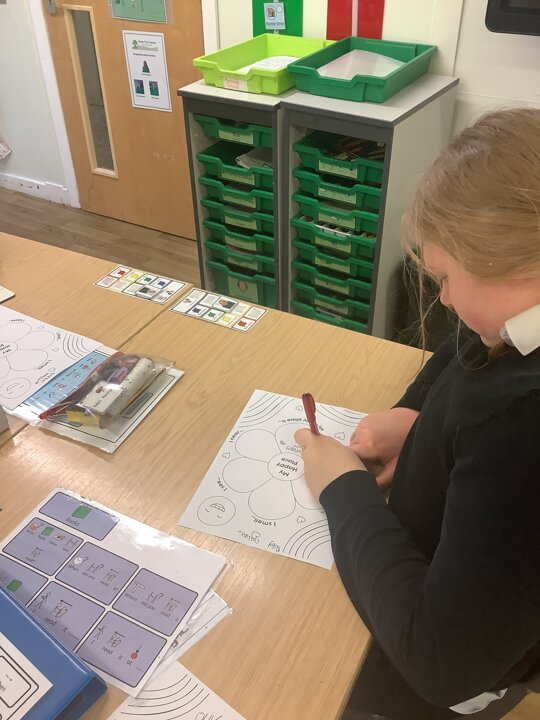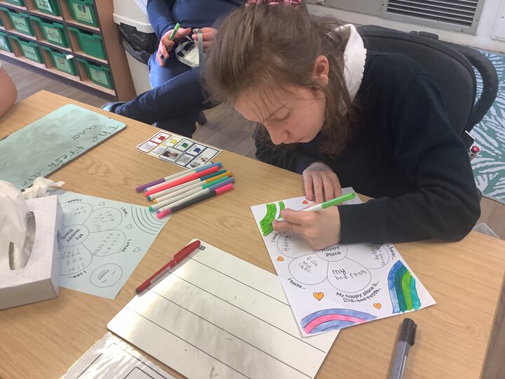 In class, one of our whole class activity was to think of our happy place. The learners listed their happy smells, taste, how they feel, what they like to hear and see. The learners happy places were home, caravan, school, bedrooms and the pub!After they had filled in their work sheet, the learners coloured the worksheet in bright colours.