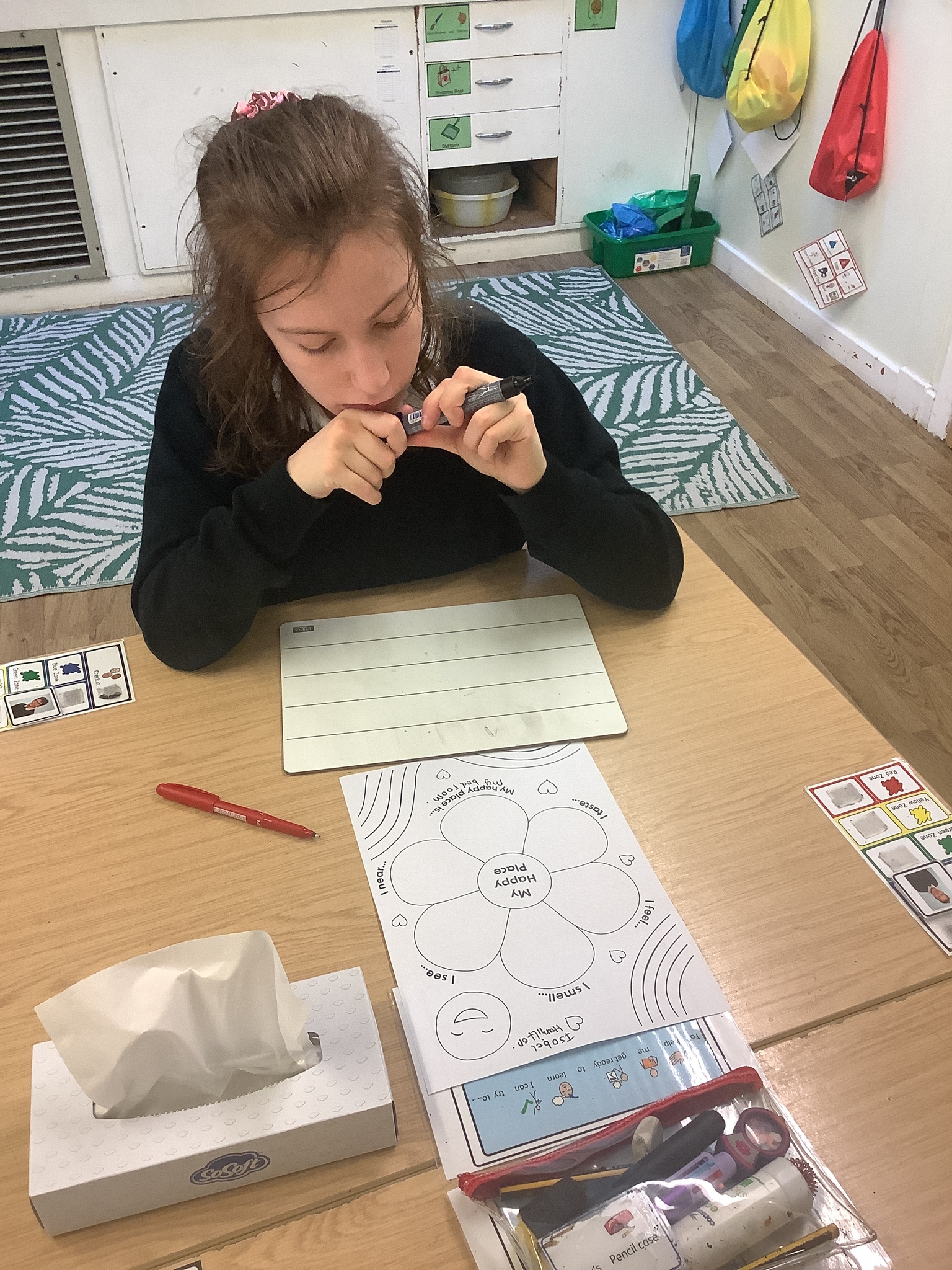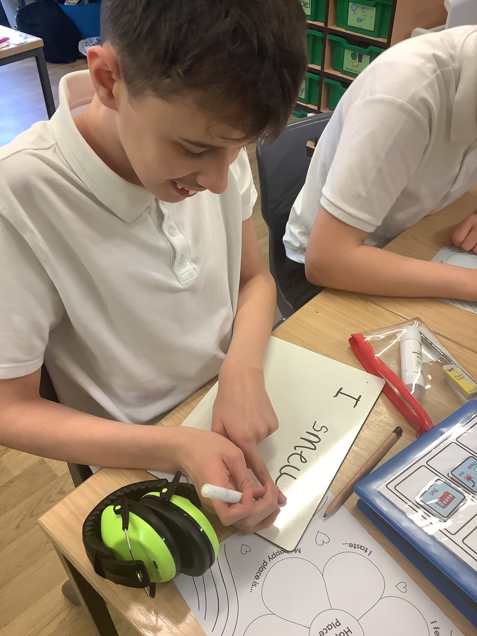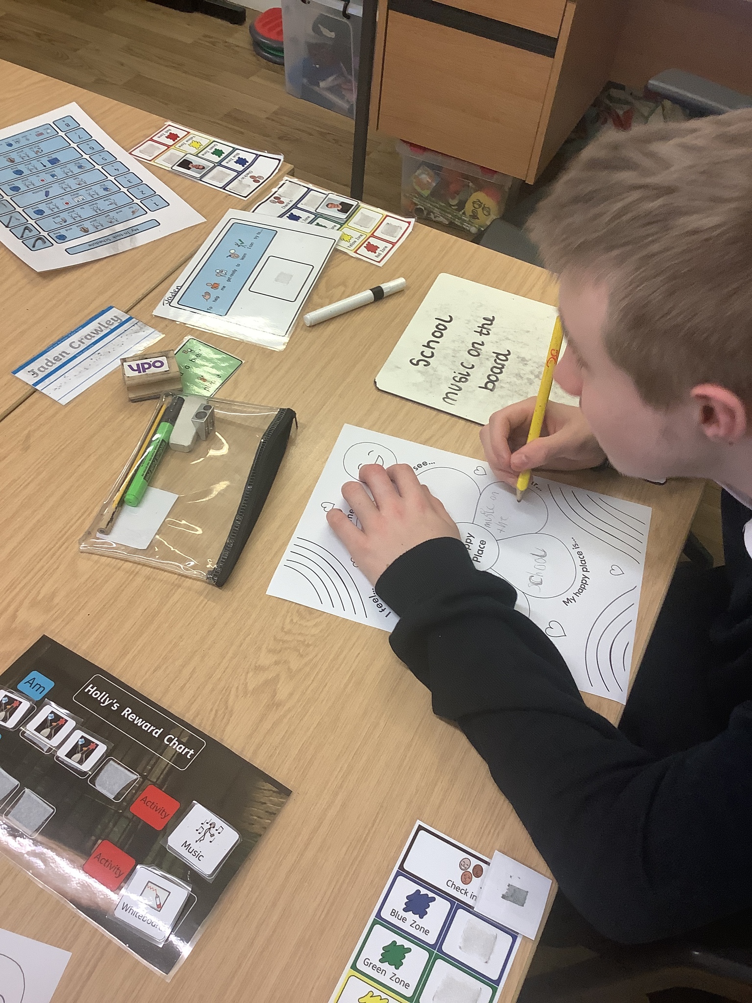 In class, one of our whole class activity was to think of our happy place. The learners listed their happy smells, taste, how they feel, what they like to hear and see. The learners happy places were home, caravan, school, bedrooms and the pub!After they had filled in their work sheet, the learners coloured the worksheet in bright colours.