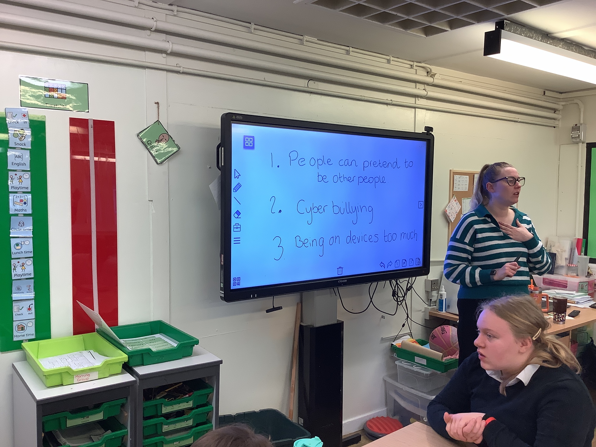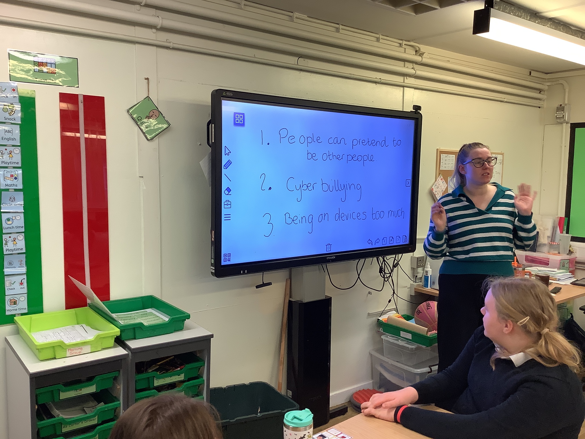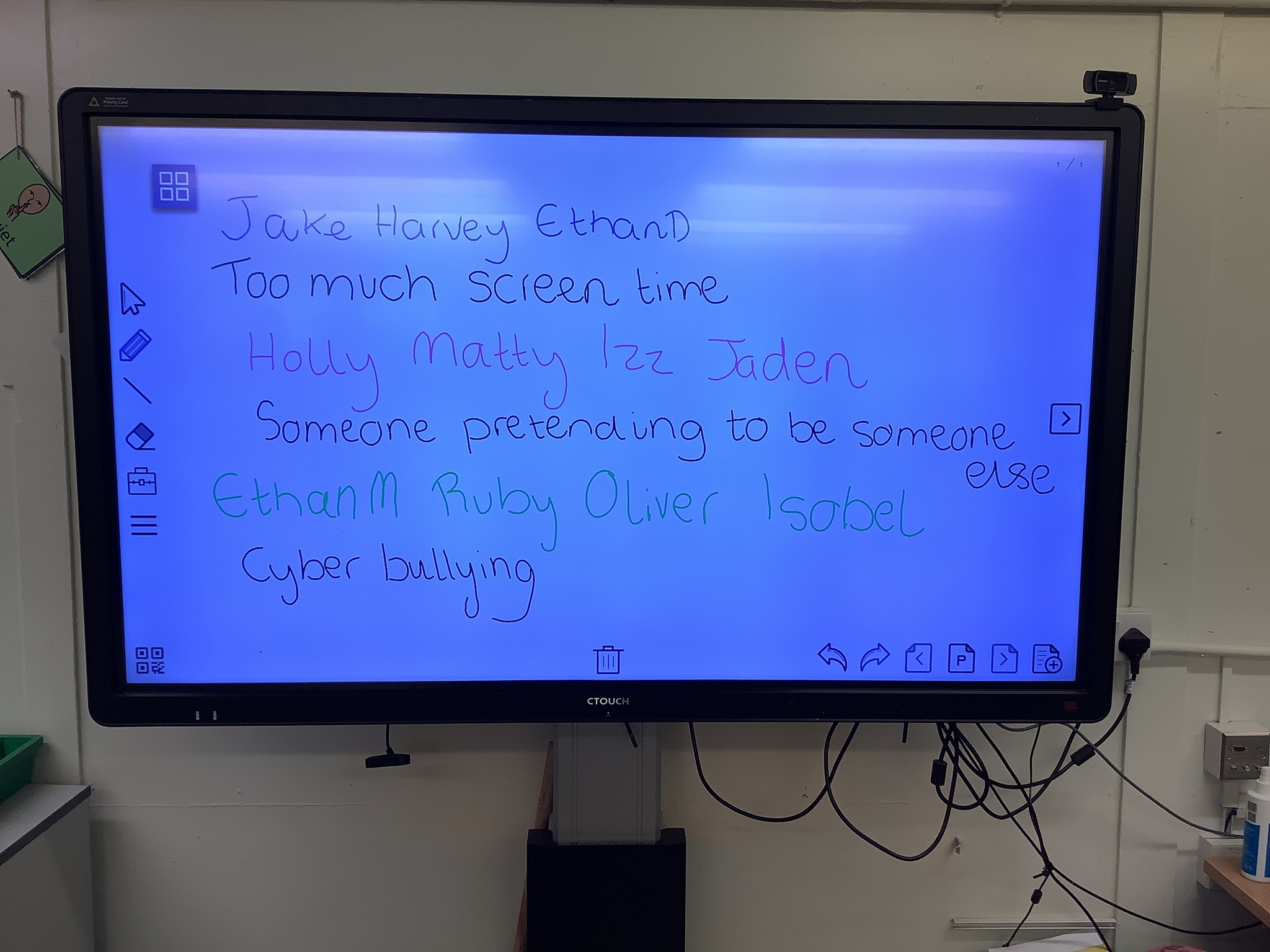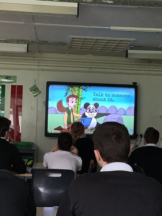 After this, we looked at being safe on the internet. Miss Hendy put on a cartoon PowerPoint that showed different animals being on the internet. It explained different scenarios of Internet use and how to keep safe by telling a trusted adult if they feel something isn’t right when on the internet. After this, Miss Hendy put the class into three groups. Each group created a Puppet Pals video on three different scenarios of keeping safe on the internet. The three scenarios were “Too much screen time”, “someone pretending to be someone else” and “Cyber bullying”. What great videos and voice overs everyone did.