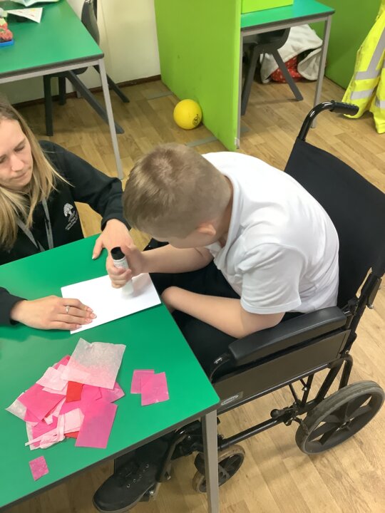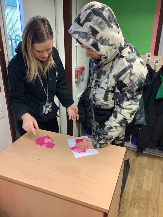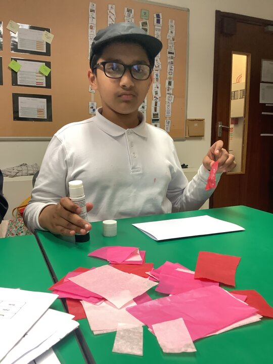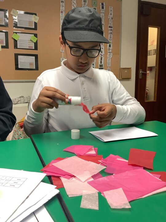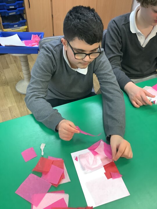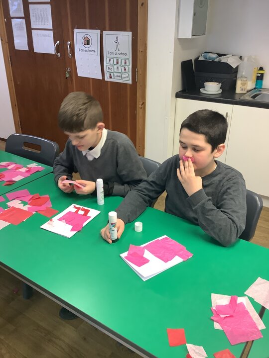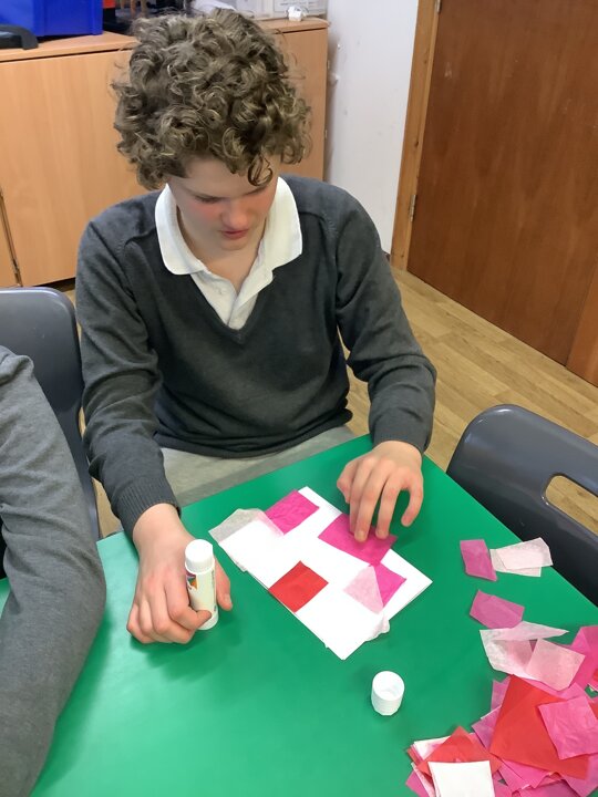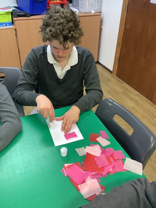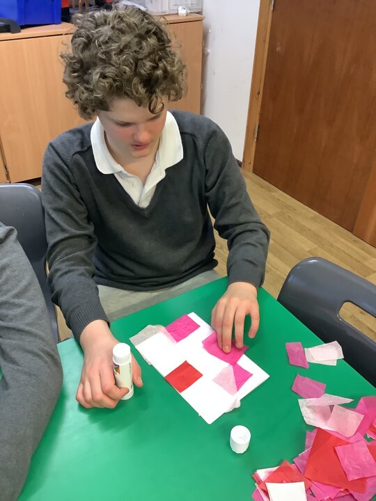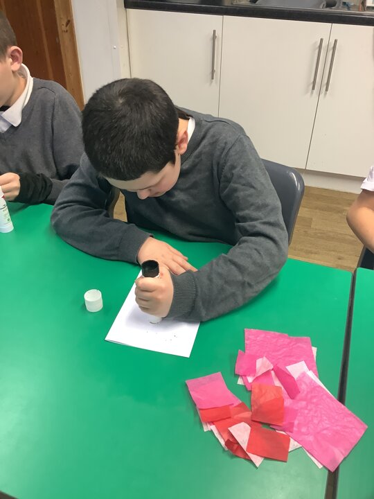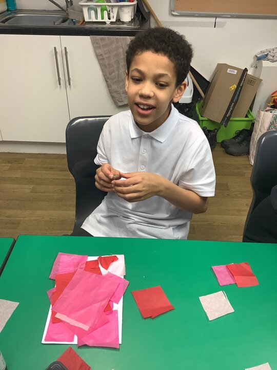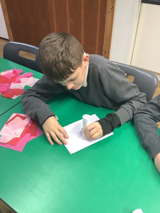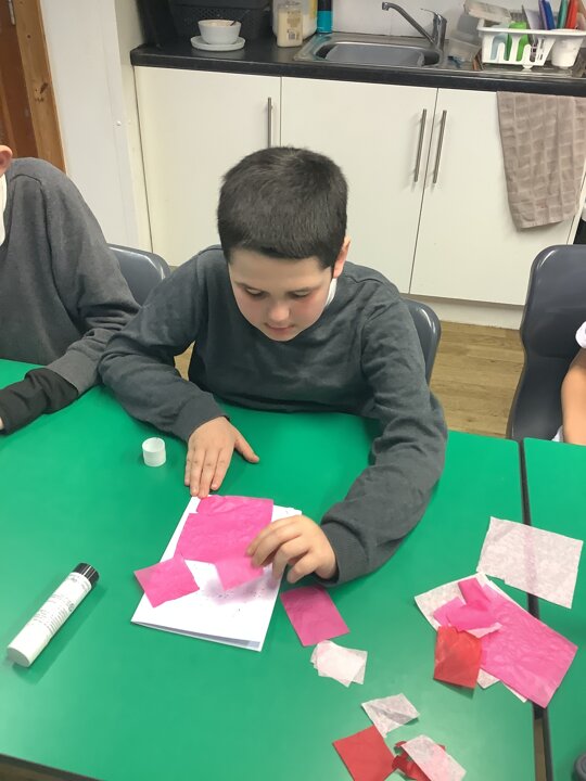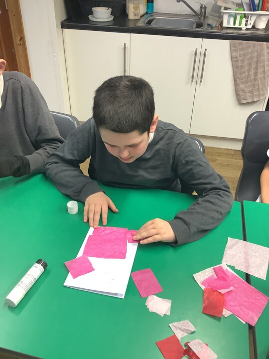 We spoke about Valentine’s Day, and who is special in our lives before settling down to make cards for those people. We took pieces of card, some glue and lots of tissue paper to create our cards before taking pictures of ourselves for the inside of the card. We wrote who our card was to and signed them as well.