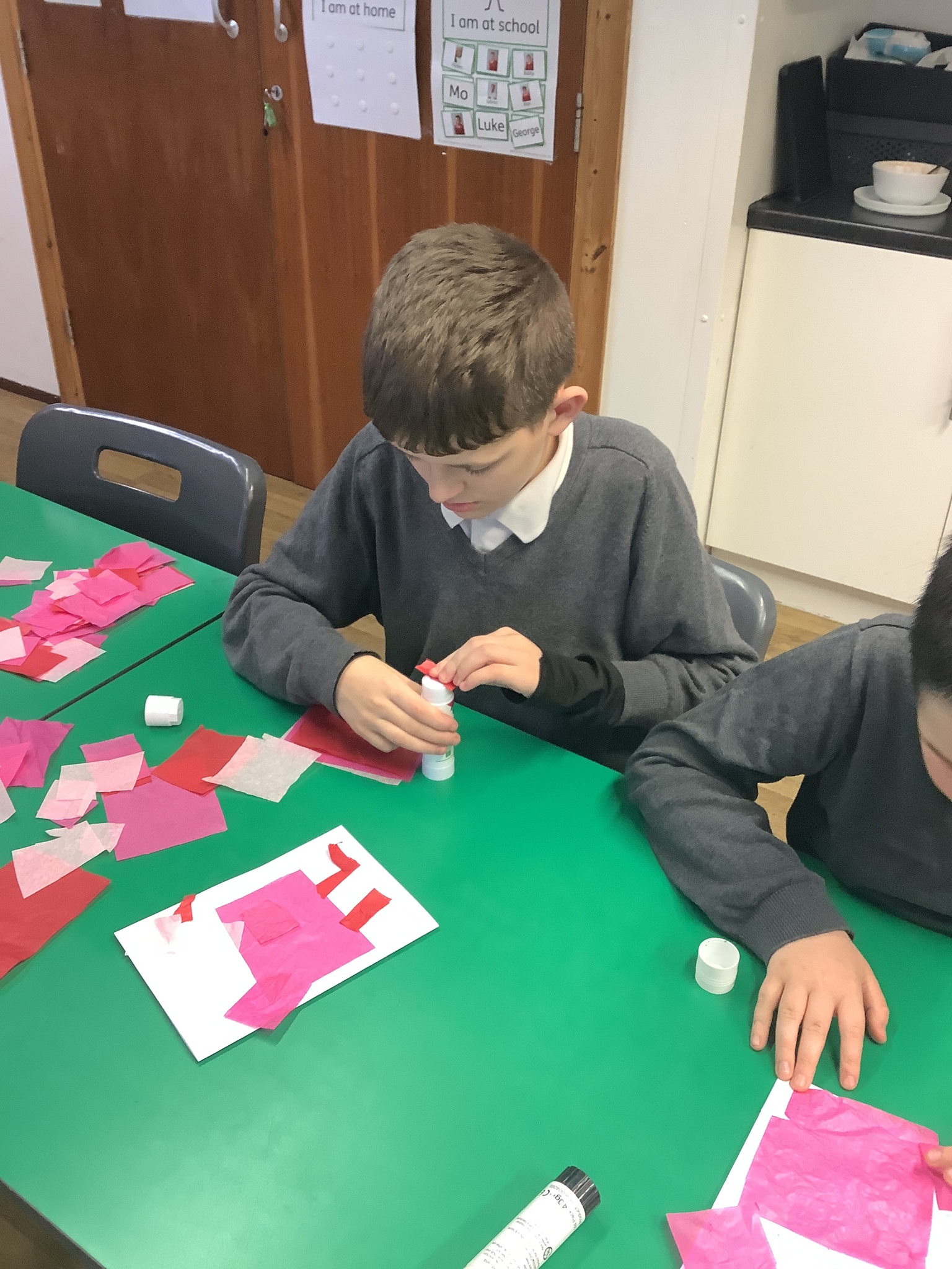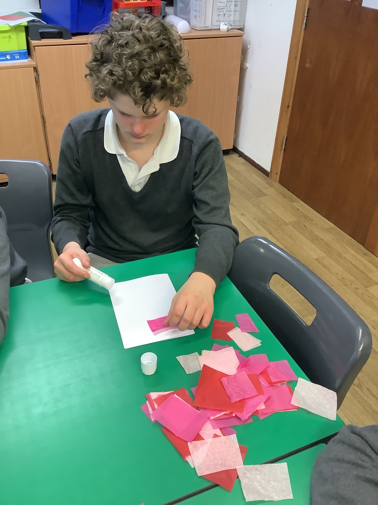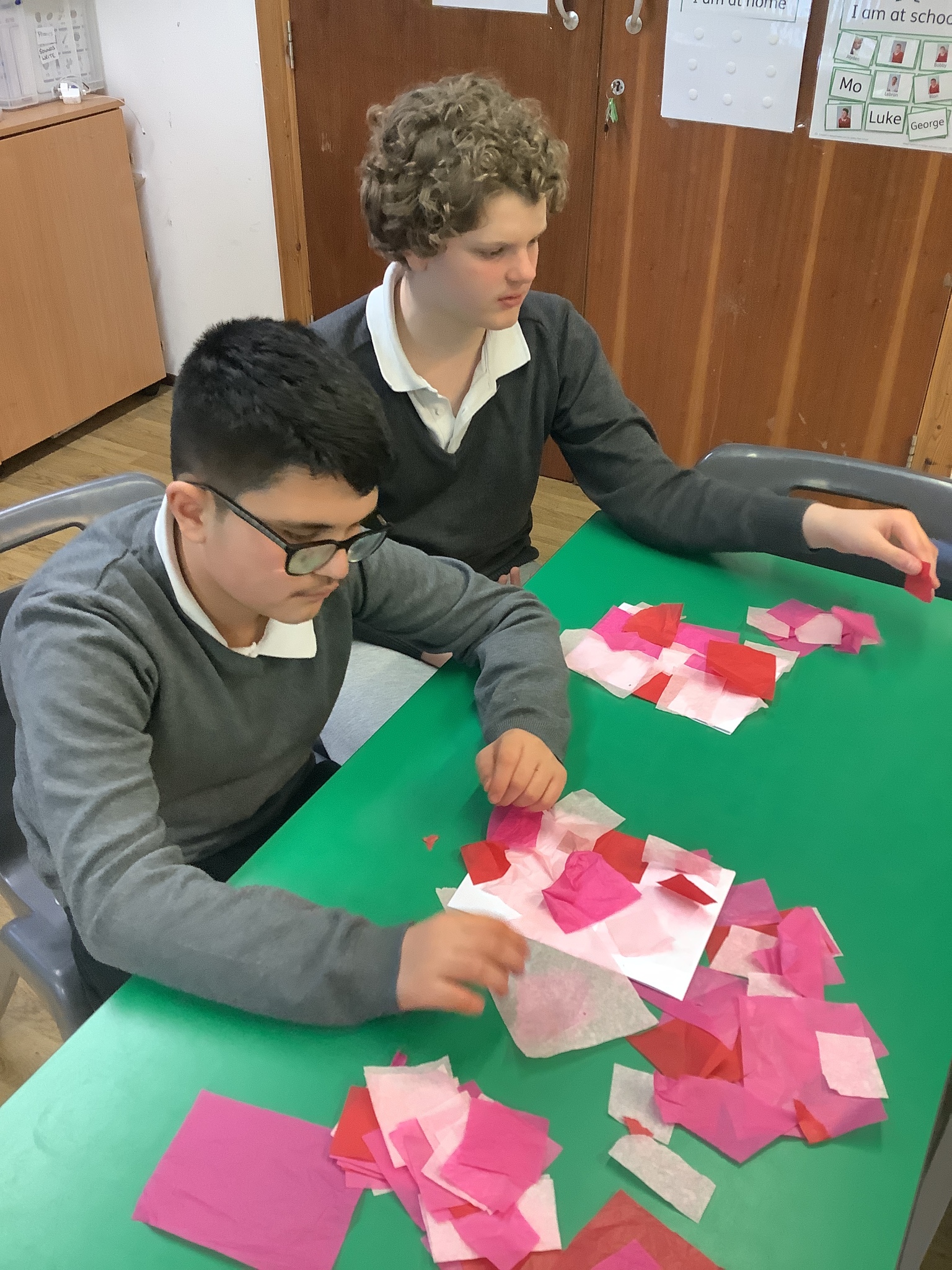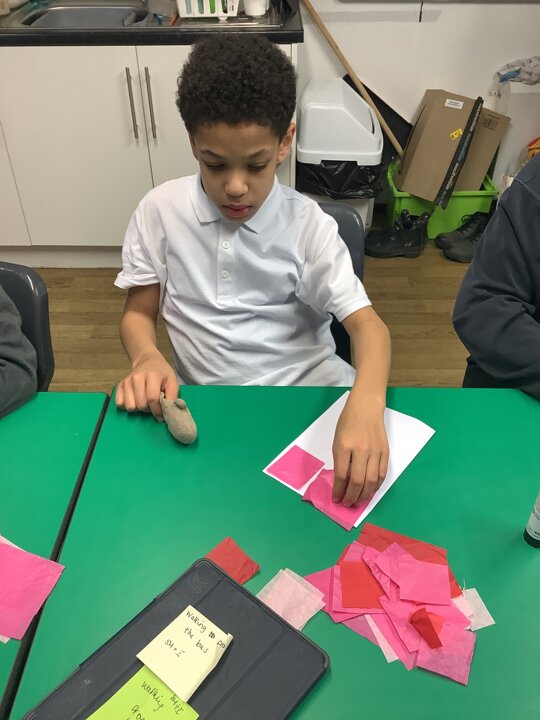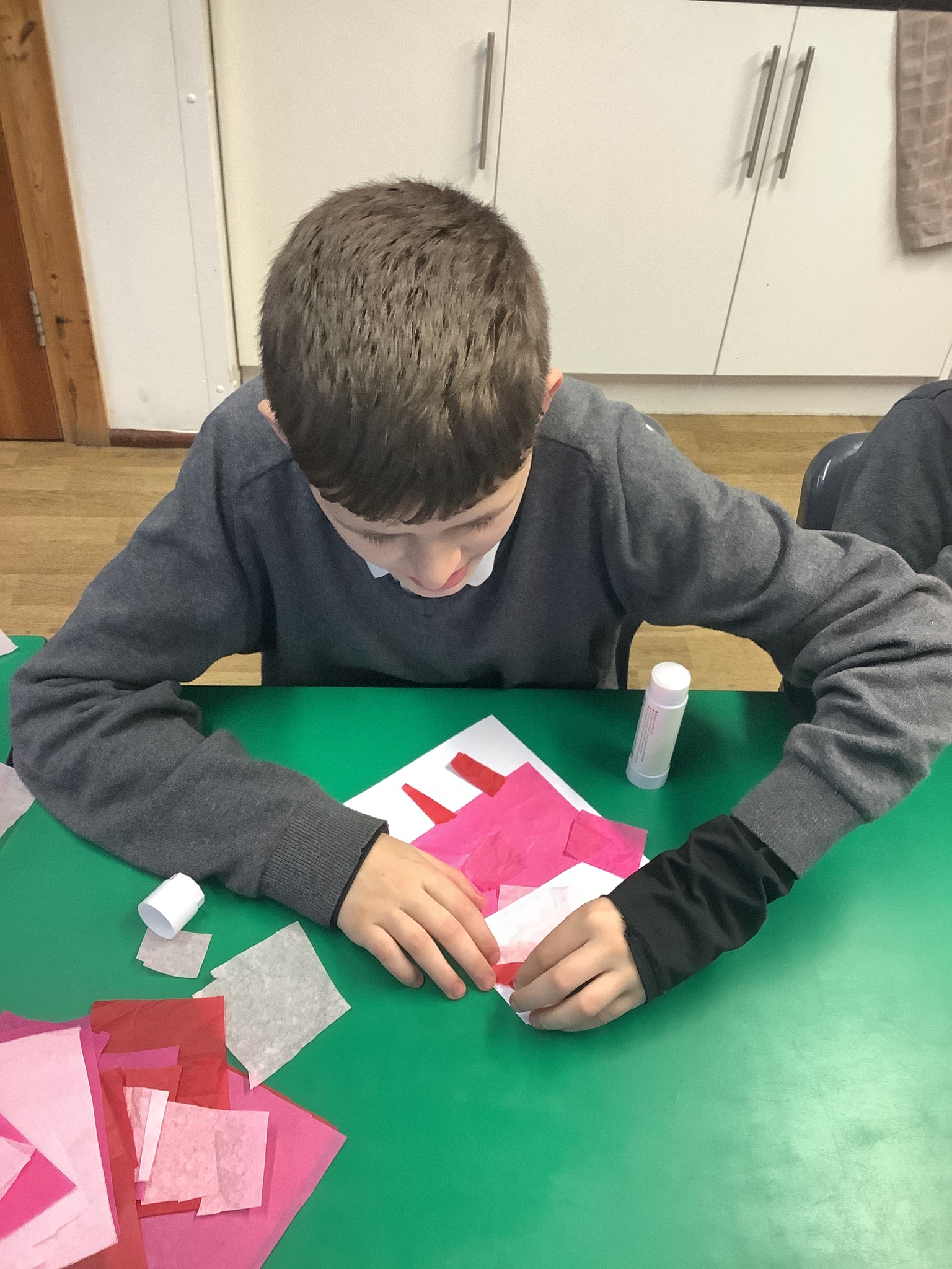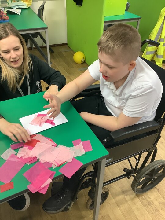 We spoke about Valentine’s Day, and who is special in our lives before settling down to make cards for those people. We took pieces of card, some glue and lots of tissue paper to create our cards before taking pictures of ourselves for the inside of the card. We wrote who our card was to and signed them as well.